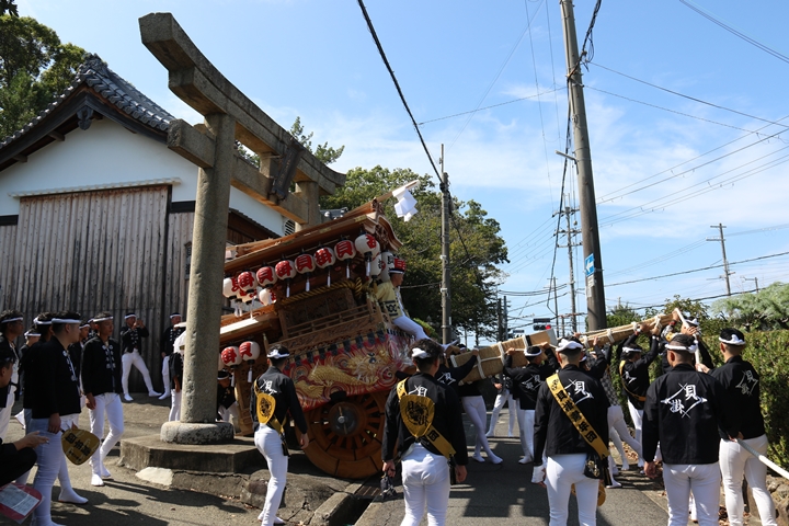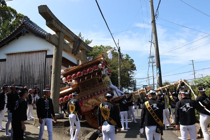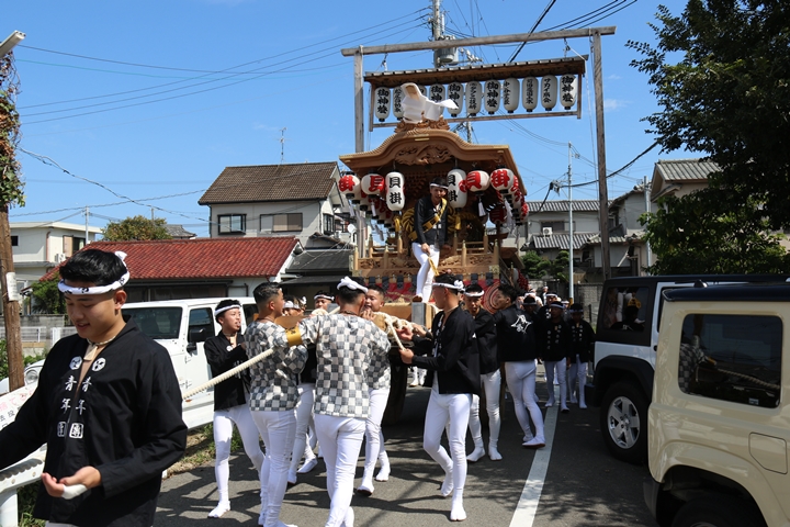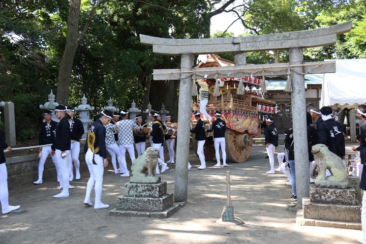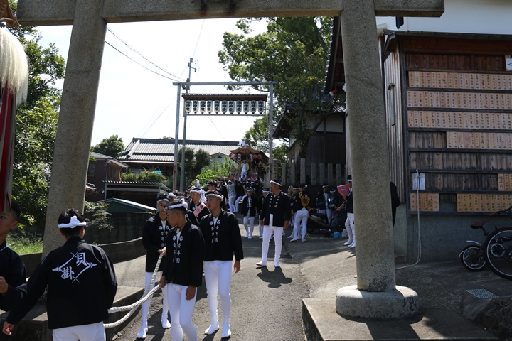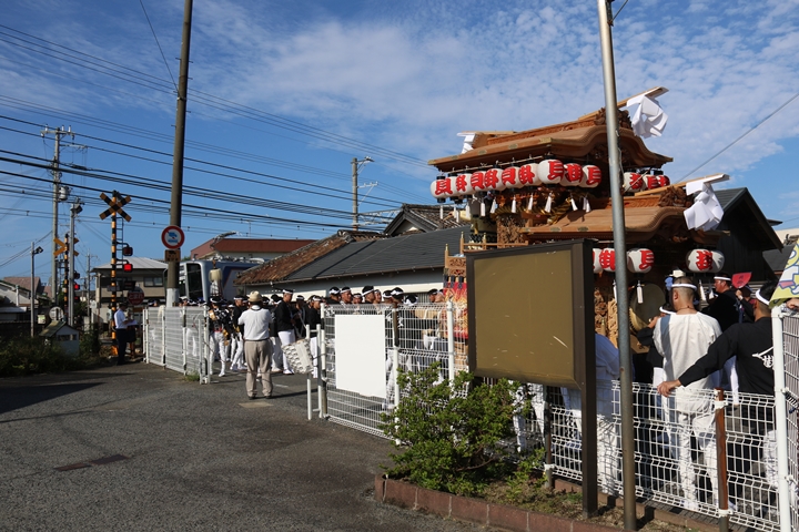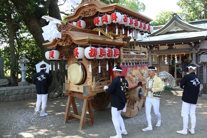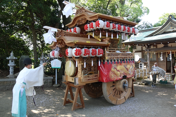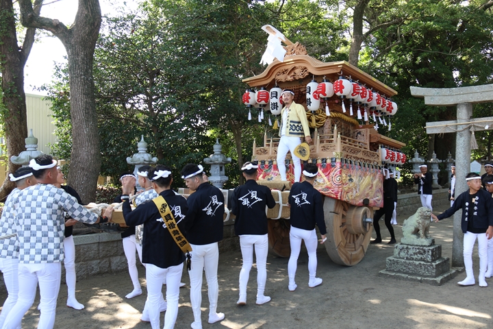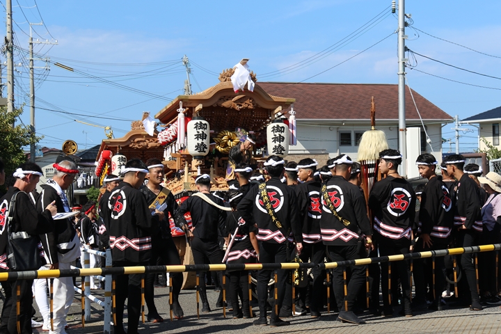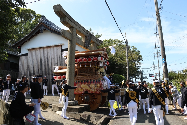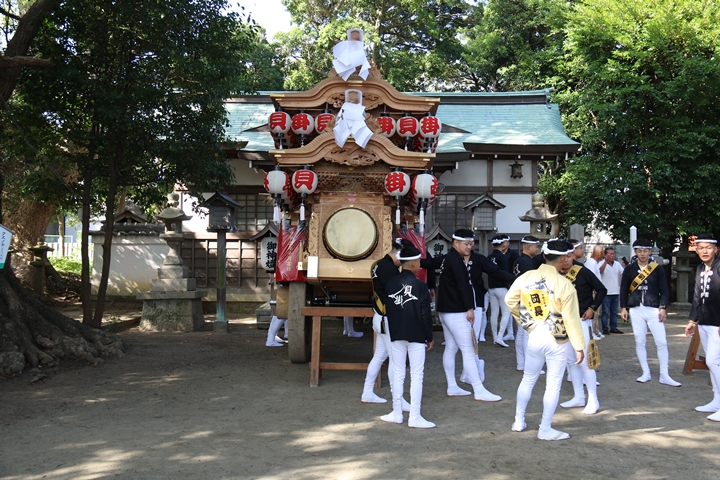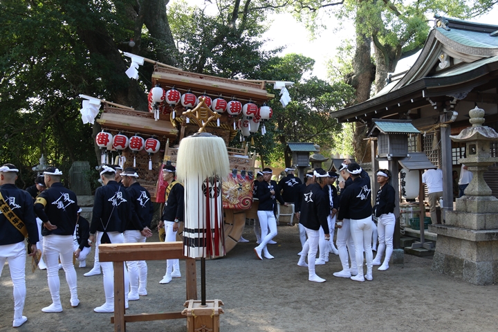 | いよいよ今日は阪南市やぐらパレードです。今朝は4時に勝手に目が覚める。朝食を終え何やかんやしてたら9時前になり急いで法被に着替え段取りをし9時に自宅を出、実家から徒歩で指出森神社へ。 |