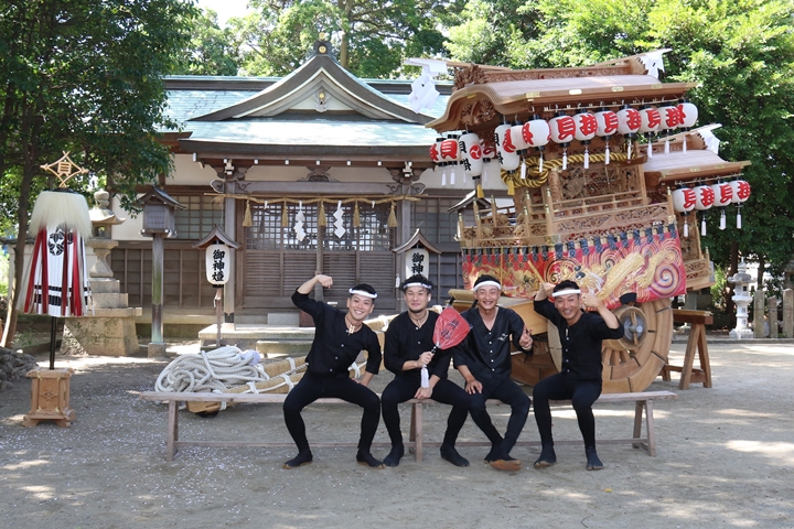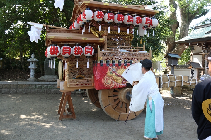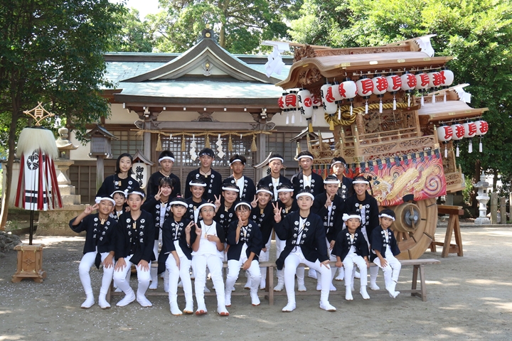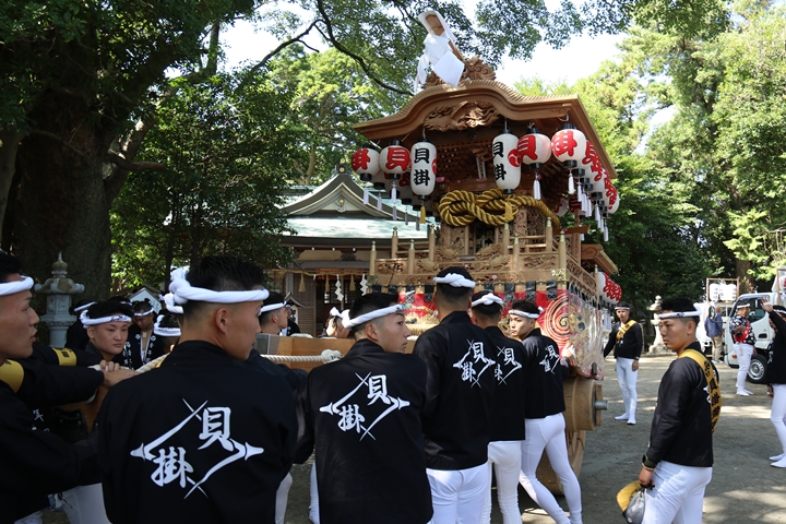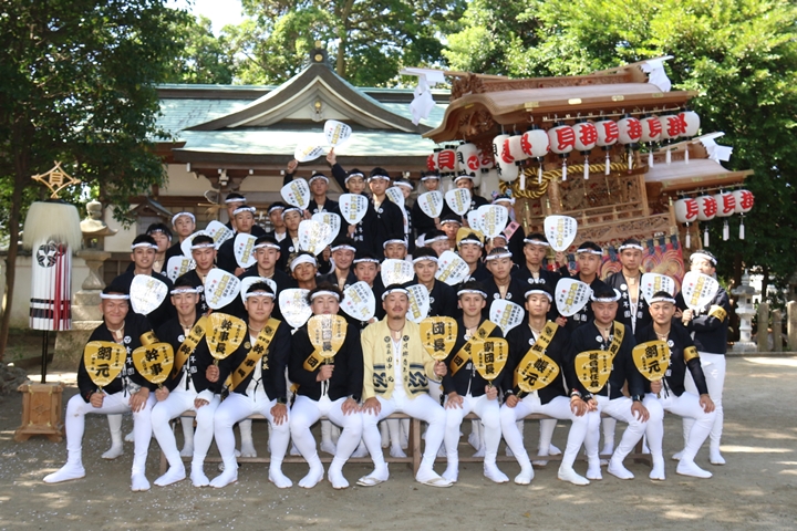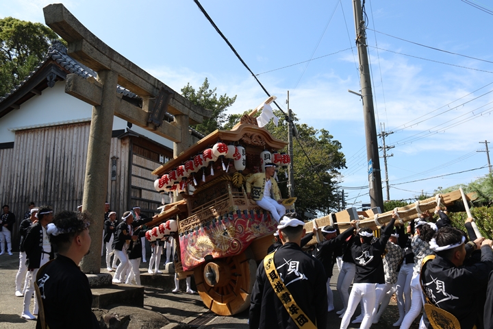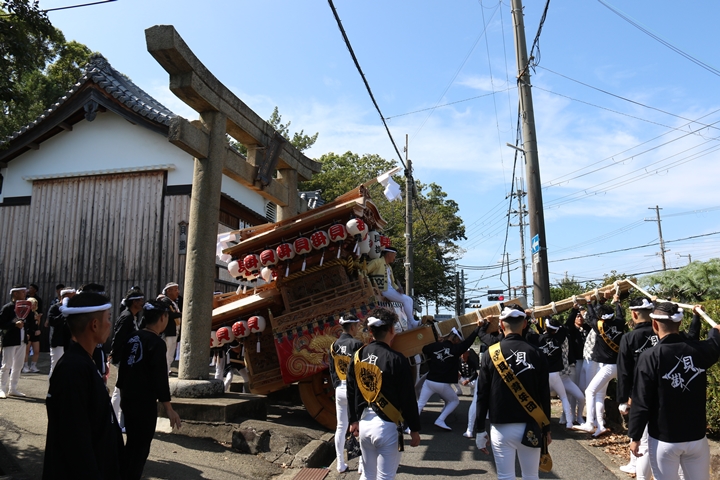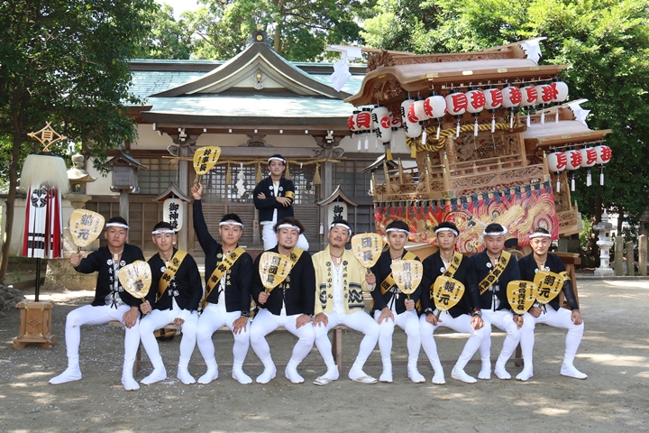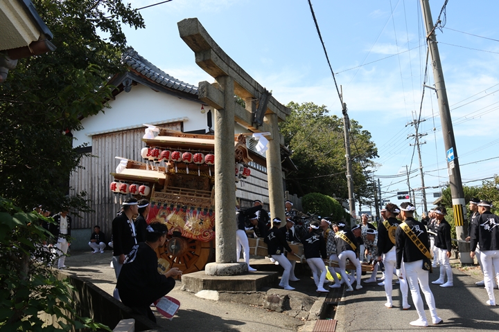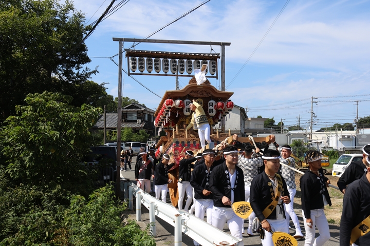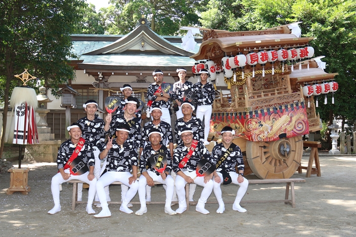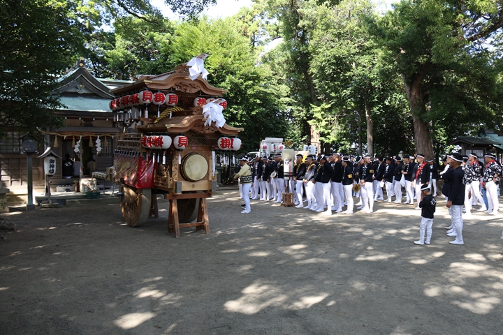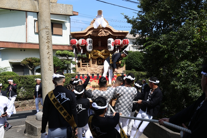 | いよいよ今日は阪南市やぐらパレードです。今朝は4時に勝手に目が覚める。朝食を終え何やかんやしてたら9時前になり急いで法被に着替え段取りをし9時に自宅を出、実家から徒歩で指出森神社へ。 |