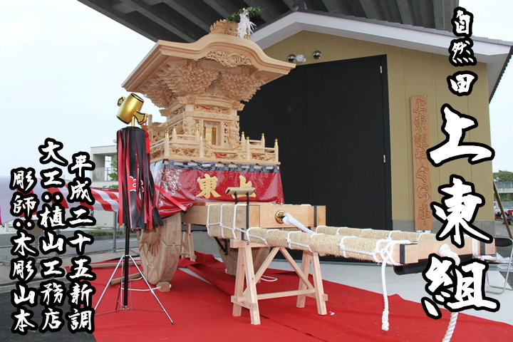 | ● 自然田上東組 (じねんだかみひがしぐみ・東鳥取五地区) ・新調:平成25年 (同年7月28日入魂式) ・大工:植山工務店 ・彫師:木彫 山本 ・本幕:川島織物セルコン ・太鼓:浅野太鼓楽器店 ・宮入:波太神社 ◎ 地名「自然田」の由来 自然田の地名の由来は小川,山中川などの流域地域であり、自然に田ができたので自然田と銘々されました。謡曲で知られる自然居士の出生地でもあります。その自然田は安政6年/1859年頃は上出,寺脇,東,南,芝の5つに分かれやぐらも5台ありましたが集約されて上出(上出,寺脇−今の自然田上組)、中之場(東,南−今の自然田東組)、 芝出(芝−今の自然田上東組)の3台になりました。 ◎ 先々代のやぐら 先々代のやぐらは大正7年頃に信達楠畑に売却されました。 ◎ 先代のやぐら 先代のやぐらは大正8年に山中渓の大工:米澤清五郎師(一説では大苗代の大寅と言う説もあり)、彫師:西本舟山師によって新調されました。平成24年10月21日に波太神社にて昇魂式を実施、平成25年7月21日日曜日に岩出市内のホームセンターに搬出された後、現在は能登地方に保管されています。 ◎ 現在のやぐら 平成22年1月23日土曜日に自然橋交差点にて原木祭を実施、平成25年に大工:植山工務店、彫師:木彫山本によって新調、同年7月28日日曜日に波太神社にて入魂式を挙行しました。また提灯は白地に赤の文字で「上東」という文字です。 ◎ 彫物図柄解説 【大屋根廻り】 ・鬼板 − 獅噛み ・箱棟 − 龍 ・懸魚 − 正面:朱雀、 後面:玄武 ・車板 − 正面:天湯河板挙命 奥宮に角凝命を奉祀す 【社傳波太宮由来記】、 後面:菟砥川洗濯の場 ・桁鼻 − 正面:息、 後面:麒麟 ・小屋虹梁 − 正面:金型に雲、 後面:金型に流水 ・飛檐垂木 − 波太神社御神紋 【九枚笹紋・左頭三つ巴紋】 ・地垂木 − 飛龍 ・隅出 − 迦陵頻迦 【瑞寶寺本堂欄間より】 ・枡組 − 尾垂木:龍,松竹梅,菊,雲,波、 肘木:獏,獅子,牡丹,カイチ 【四手先八段】 ・枡合天井 − 正面:金木犀、 後面:山女 ・二重枡合 − 右面:青龍、 左面:白虎 ・枡合 − 正面:瑞寶寺圓牛 八幡御正体寄進 【波太神社旧御神体裏書より】、 右面:神功皇后 応神天皇平産す 【波太神社祭神】、 左面:素戔嗚尊 八岐大蛇退治 【自然田平見牛神社(鳥取神社合祀)】、 後面:天湯河板挙命 出雲國で鵠を捕える 【波太神社祭神】 ・横槌 − 正面:松竹梅、 右面:牡丹,獅子、 左面:牡丹,獅子、 後面:松竹梅 ・木鼻 − 正面右:小槌を持つ獅子、 正面左:銀杏の小枝を持つ獅子、 右面前:瓢箪徳利を持つ獅子、 左面前:子獅子を抱く獅子、 右面後:杯を持つ獅子、 左面後:毬を持つ獅子、 後面右:獏、 後面左:獏 ・台輪 − 正面:牡丹 獅子、 右左後面:牡丹 ・虹梁 − 葡萄唐草 ・欄間 − 正面:源義経 平知盛ノ霊に逢図 【船弁慶】、 右面:平清盛 福原ニテ怪異ヲ見ル図 【平家物語】、 左面:清盛入道 布引滝遊覧悪源太義平霊討難波二郎 【平治物語】 ・長押 − 波に兎 ・柱巻 − 右:降り龍、 左:昇り龍 ・小脇板 − 右:安宅関 武蔵坊弁慶源義経 【安宅】、 左:狐忠信 静御前源九郎狐 【義経千本桜】 ・幕板 − 右面:粟津ヶ原 巴御前勇戦 【源平盛衰記】、 左面:堀川夜討 源義経勇戦 【平家物語】 ・脇障子 − 右面:粟津ヶ原 和田義盛 【源平盛衰記】、 左面:堀川夜討 静御前 【平家物語】 ・兜桁 − 右面:九枚笹紋、 左面:左頭三つ巴紋 【波太神社御神紋】 ・竹の節 − 銀杏唐草伊勢込 【腰廻り】 ・犬勾欄 − 正面右:一ノ谷鵯越逆落し 武蔵坊弁慶、 正面左:一ノ谷鵯越逆落し 源義経 【平家物語】、 右面:雲に龍、 左面:竹に虎 ・擬宝珠勾欄 − 勾欄合:菟砥川清流乃図、 束:興福寺東金堂十二神将 ・内勾欄 − 一ノ谷鵯越逆落し 畠山重忠 鷲尾義久 【平家物語】 ・板勾欄 − 正面右:一ノ谷梶原の二度の懸 梶原景時 【平家物語】、 正面左:一ノ谷箙の梅 梶原景季」【源平盛衰記】、 右面:倶利伽羅峠火牛の計源義仲 平維盛 【源平盛衰記】、 左面:屋島弓流し 源義経 平教経 【平家物語】、 後面右:屋島扇の的、 後面左:屋島扇の的 那須与一 【平家物語】 ・縁葛 − 組亀甲文様 【小屋根廻り】 ・鬼板 − 獅噛み ・箱棟 − 龍 ・懸魚 − 飛龍 ・車板 − 正面:雲 ・小屋虹梁 − 睨み龍 ・飛檐垂木 − 波太神社御神紋 【九枚笹紋・左頭三つ巴紋】 ・地垂木 − 飛龍 ・隅木 − 右:九枚笹紋、 左:左頭三つ巴紋 【波太神社御神紋】 ・隅出 − 後正面右:雲に龍、 後正面左:竹に虎、 後面右:鯉の瀧昇り(琴高仙人)、 後面左:鯉の瀧昇り(金太郎) ・枡組 − 尾垂木:龍,松竹梅,菊、 肘木:獏,獅子,牡丹,雲,カイチ 【三手先六段】 ・枡合 − 正面:自然居士、 右面:乙ヶ池伝説、 左面:坂之口一顧地蔵 【地元伝承】 ・横槌 − 正面右:青い山桃,桜、 正面左:赤い山桃,桜、 右:蜻蛉,蝶,菊、 左:燕,雀,菊 ・柄振板 − 波に千鳥 ・木鼻 − 正面右:篠笛を持つ獅子、 正面左:撥を持つ獅子、 右面前:釿を持つ獅子、 右面後:鑿を持つ獅子、 左面前:如意宝珠を持つ獅子、 左面後:牡丹を持つ獅子 ・台輪 − 牡丹 ・虹梁 − 葡萄唐草 ・欄間 − 右面:自然田虫送り、 左面:伊勢神楽 【