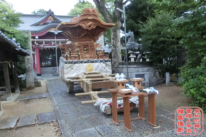| ● 岡田北組 (おかだきたぐみ・泉南市西信達地区) ・新調:平成16年 (同年9月19日入魂式) ・大工:畑谷建設 ・彫師:木彫工房筒井,木彫白井 ・本幕:谷尾 ・太鼓:太鼓正 ・宮入:里外神社 ◎ やぐらの歴史 先々代やぐらは昭和10年頃に新町に3台あったうちの1台を購入するが昭和50年頃から曳行休止、先代やぐら購入時に解体処分されました。先代やぐらは大正5年に石田宮本のやぐらとして大工:貴田虎次郎師、彫師:相野卯三郎師によって新調、平成2年1月14日日曜日に石田宮本やぐら昇魂式後に購入。平成14年9月29日日曜日に昇魂式を実施し岬連中へ譲渡、平成15年1月12日日曜日に岬連中のやぐらとして入魂式が行われるが平成21年に抜魂式をした後、平成27年8月2日日曜日に河合工務店へ搬出しました。 ◎ 現在のやぐら 現在のやぐらは平成16年に大工:畑谷建設、彫刻:木彫工房筒井,木彫白井によって新調、同年9月19日日曜日に里外神社にて入魂式を行いました。また提灯は正面に「北組」、屋根周りには「北」。 ◎ 彫物図柄解説 【大屋根廻り】 ・鬼板 − 獅噛み ・箱棟 − 雲海 ・懸魚 − 正面:鳳凰、 後面:鷹 ・飛檐垂木 − 「岡」の文字 ・地垂木 − 獅子 ・車板 − 正面:夫婦岩 初日の出、 後面:雲海 ・桝組 − 阿吽の龍,松竹梅,獏,象,獅子,牡丹 【六手先八段】 ・枡合 − 正面:天の岩戸、 右:日本武尊 野火の難を逃れる、 左:素盞雄尊 八岐大蛇退治、 後面:神功皇后 応神天皇平産す 【神話伝説】 ・木鼻 − 正面右:子を抱く唐獅子、 正面左:鈴を抱く唐獅子、 右側面前:牡丹を咥える唐獅子、 右側面後:瓢箪を抱く唐獅子、 左側面前:木槌を抱く唐獅子、 左側面後:巾着を抱く唐獅子 ・虹梁 − 里外神社御神紋に若葉 ・欄間 − 正面:頼朝本陣、 右:仁田四郎 猪退治、 左:勢子の活躍 【富士の巻狩】 ・柱巻 − 右:昇り龍、 左:降り龍 ・長押 − 正面:梅に山鵲、 右:牡丹に山鵲、 左:菊に山鵲 ・小脇板 − 右:新田義貞 金造りの太刀を龍神に捧ぐ、 左:児島高徳 櫻木に赤誠を記す 【太平記】 ・御簾 − 「北組」の文字 ・幕板 − 右:獅子奮迅 鬼左近大乱戦、 左:黒田長政 奮闘大乱戦 【関ヶ原の戦い】 ・脇障子 − 右:本能寺の変 森蘭丸、 左:本能寺の変 織田信長 【信長公記】 ・兜桁 − 里外神社御神紋 【腰廻り】 ・犬高欄 − 正面:牡丹に唐獅子、 右:波濤、 左:波濤 ・擬宝珠高欄 − 正面右:子,丑、 正面左:戌,亥、 右:虎,卯,辰,巳、 左:午,未,申,酉、 束:力士 【十二支】 ・内高欄 − 加藤清正 山路将監を討つ 【賤ヶ岳の合戦】 ・板高欄 − 正面右:加藤嘉明の勇戦、 正面左:片桐且元の勇戦、 右:福島正則勇戦、 左:鬼玄蕃 秀吉本陣急襲 【賤ヶ岳の合戦】 ・縁葛 − 牡丹に唐獅子 【小屋根廻り】 ・鬼板 − 獅噛み ・箱棟 − 雲海 ・懸魚 − 飛龍 ・飛檐垂木 − 「岡」の文字 ・地垂木 − 獅子 ・車板 − 風神,雷神 ・枡組 − 阿吽の龍,松竹梅,獏,象,獅子,牡丹 【四手先六段】 ・枡合 − 後正面:樫井川の合戦 塙団右衛門出師、 右:日吉丸矢矧橋の出会い、 左:醍醐の花見 【太閤記】 ・木鼻 − 後正面右:鞠を抱く唐獅子、 後正面左:宝珠を抱く唐獅子、 右側面前:牡丹を咥える唐獅子、 右側面前後:鈴を抱く唐獅子、 左側面前:鈴を抱く唐獅子、 左側面後:牡丹を咥える唐獅子 ・虹梁 − 里外神社御神紋に若葉 ・欄間 − 右:清水一学奮戦、 左:上野介召捕り 【忠臣蔵】 ・長押 − 右:楓に山鵲、 左:梅に山鵲 ・太鼓廻り − 牡丹に唐獅子 ・幕板 − 右:真田幸村勇戦、 左:木村重成勇戦 【大坂夏の陣】 ・板高欄 − 右:藤吉郎 初見参、 左:藤吉郎 一夜城用材調達 【太閤記】 ・縁葛 − 右:司馬温公甕割りの場、 左:宝車曳き 【唐子遊び】 【本幕】 ・本幕 − 正面:「岡田」の文字に里外神社御神紋、 右:川中島龍虎相討つ 上杉謙信、 左:川中島龍虎相討つ 武田信玄 ◎ 曳行パターン ・宵宮:ところ曳き、西信達パレード ・本宮:ところ曳き、里外神社へ宮入 ◎ 岡田北組の略年表 ・昭和10年頃−新町より先々代やぐらを購入。 ・昭和50年頃−先々代やぐら曳行休止。 ・平成2年−石田宮本より先代やぐらを購入。 ・平成14年9月29日−先代やぐら昇魂式を実施。 ・平成15年1月12日−先代やぐら、岬連中として入魂式を実施。 ・平成16年9月19日−現在のやぐらを新調、里外神社にて入魂式を実施。 ・平成17年4月3日−鬼板を新調、入魂式を実施。 ・平成17年4月−やぐら新調記念誌を発刊。 ・平成26年7月20日日曜日−纏を新調。 ・平成28年9月4日日曜日−川口建設によって駒を新調、御祓いを実施。 ・令和2年−新型コロナウイルス感染症対策として曳行自粛。 ・令和3年−新型コロナウイルス感染症対策として曳行自粛。 |