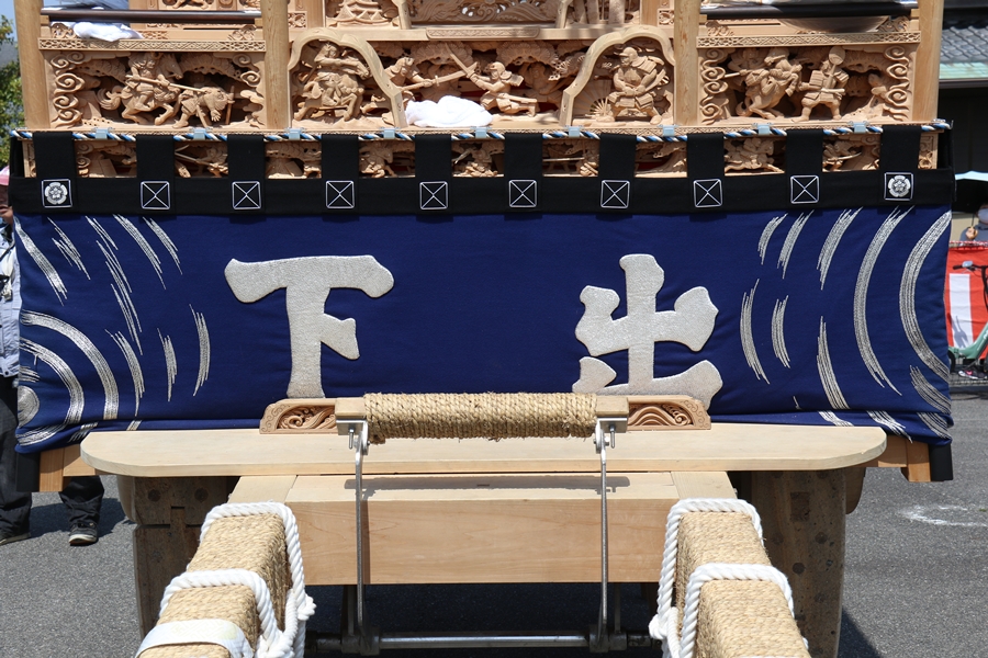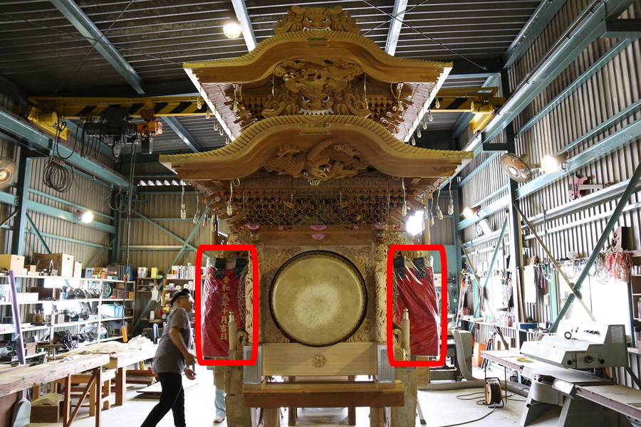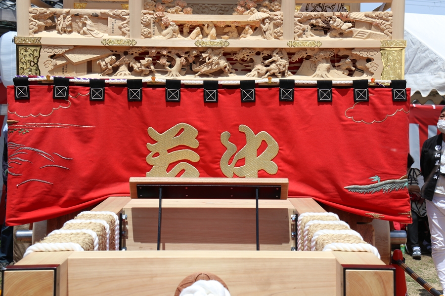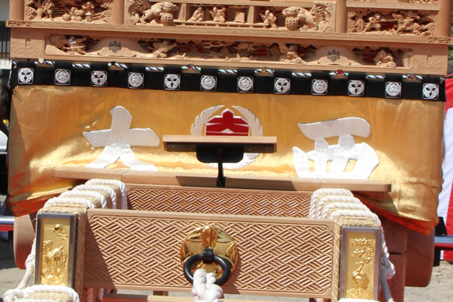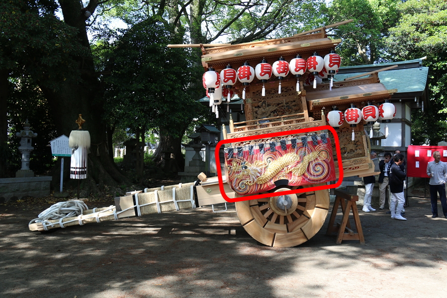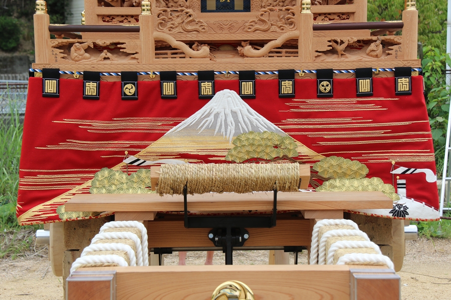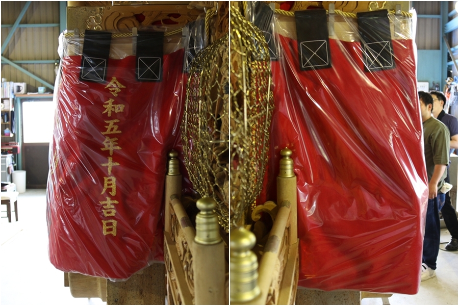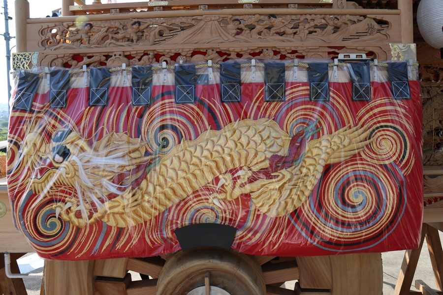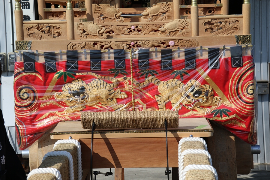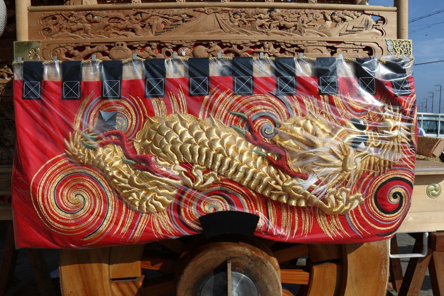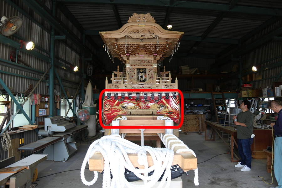 | 幕は主に本幕・泥幕があり本幕には刺繍等が施されたモノが多く祭禮時に使用、泥幕は文字どおり泥よけの幕で本幕の下に付けたり試験曳きや雨の時に使用します。 |