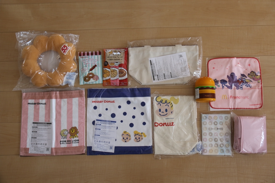 2026/1/25 - 福袋![]() 今年、4年ぶりにマクドの福袋に当選しました。4年ぶりだったので無茶苦茶嬉しかったのですが今月10日土曜日、梅田のマクドへ行くと売れ残った福袋が販売されており嬉しさ半減、複雑な気持ちの福袋です。そんな中、今年はミスドの福袋¥6,500円と¥3,800円の2種類を購入、マクドが¥3,900円だったので合計¥14,200円ですが金額以上のクーポン券に加えてオリジナルグッズが付いていました。ミスドはおやつに、そしてマクドは酒のアテとして使うのは言うまでもありません。 |