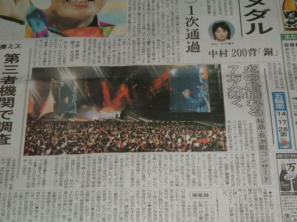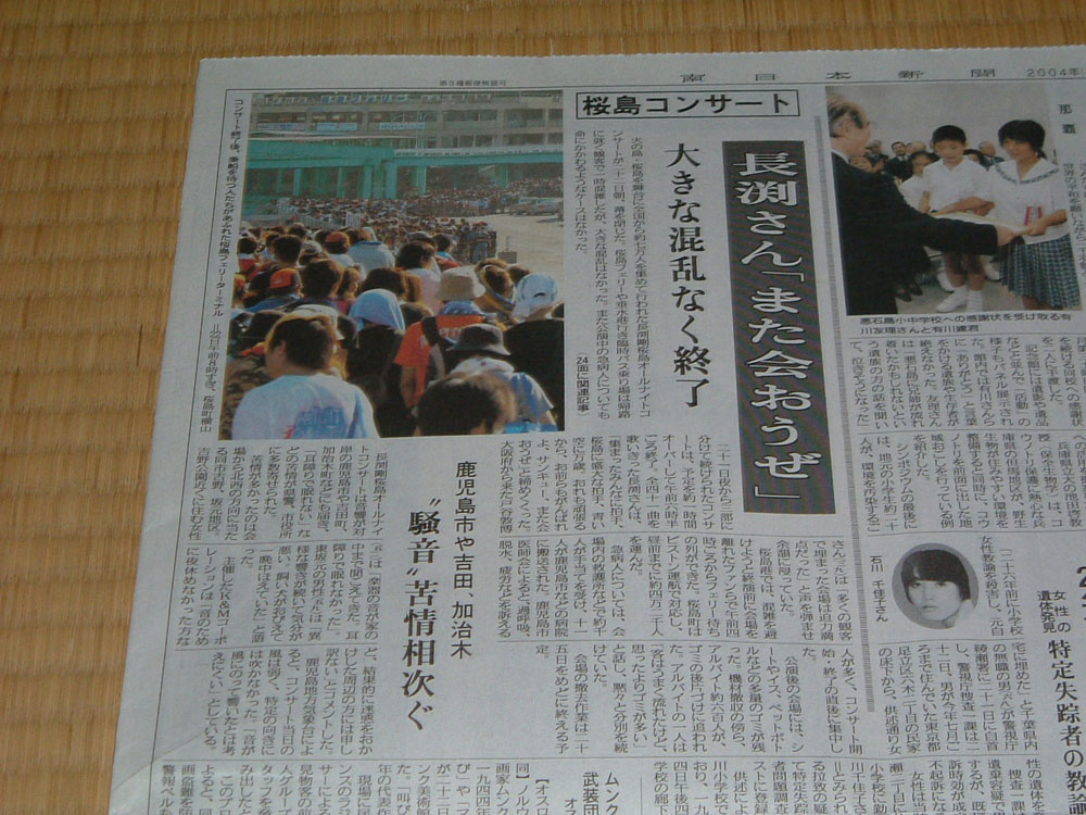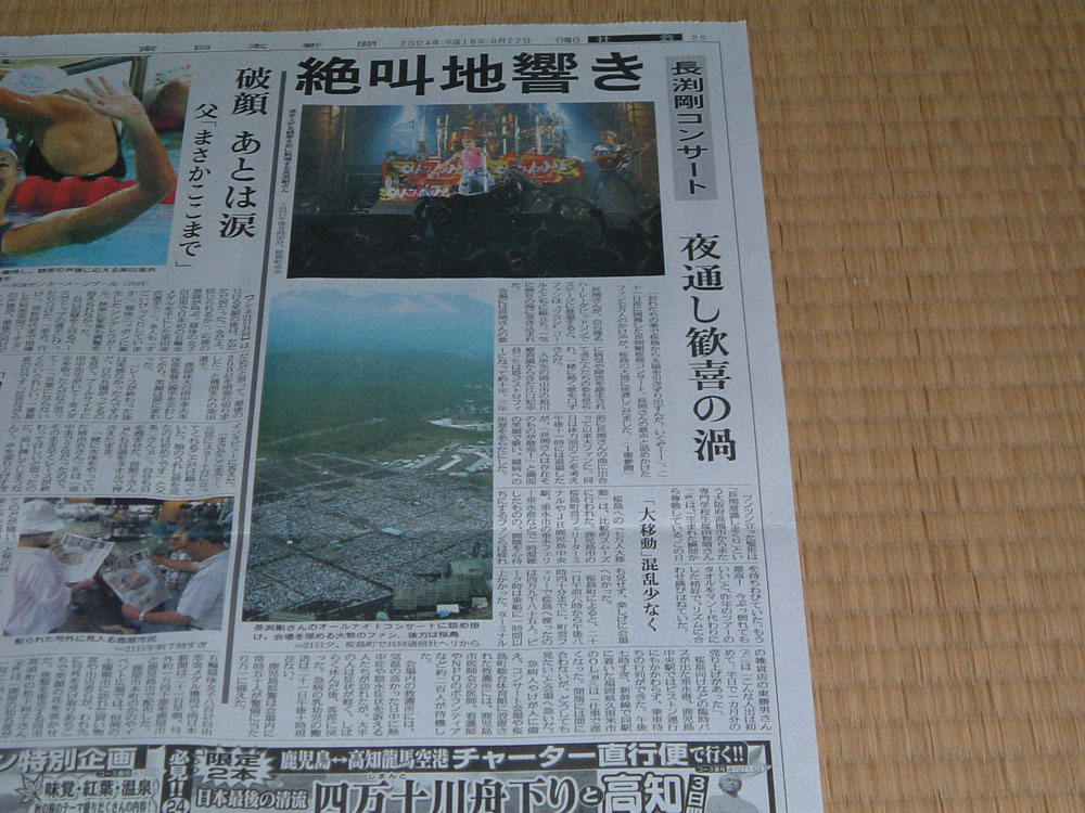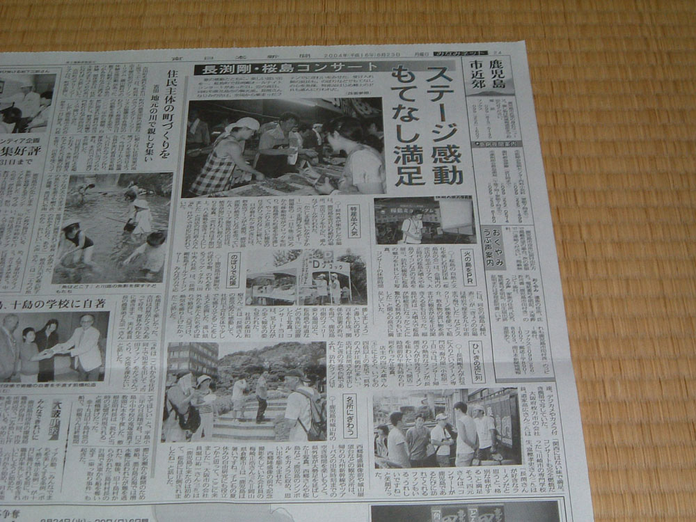 桜島ライブ・南日本新聞記事 南日本新聞・平成16年8月21日土曜日34面 南日本新聞・平成16年8月22日日曜日1面 南日本新聞・平成16年8月22日日曜日26面 南日本新聞・平成16年8月23日月曜日24面 南日本新聞・平成16年8月23日月曜日26面