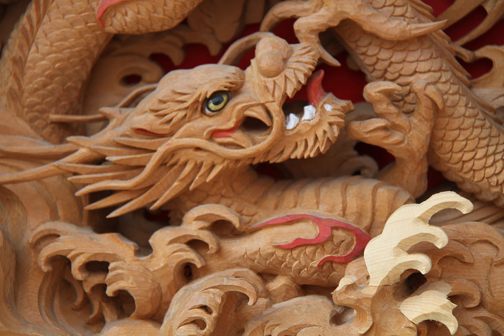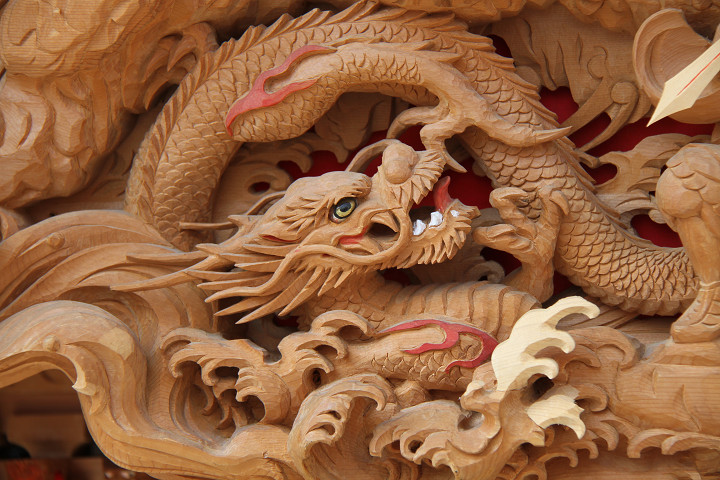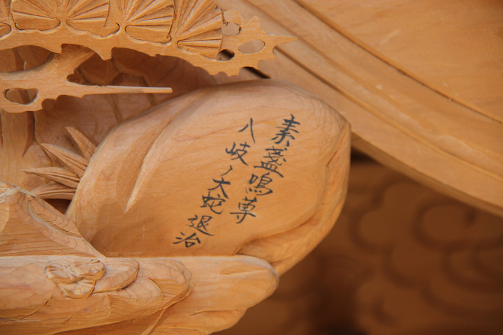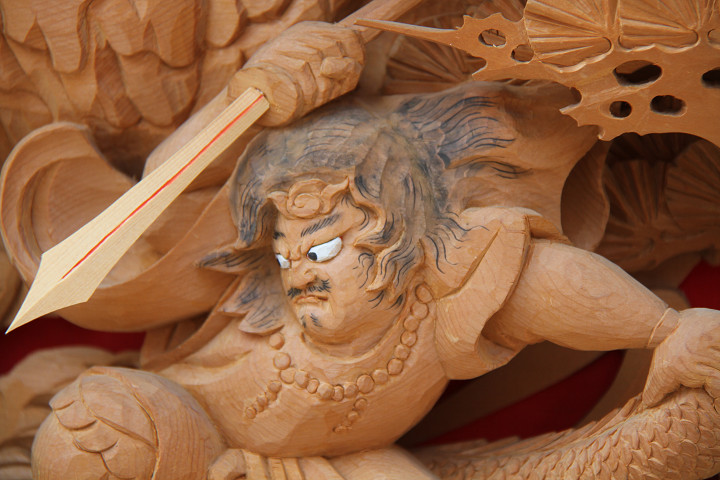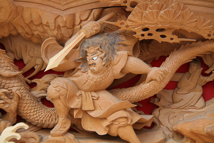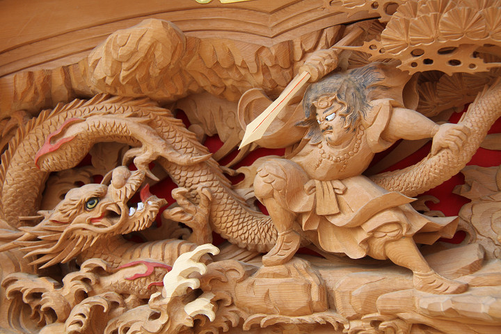 彫物題材:素戔嗚尊 八岐大蛇退治 / 小屋根懸魚正面
