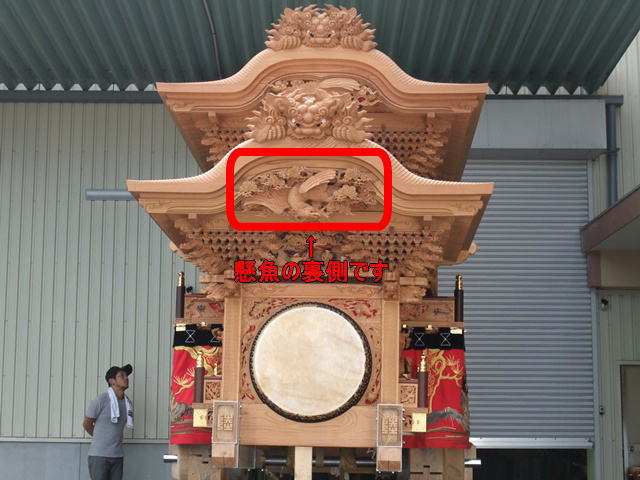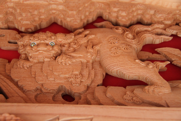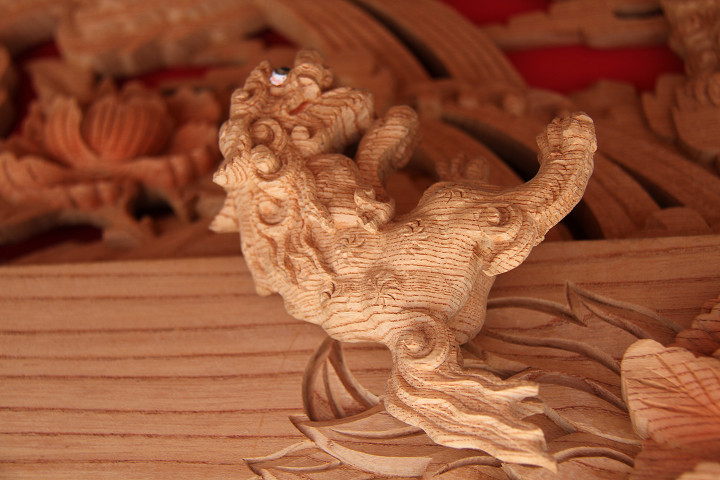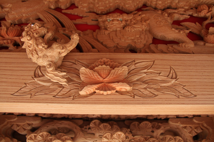 彫物題材:獅子の子落とし / 小屋根車板正面