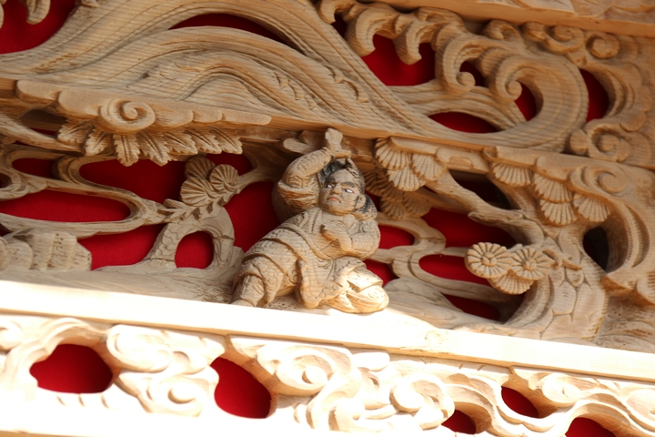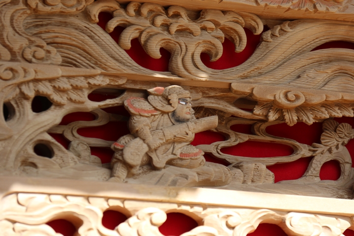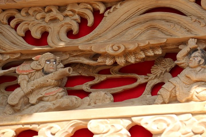 彫物題材:轟天雷凌振 山塞に風火子母砲を放つ / 大屋根欄間正面