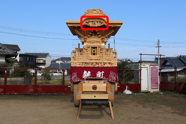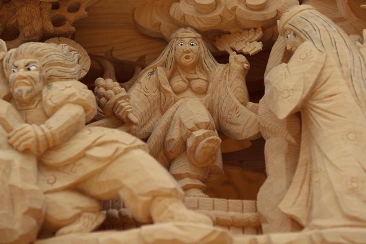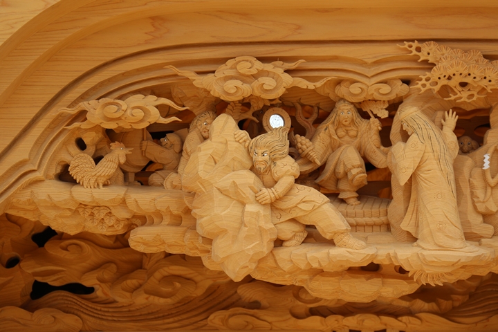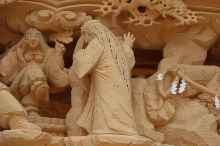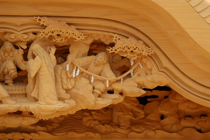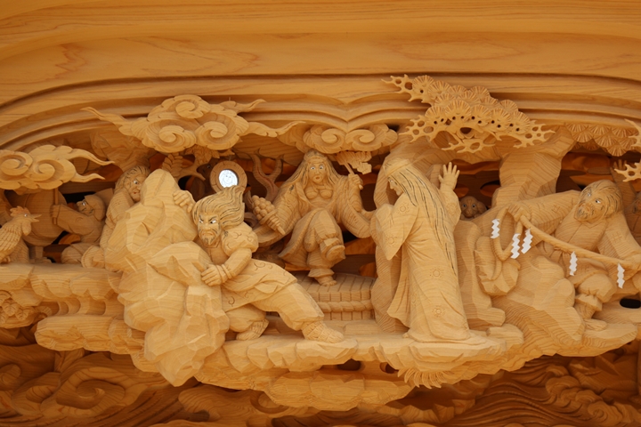彫物題材:天照大神天岩戸隠れ / 大屋根懸魚正面