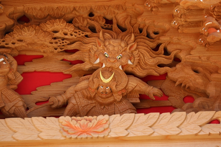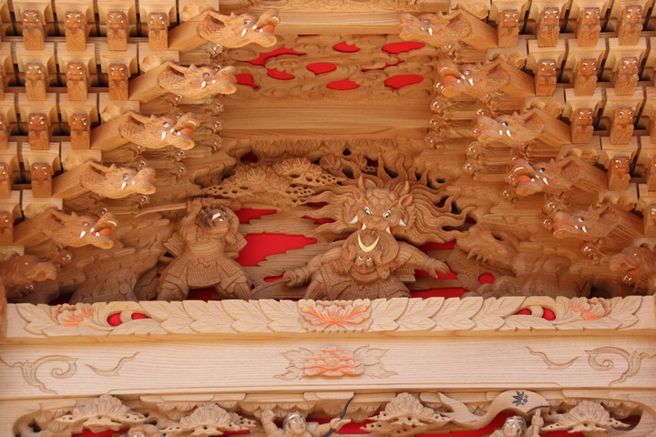 彫物題材:酒呑童子退治 / 大屋根桝合右面