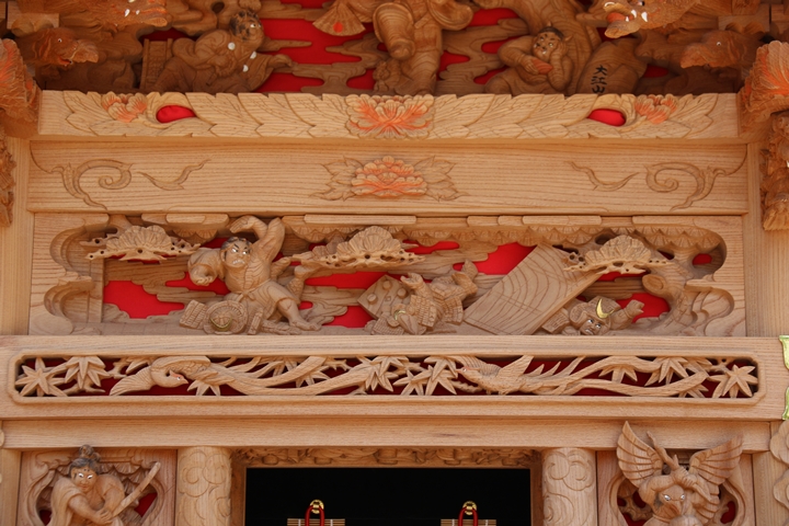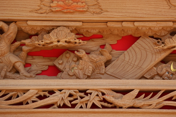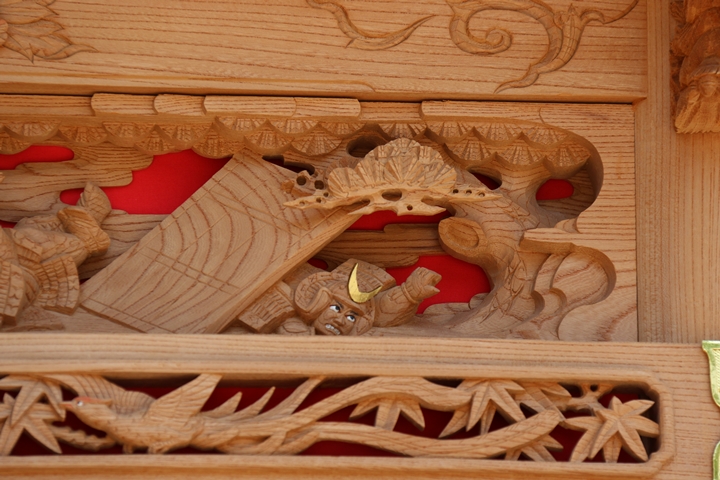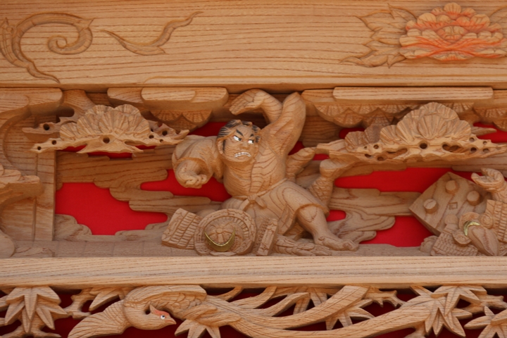 彫物題材:佐藤忠信 碁盤投げ / 大屋根欄間正面
