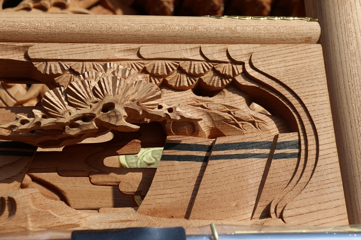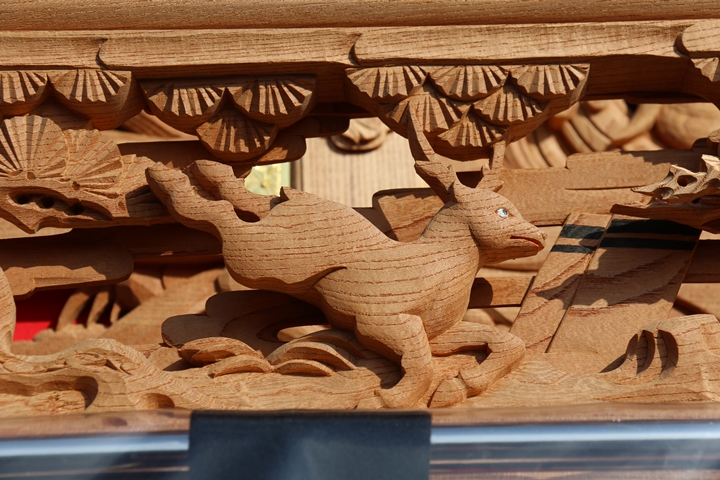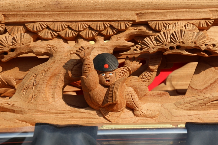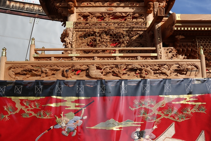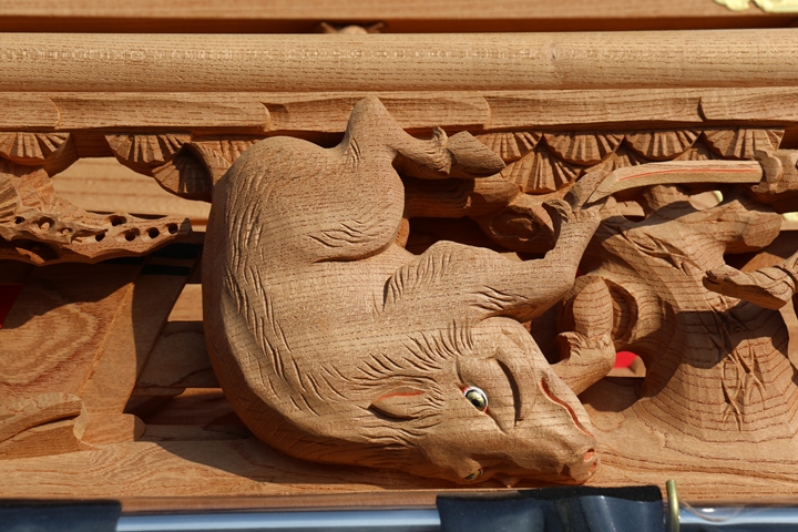 彫物題材:仁田四郎猪退治 / 大屋根板勾欄右面