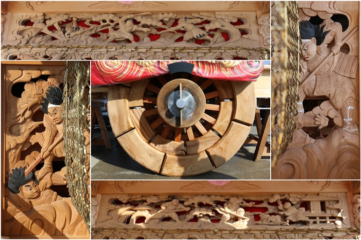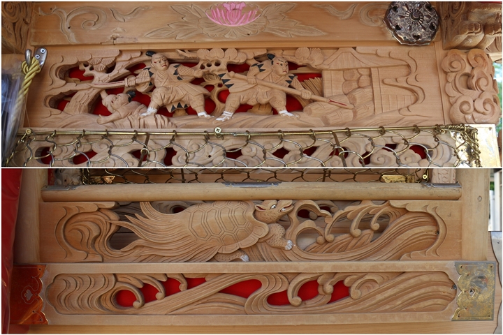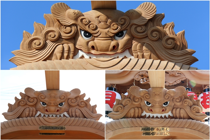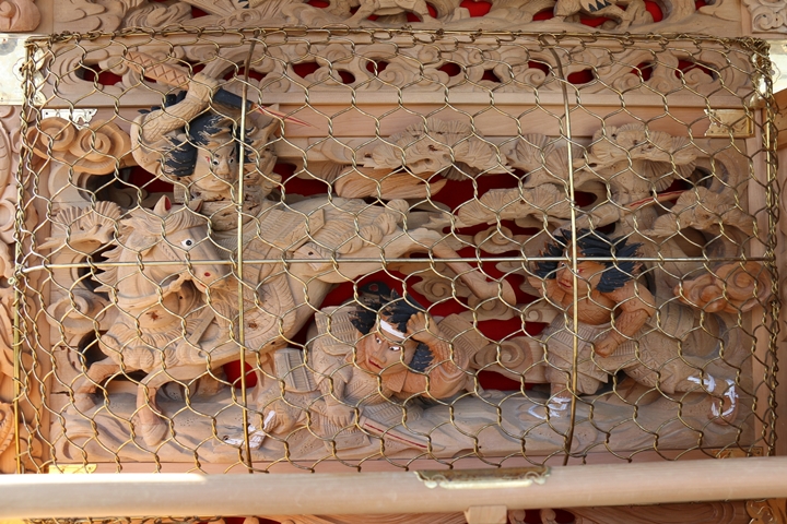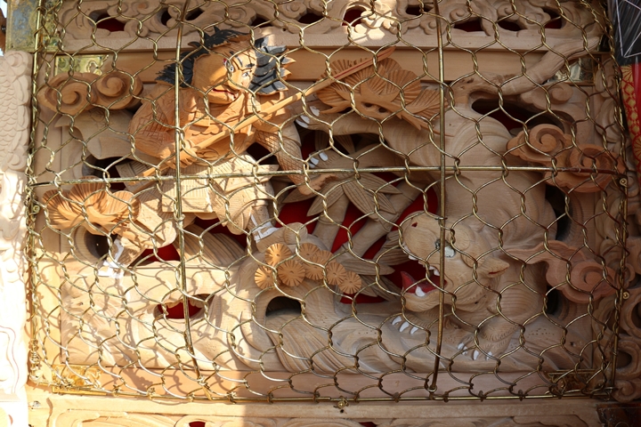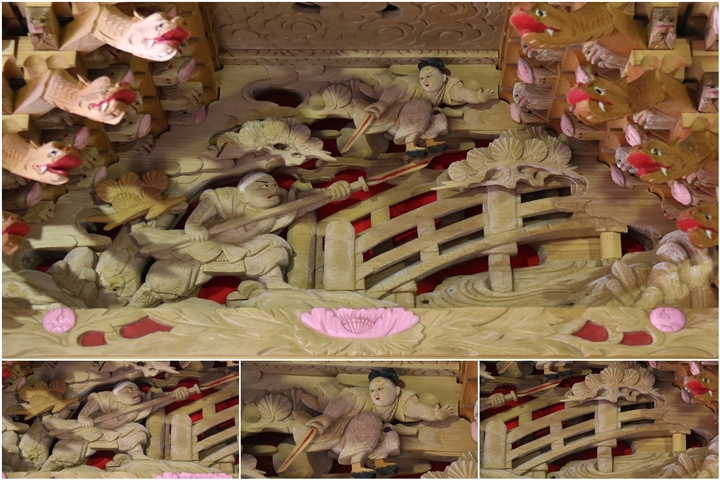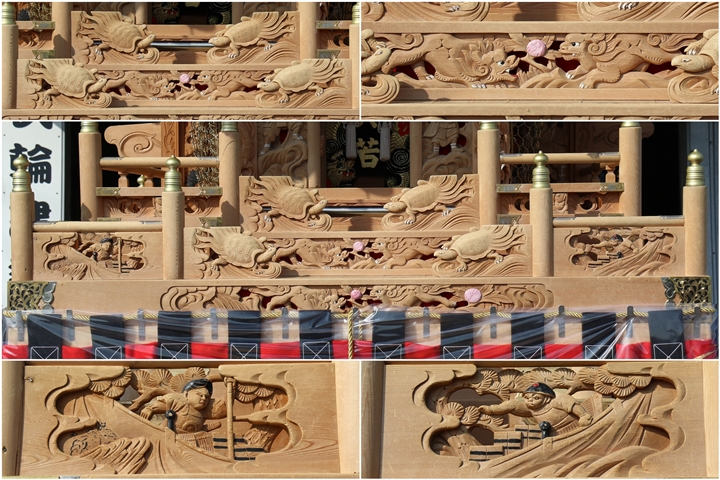 ![]() ▲ まずはやぐら本体の正面と後面。 ![]() ▲ 次いで右平。 ![]() ▲ そして左平。 ![]() ▲ ココからは各箇所の彫物、まずはやぐらの顔とも言える鬼板三面。 ![]() ▲ 次いで懸魚三面。 ![]() ▲ 撮影で一番難儀する車板三面。 ![]() ▲ ココからは大屋根正面、まずは桝組・欄間・そして小脇板と御簾掛。 ![]() ▲ 続いて桝合。 ![]() ▲ 次いで擬宝珠勾欄・犬勾欄・板勾欄・縁葛。 ![]() ▲ ココからは大屋根右面、まずは桝合。 ![]() ▲ そしてやぐらのメインの彫物である幕板。 ![]() ▲ 右面・左面の板勾欄・縁葛。 ![]() ▲ 大屋根左面に移ります。まずは桝合。 ![]() ▲ そして幕板二面目。 ![]() ▲ 右面・左面の欄間、脇障子、そして駒。 ![]() ▲ 大屋根八ヶ所の木鼻。 ![]() ▲ 普段は見づらい大屋根桝合後面と欄間。 ![]() ▲ ココからは小屋根へ、まずは小屋根桝合正面と柱巻や太鼓廻り。 ![]() ▲ ココからは小屋根右面、まずは桝合。 ![]() ▲ 幕板三面目「加藤清正 虎退治」。 ![]() ▲ 上から欄間、板勾欄、縁葛。 ![]() ▲ 最後に小屋根左面に移ります。まずは桝合。 ![]() ▲ 幕板四面目「隠岐次郎左衛門廣有 怪鳥退治」。 ![]() ▲ 上から欄間、板勾欄、縁葛。 ![]() ▲ 小屋根六ヶ所の木鼻。 ![]() ▲ 最後に新旧の本幕。 … ![]() 図録:貝掛の彫物 |