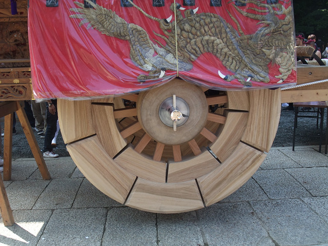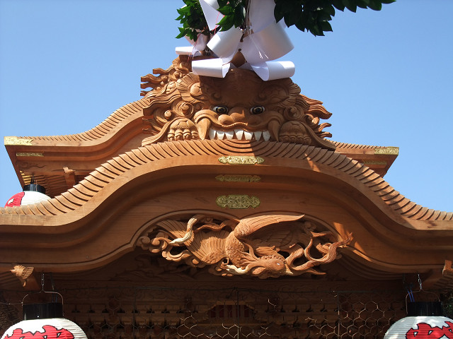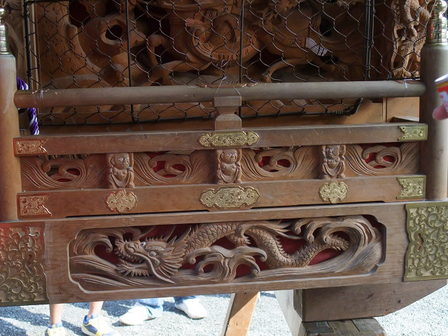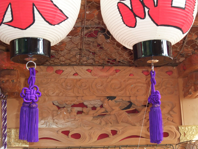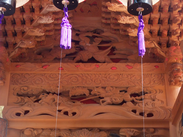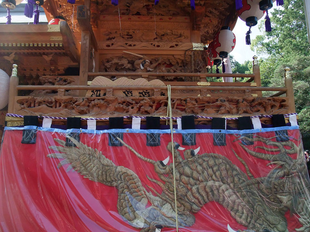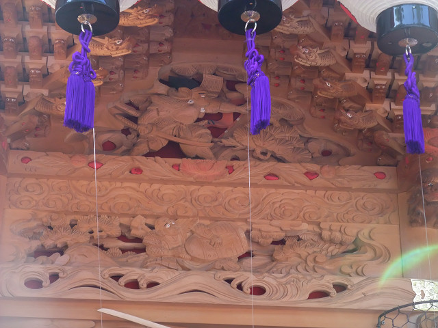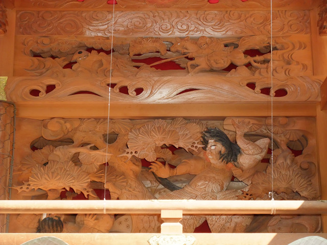 稲村ヶ崎宝剣を奉ず、 左:新田義貞従者 【太平記】 ・兜桁 − 「榮組」の文字 ・犬勾欄 − 正面:唐子、 右:?、 左:? ・擬宝珠勾欄 − 勾欄合:波濤、 束:力神 ・内勾欄 − 牡丹に唐獅子 ・板勾欄 − ? ・縁葛 − 正面:阿吽の唐獅子、 右:谷越え唐獅子、 左:谷越え唐獅子 【小屋根廻り】 ・鬼板 − 獅噛み ・箱棟 − 右:雲に阿龍、 左:雲に吽龍 ・懸魚 − 鳳凰 ・車板 − ? ・枡合 − 正面:?、 右:?、 左:? ・虹梁 − 雲海 ・欄間 − 右:楠公子別れ