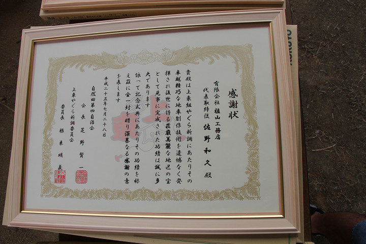 ![]() 植山工務店への感謝状。 |