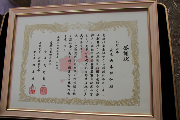 ![]() 木彫山本への感謝状。 |