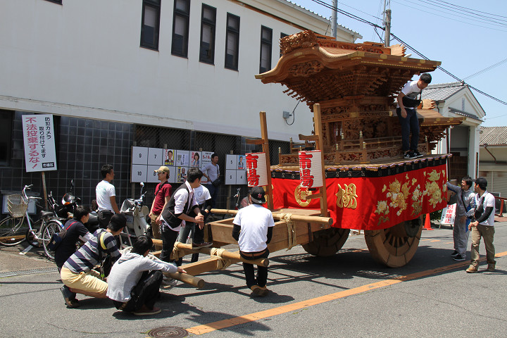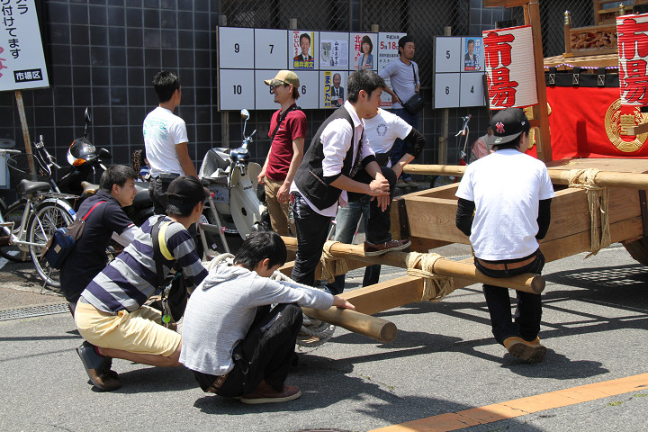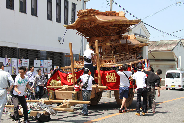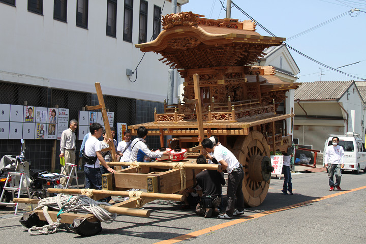 ![]() ココで本幕を取り付け、正面の駒提灯も設置して下さいます。 |
