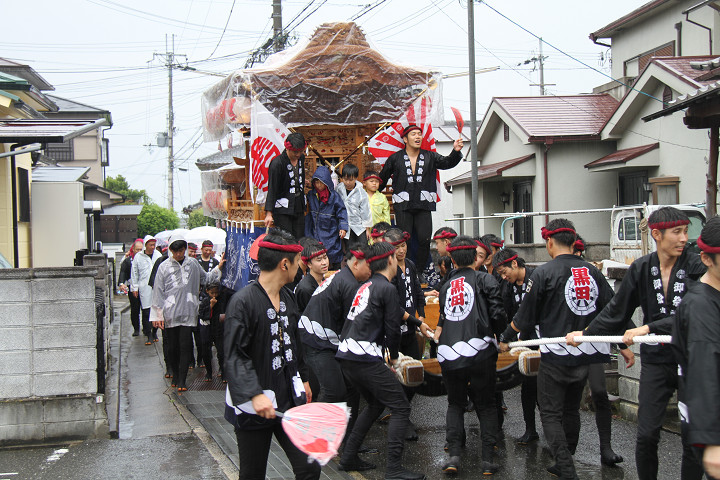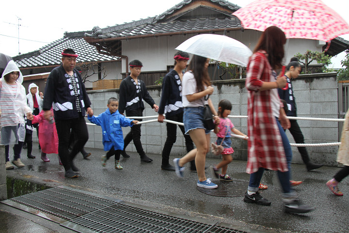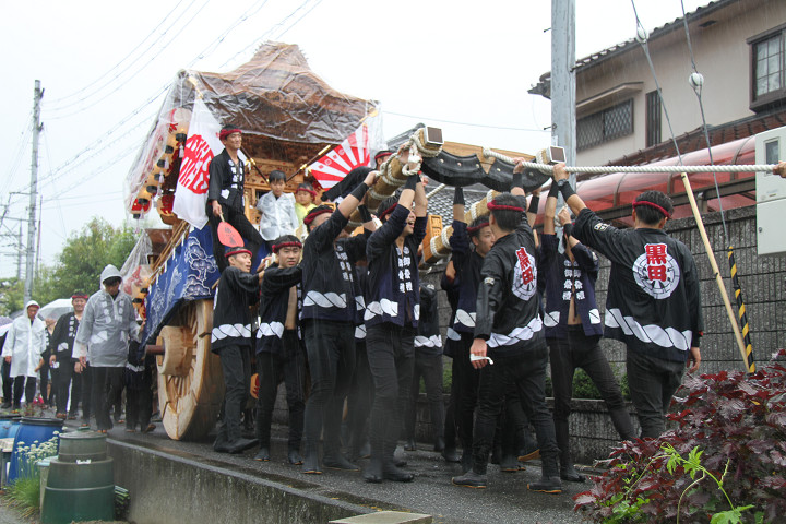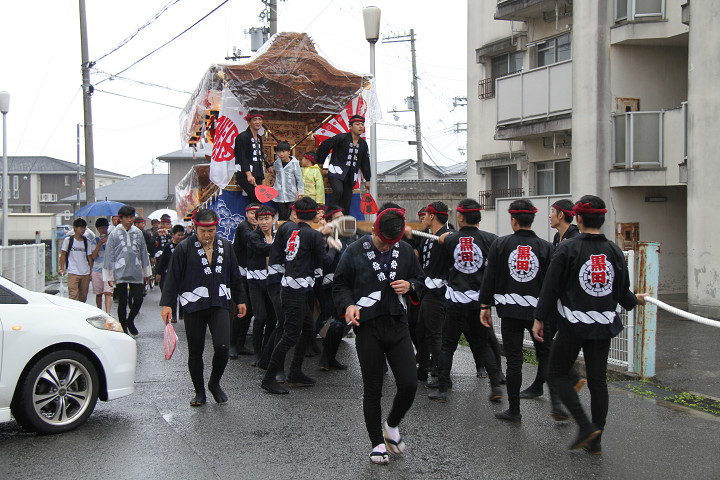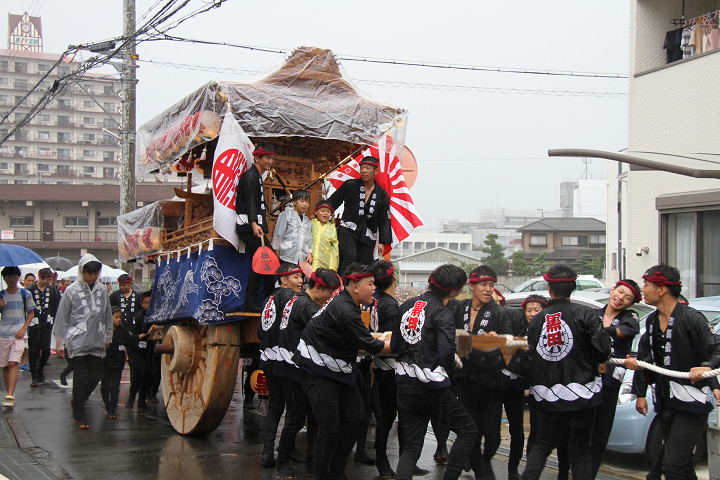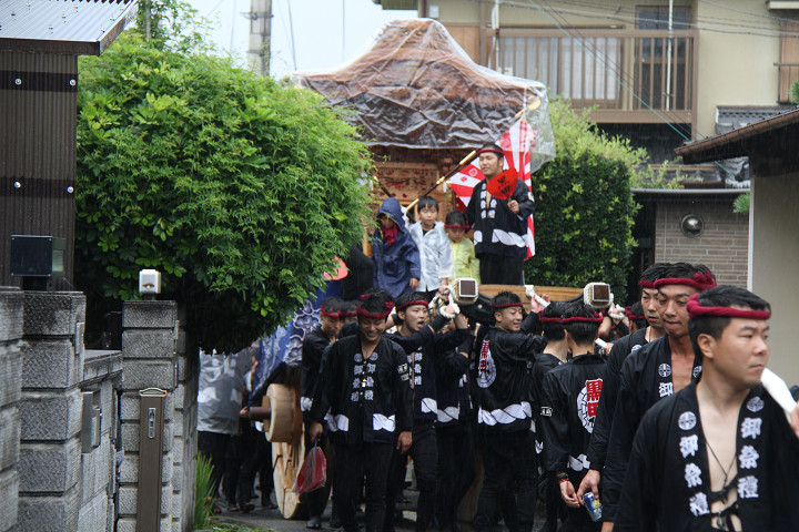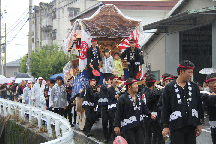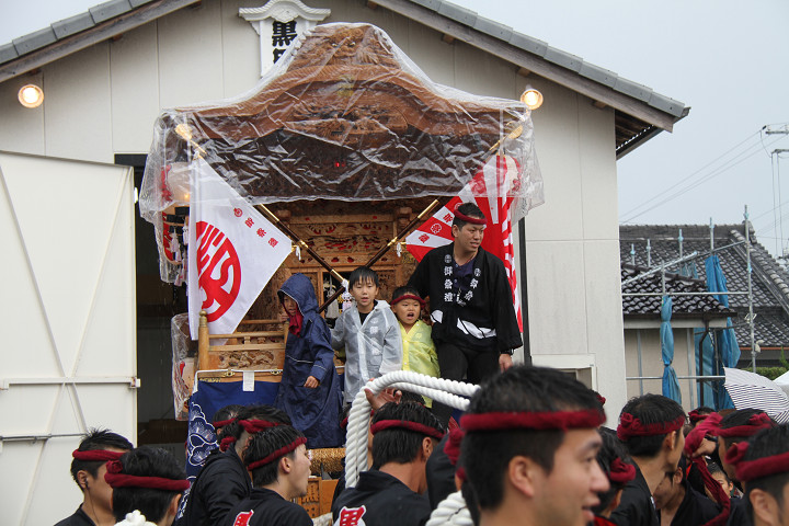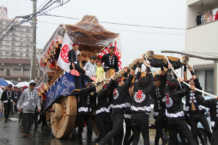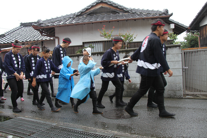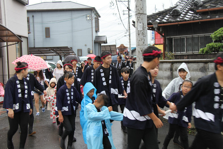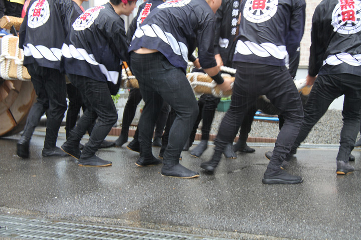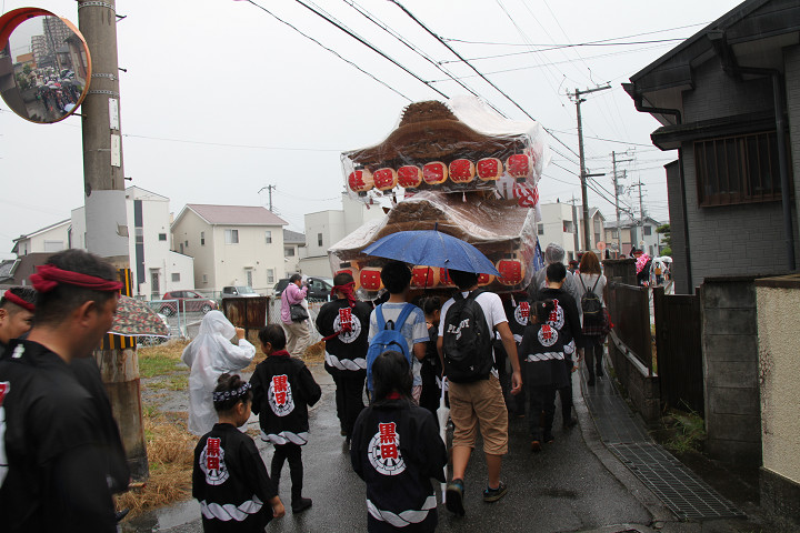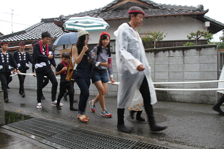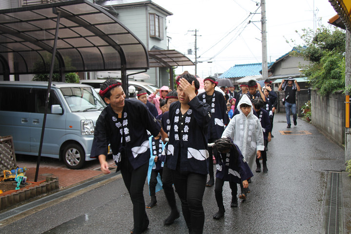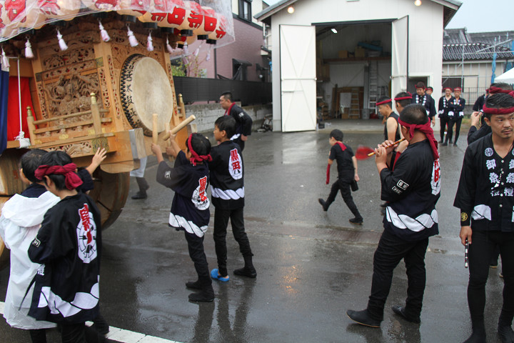 雨脚激しい中、必死に曳いている子供たちです。 |