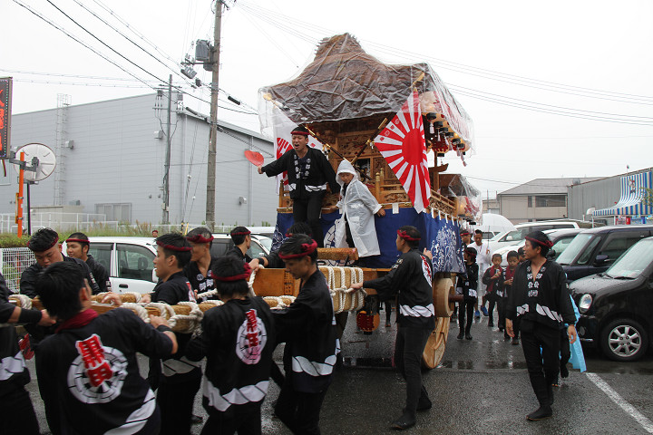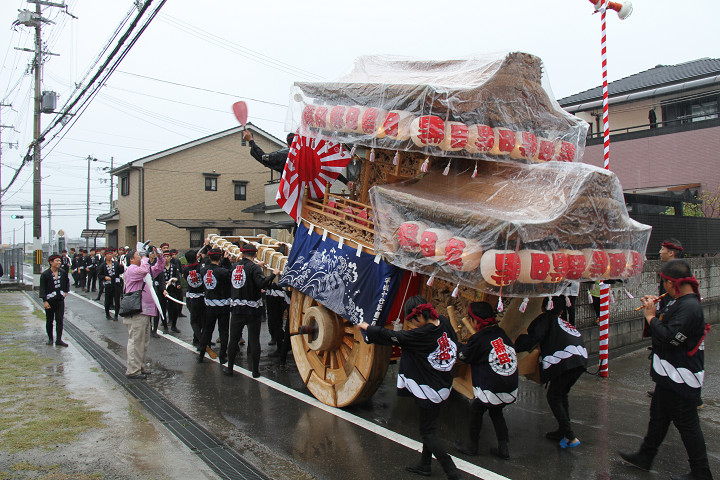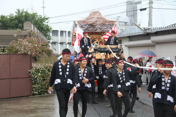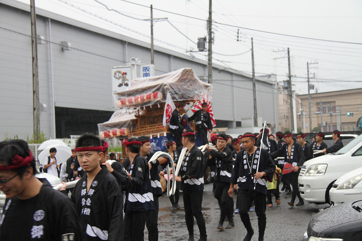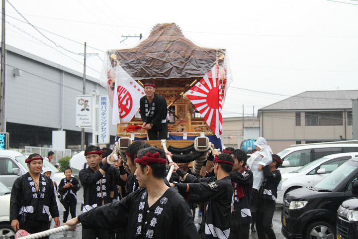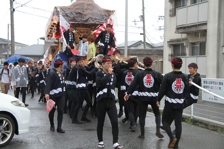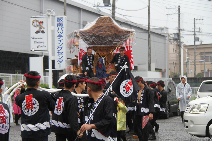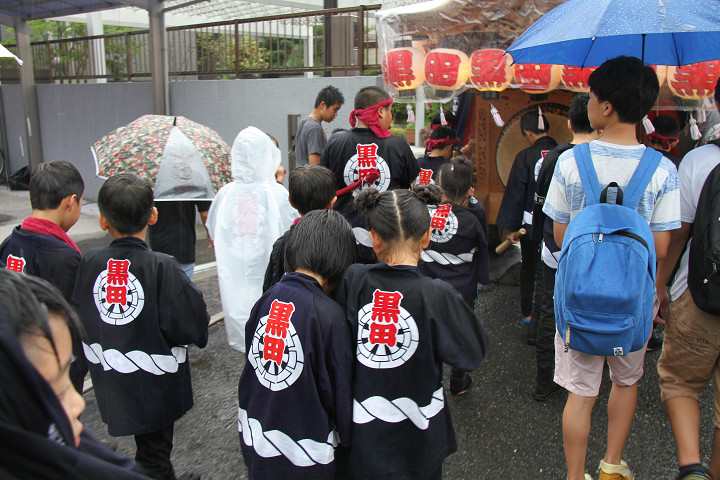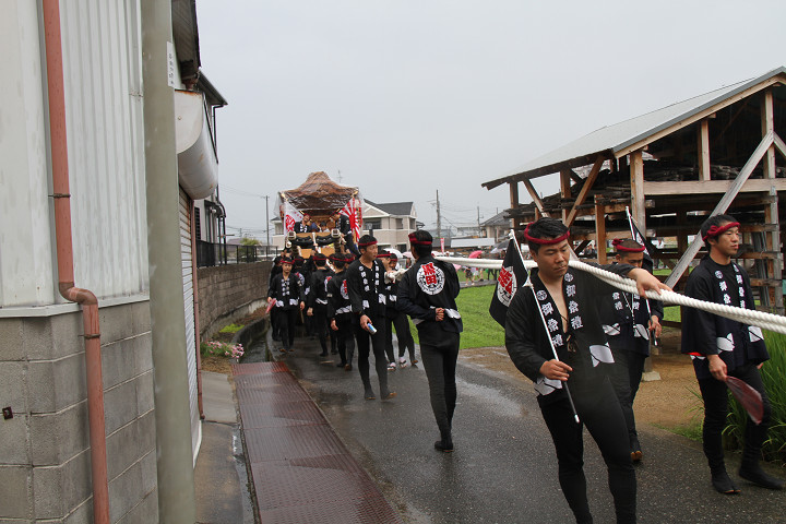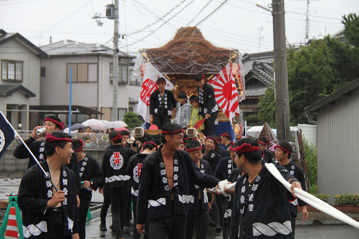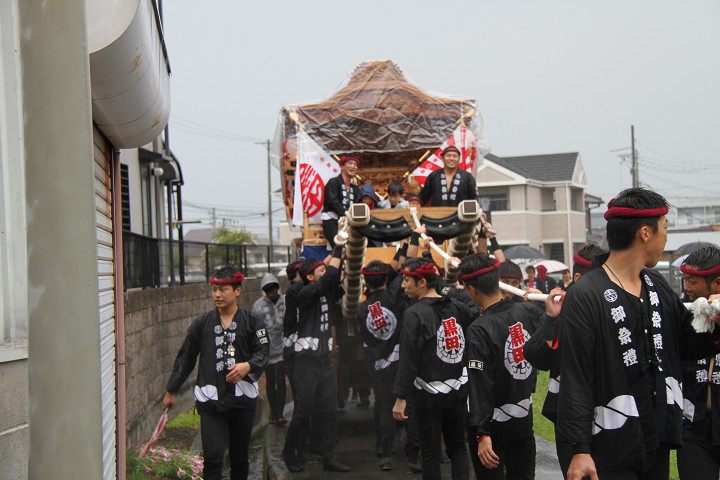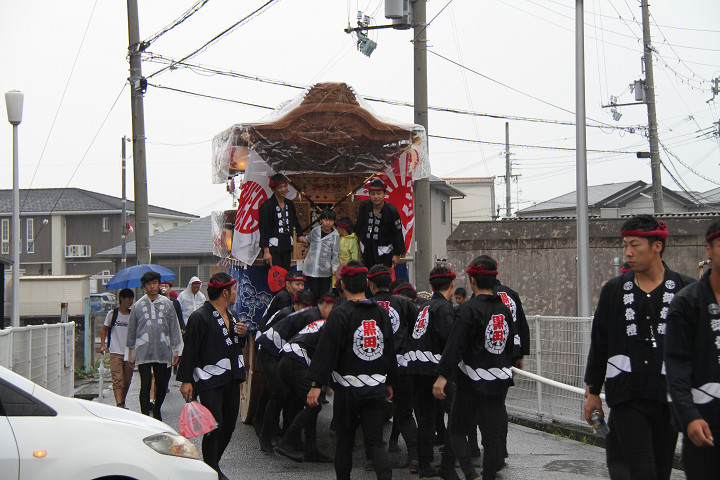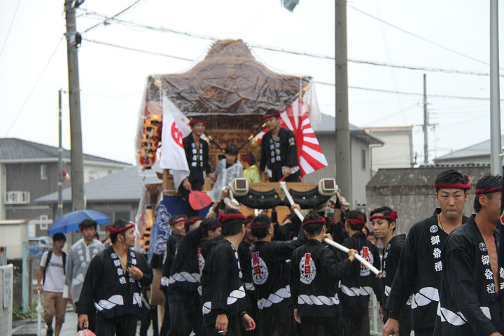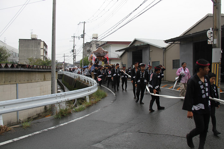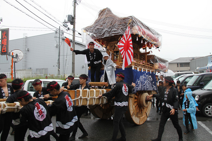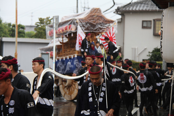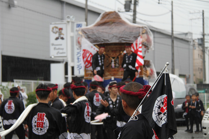 雨脚激しい中、必死に曳いている子供たちです。 |