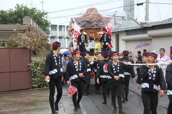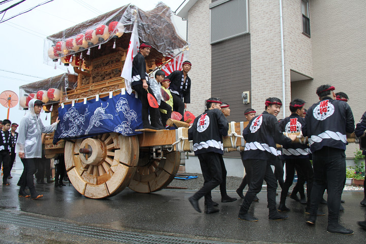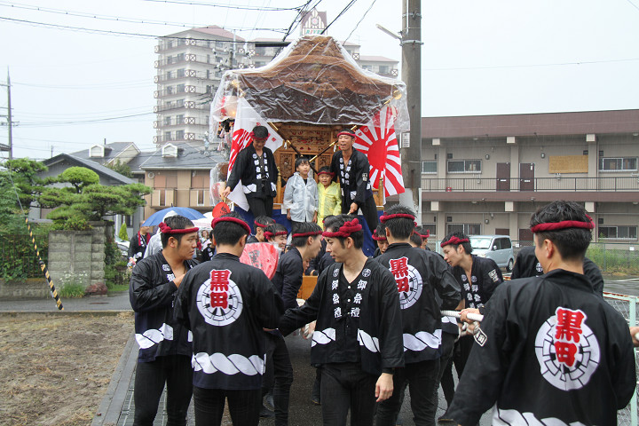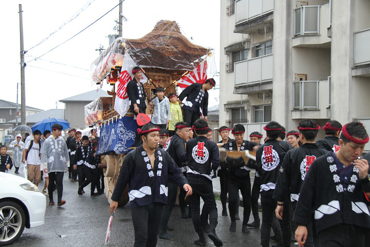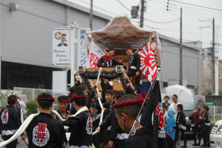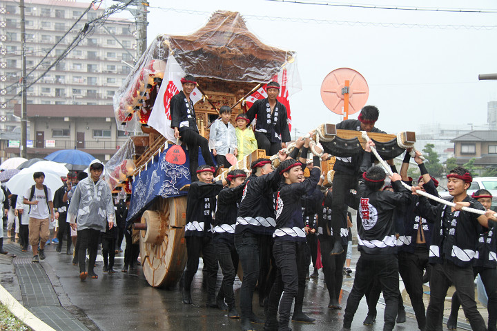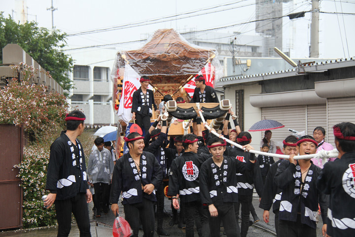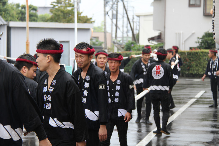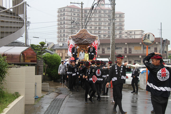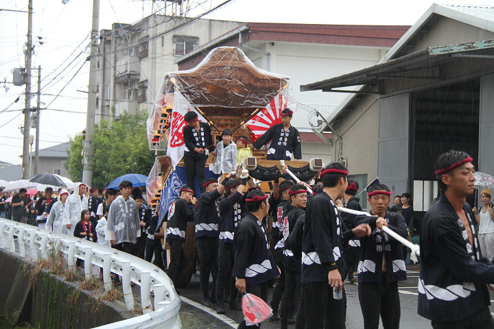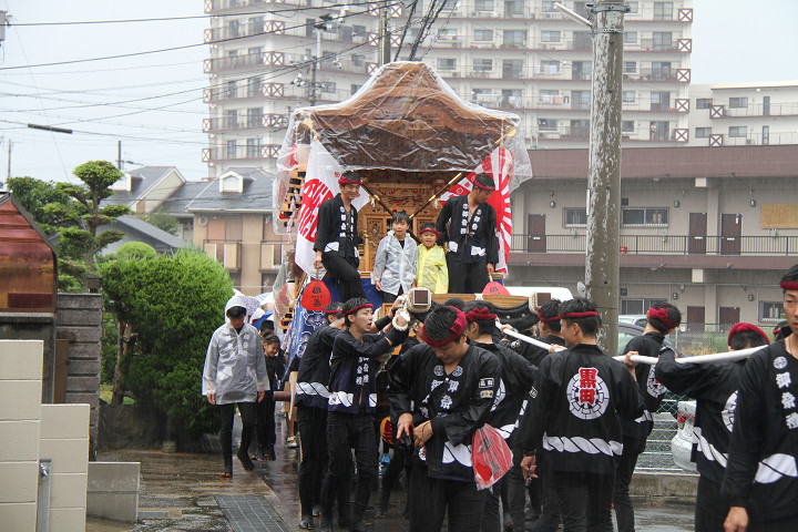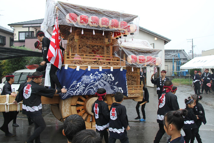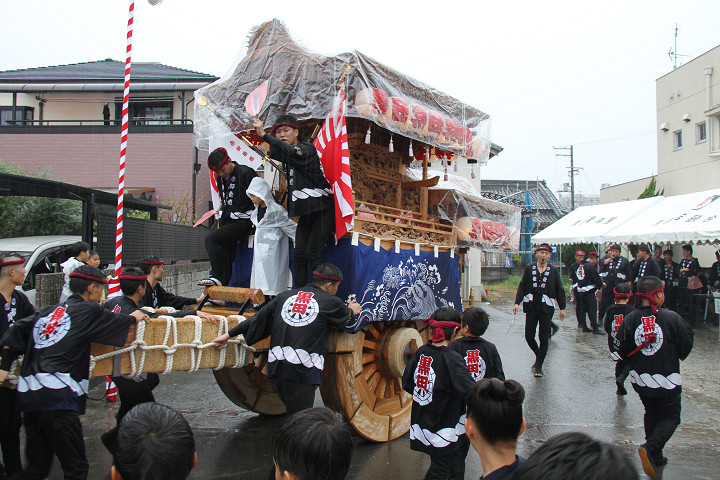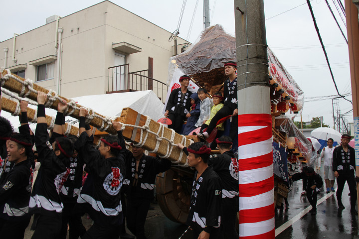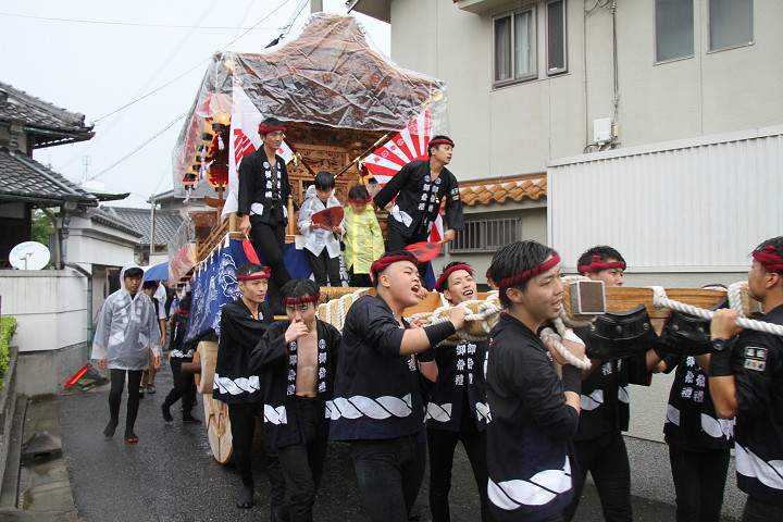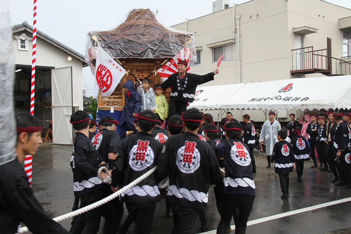 雨脚激しい中、必死に曳いている子供たちです。 |