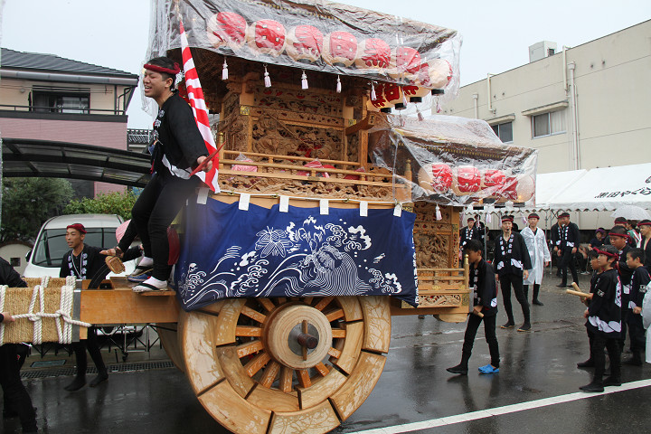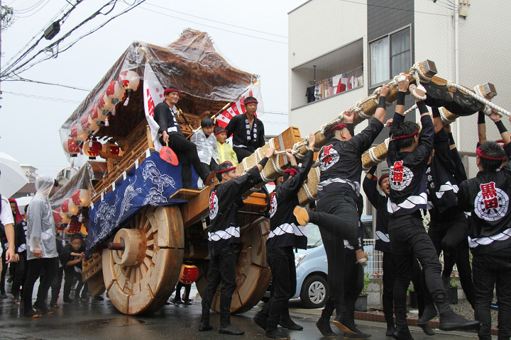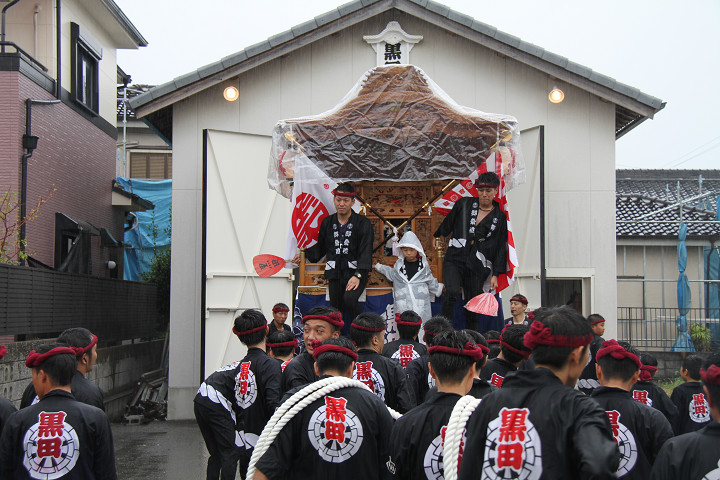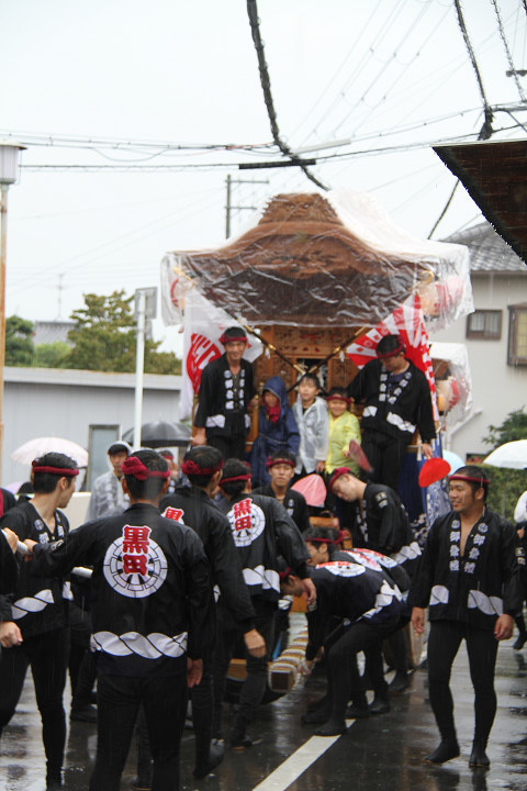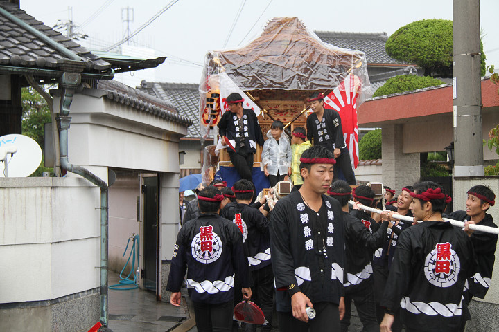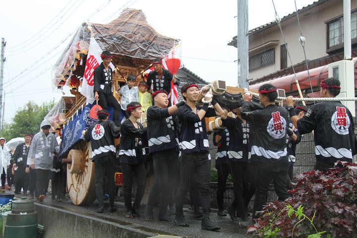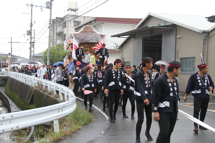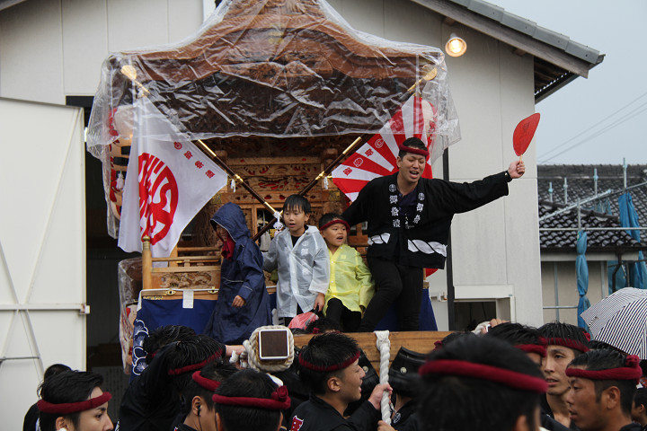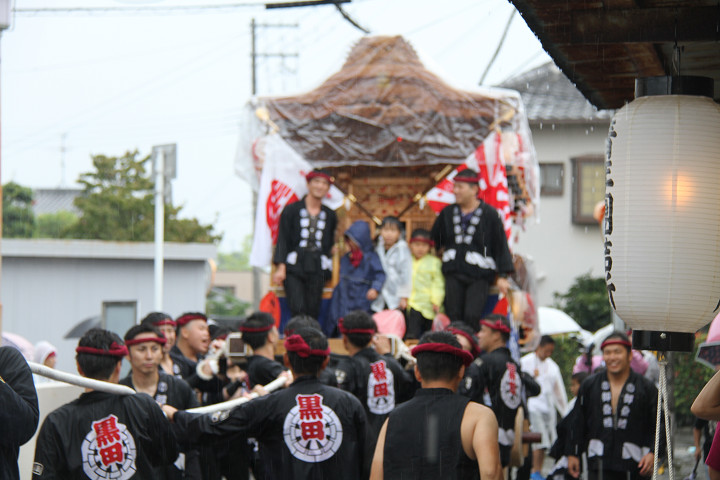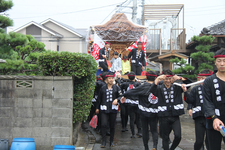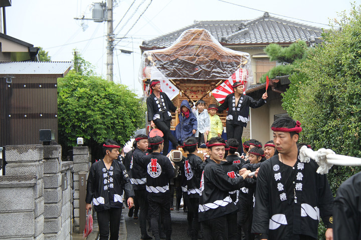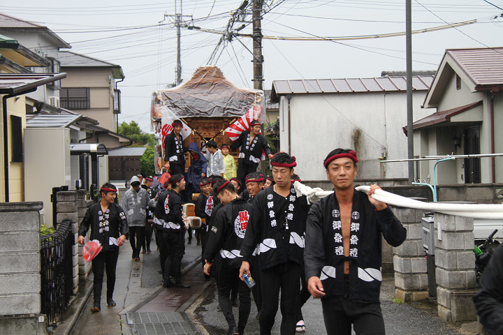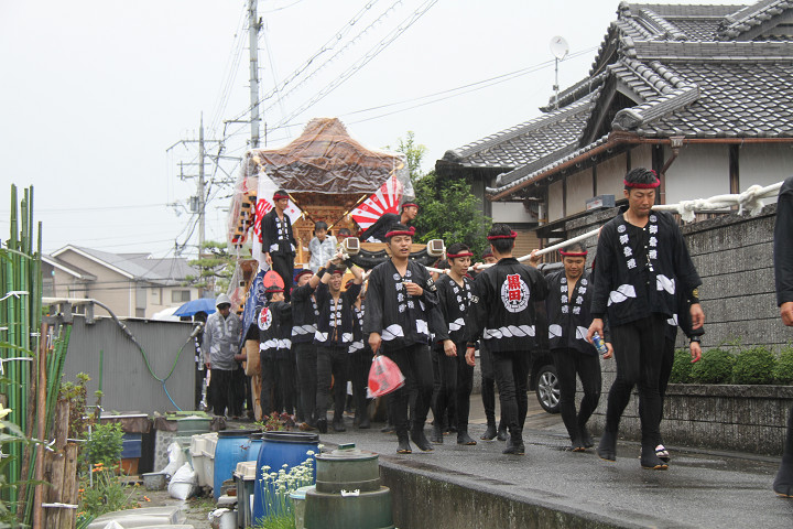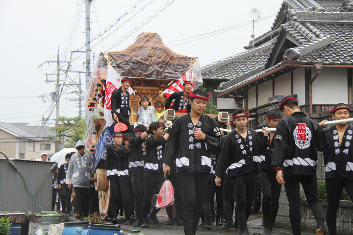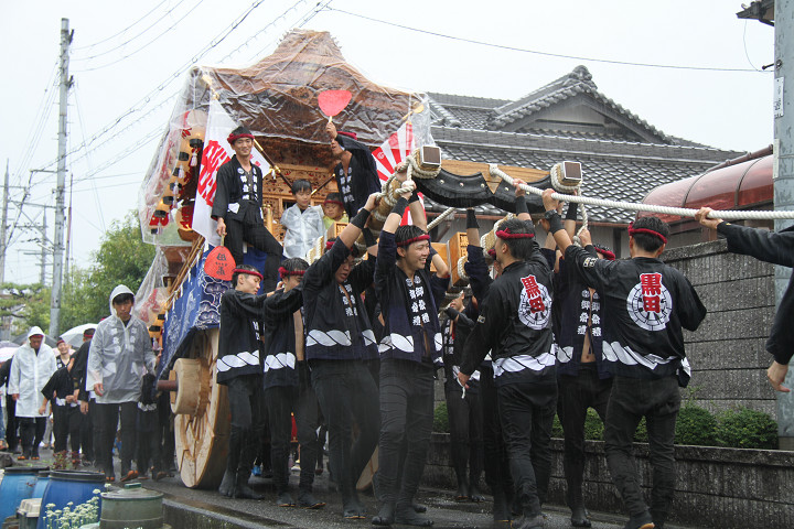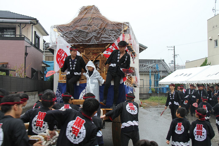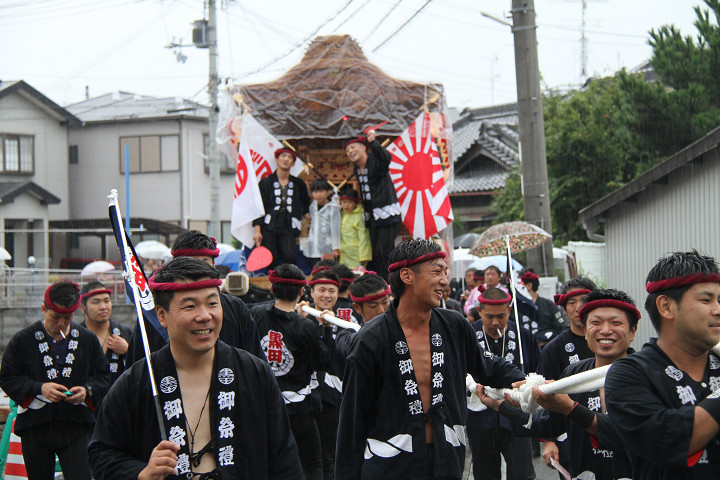 雨脚激しい中、必死に曳いている子供たちです。 |