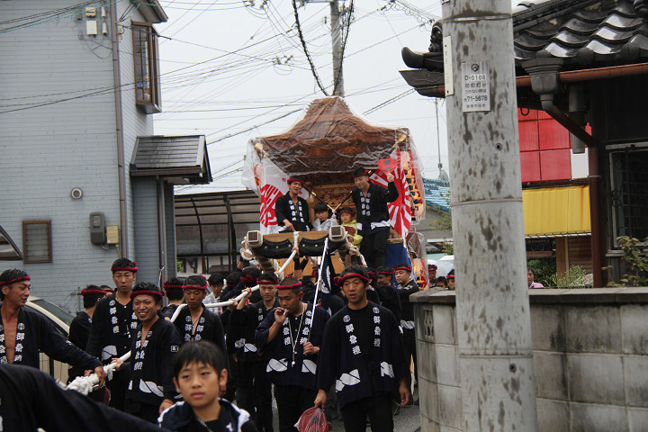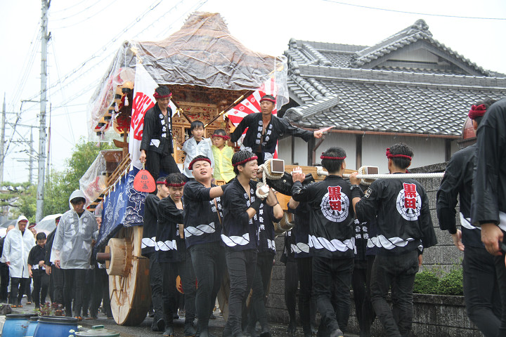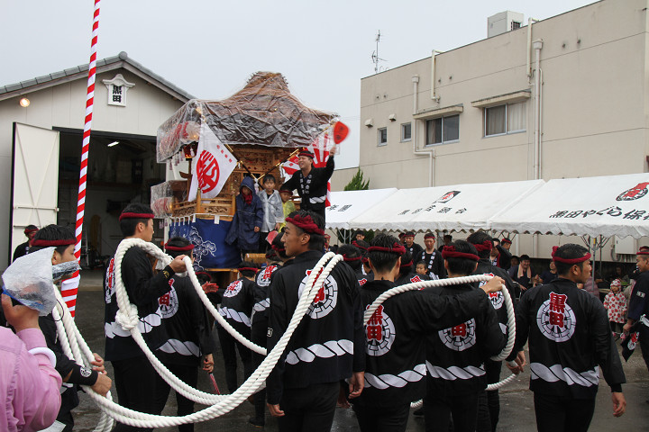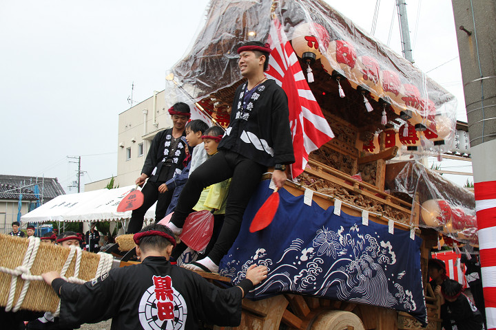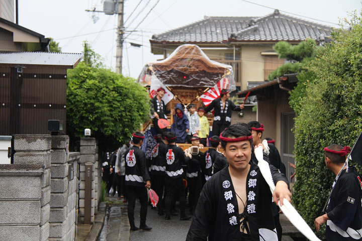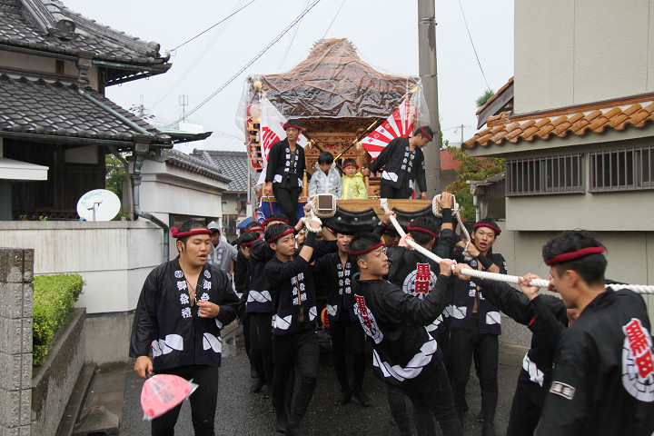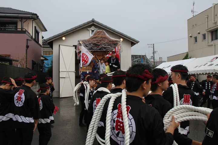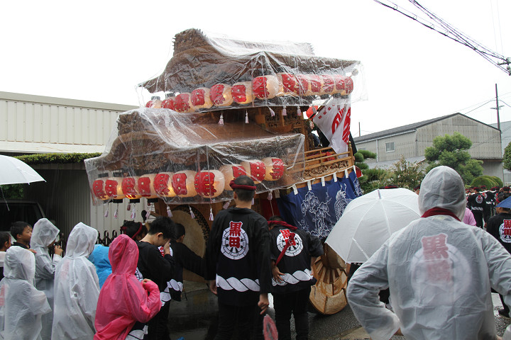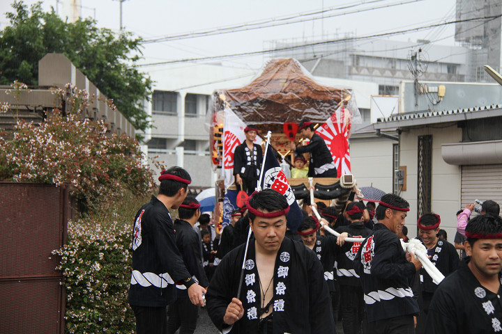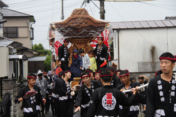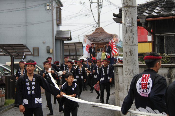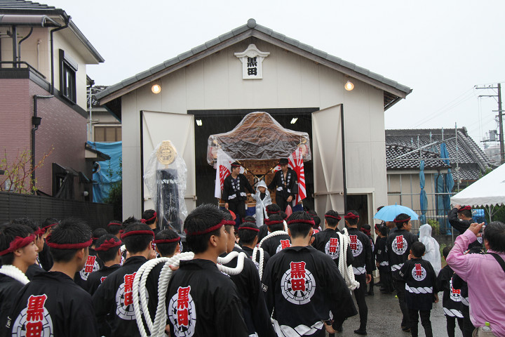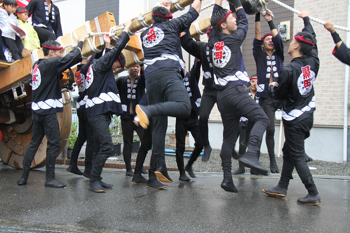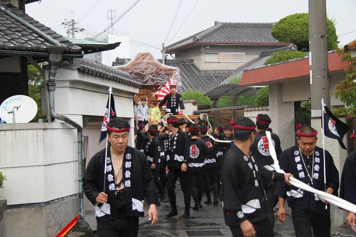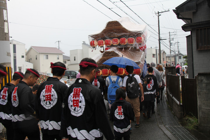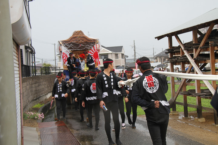 雨脚激しい中、必死に曳いている子供たちです。 |