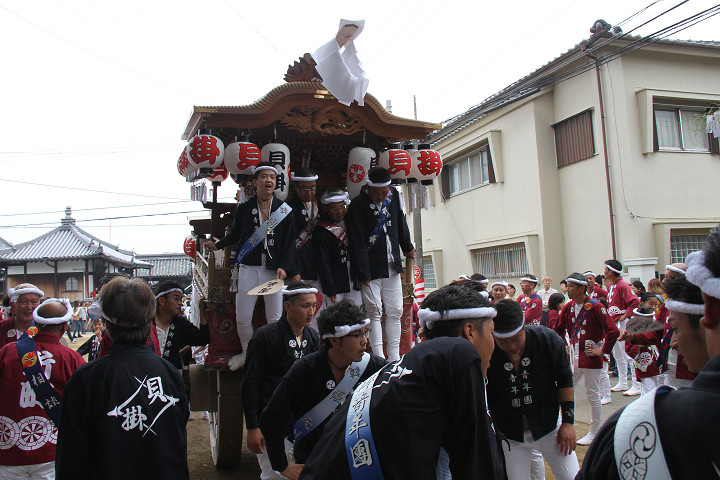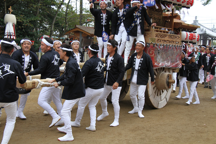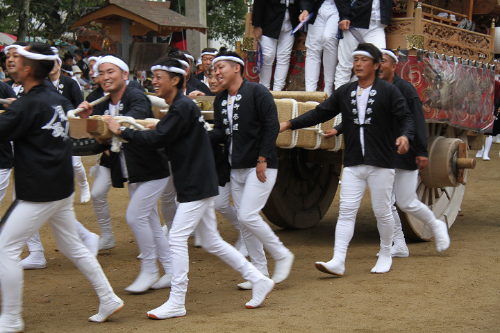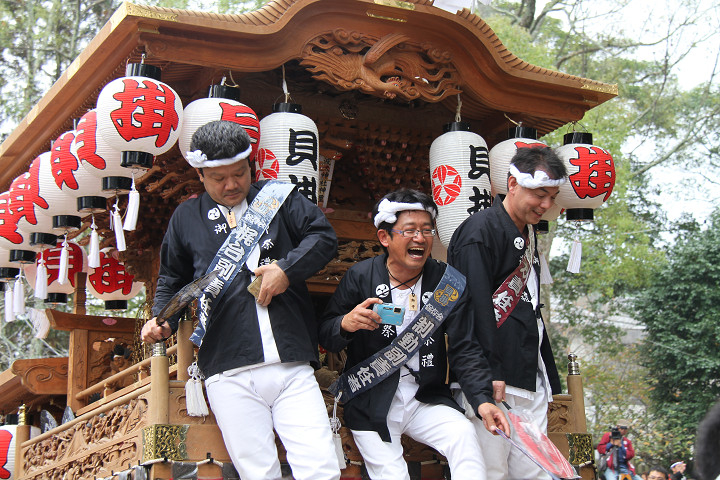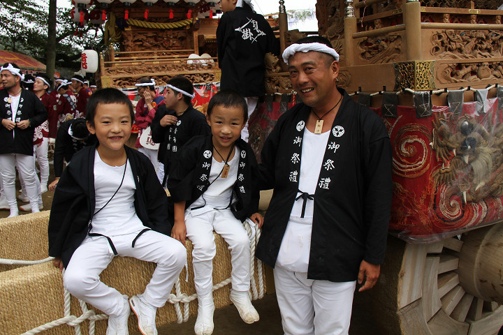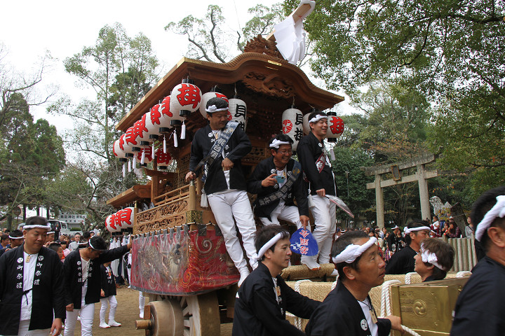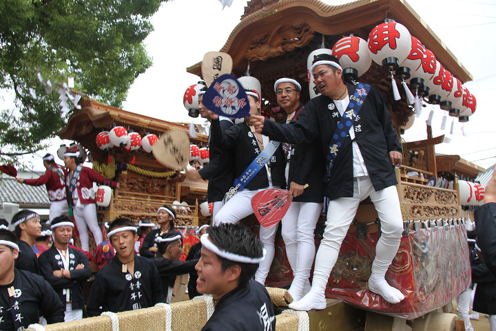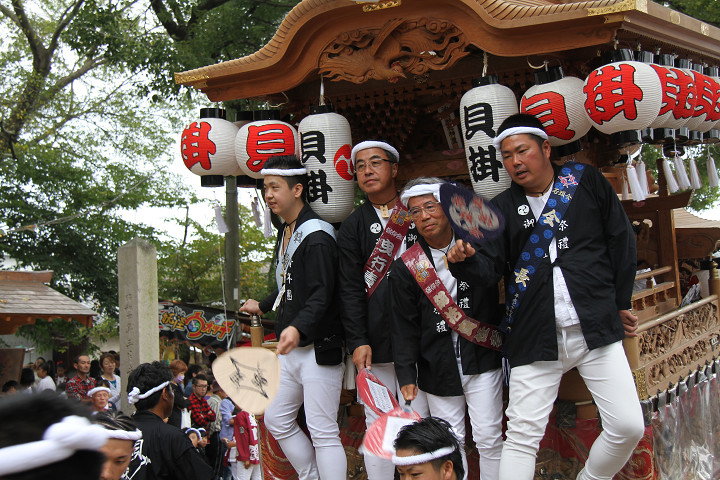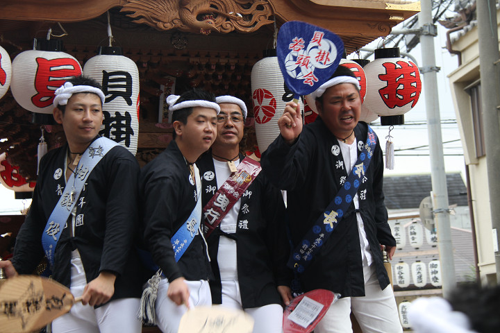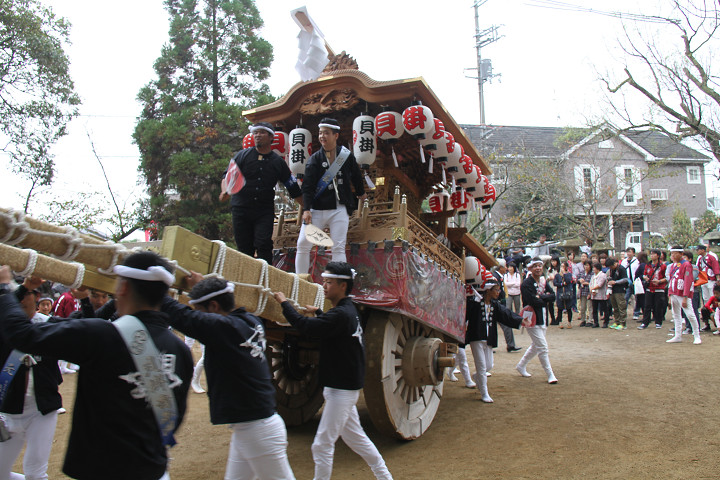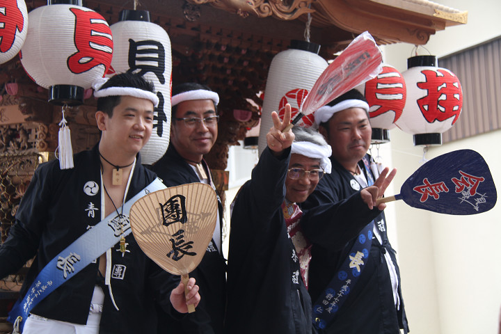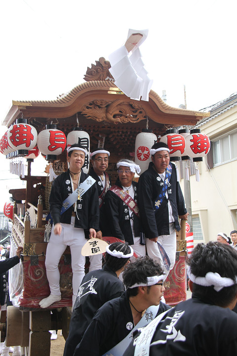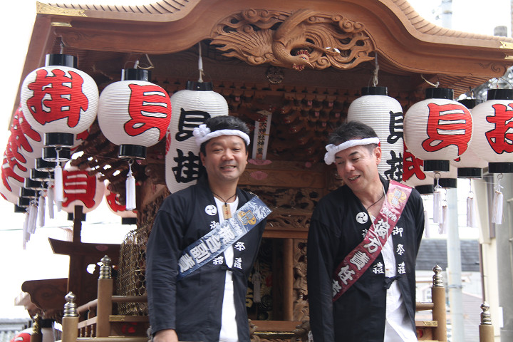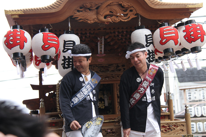 ![]() 10時40分、左より青年團團長・保存会会長・自治会会長・ 若頭会会長の四役が乗り、いよいよ宮上がり。 |