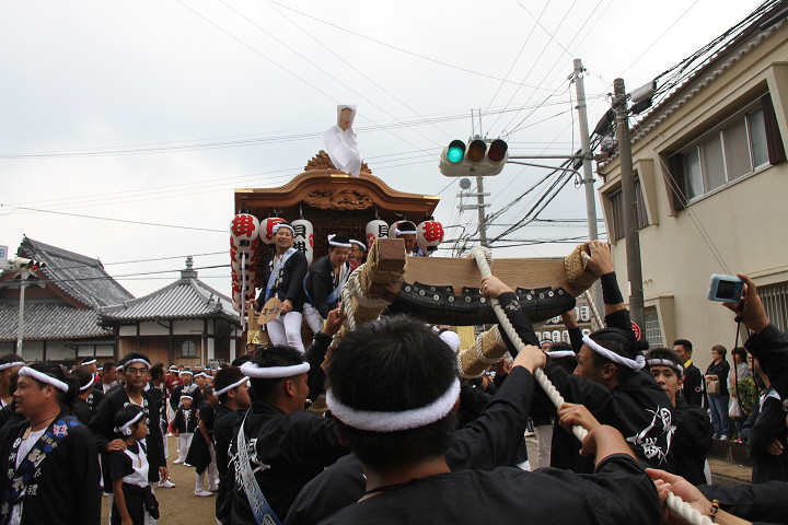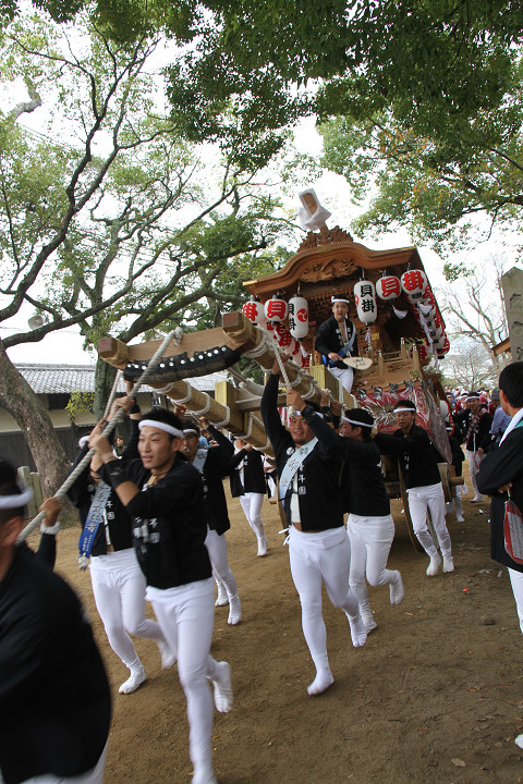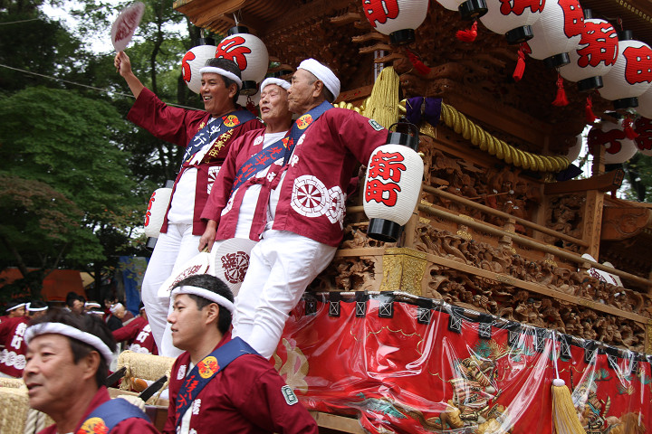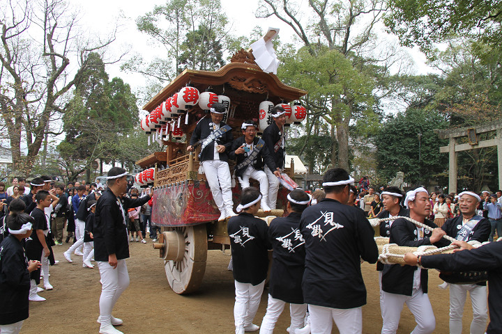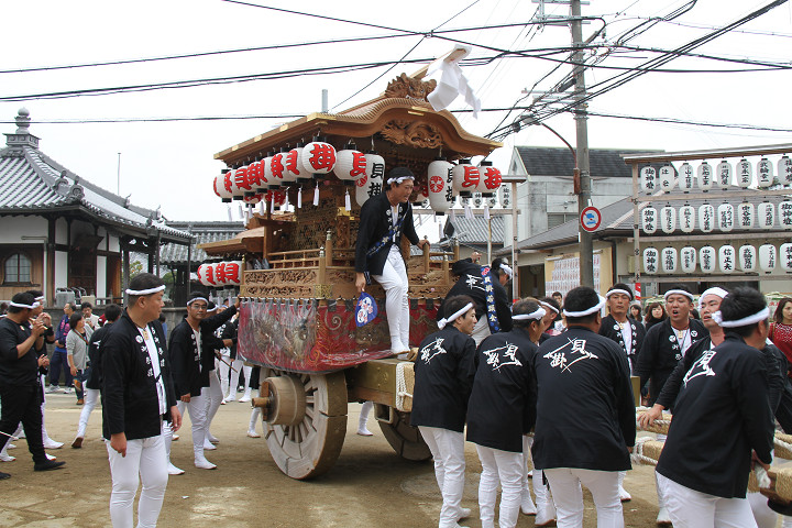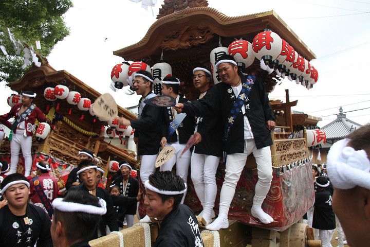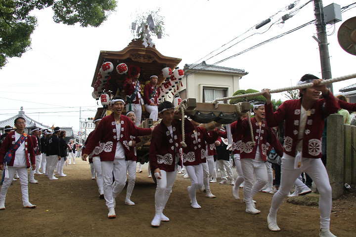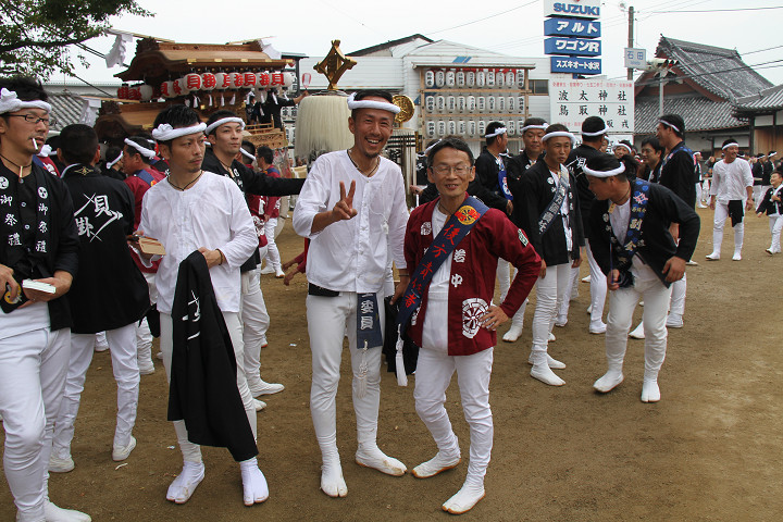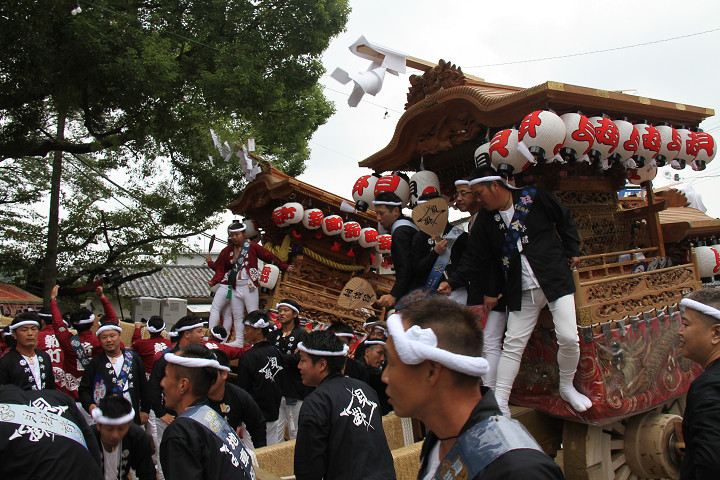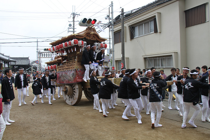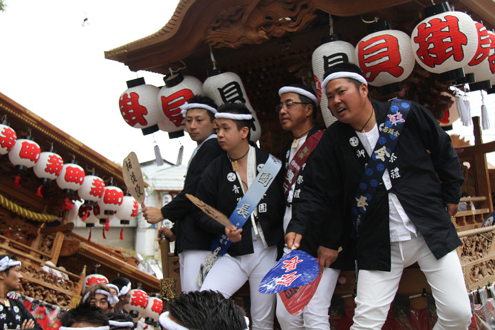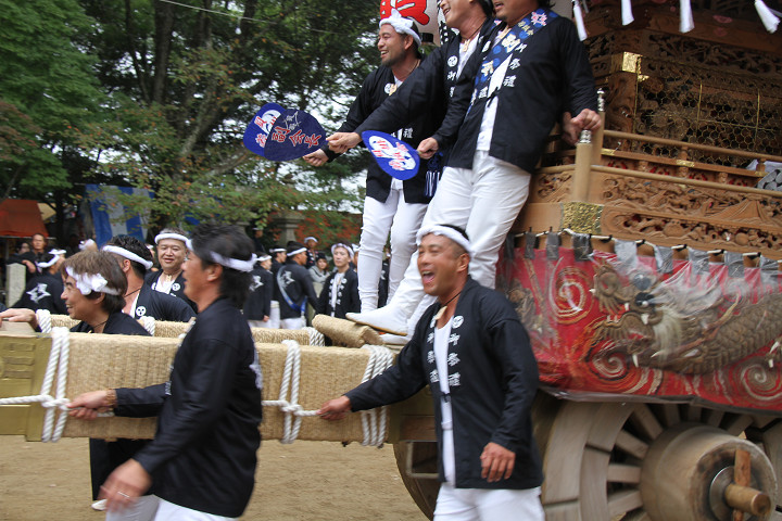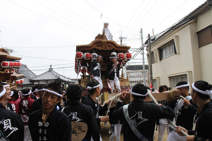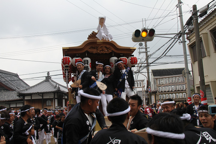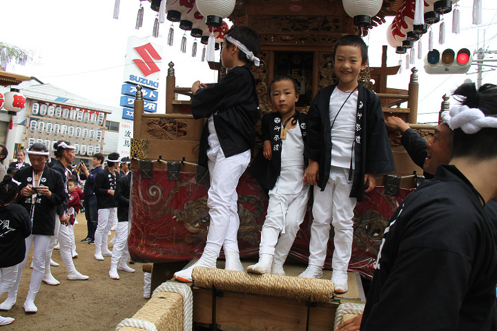 ![]() 10時40分、左より青年團團長・保存会会長・自治会会長・ 若頭会会長の四役が乗り、いよいよ宮上がり。 |