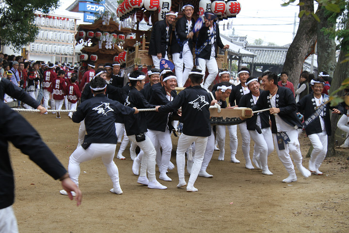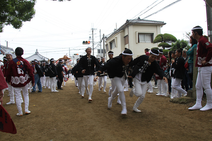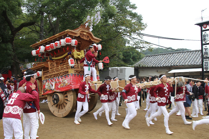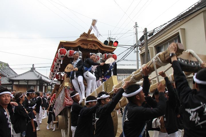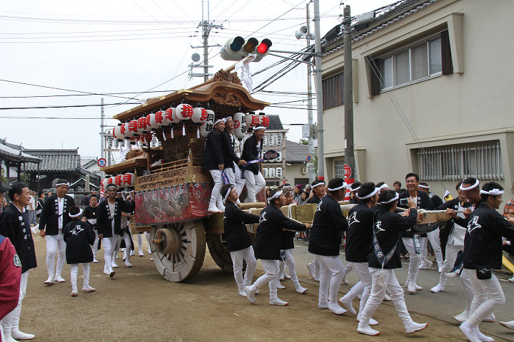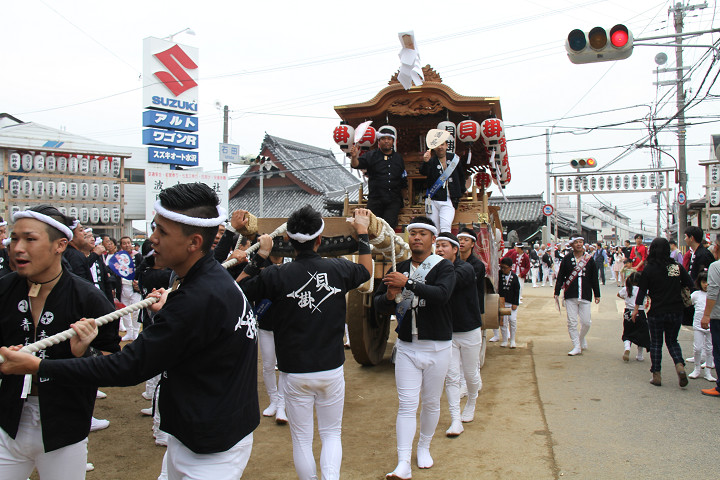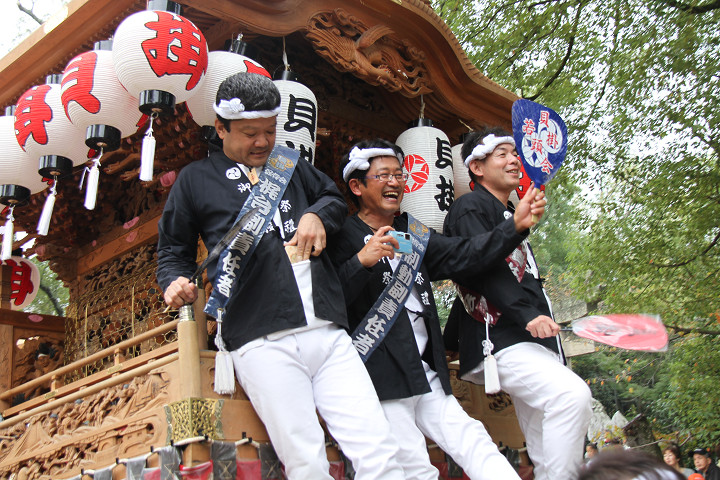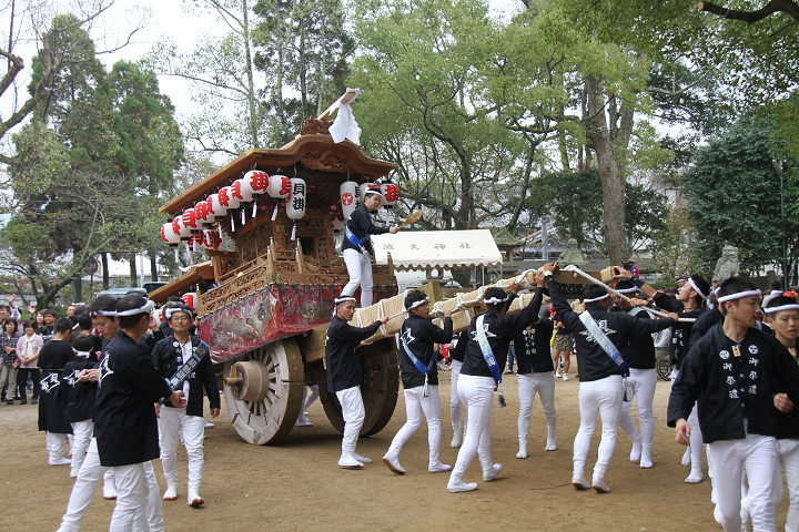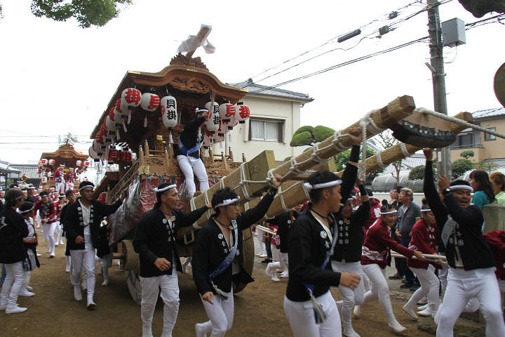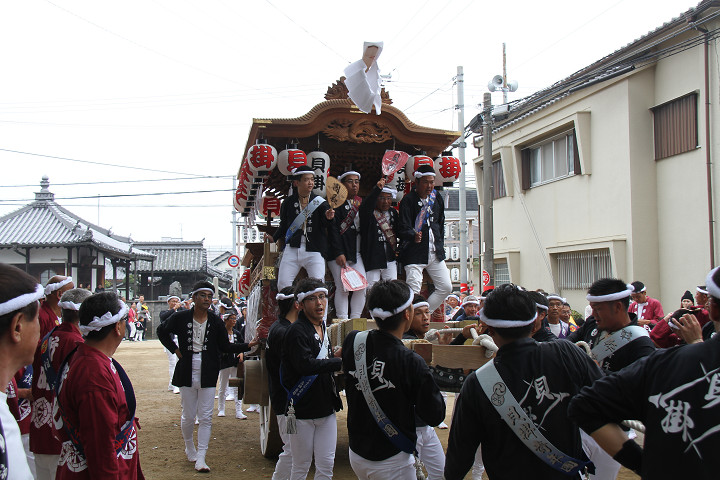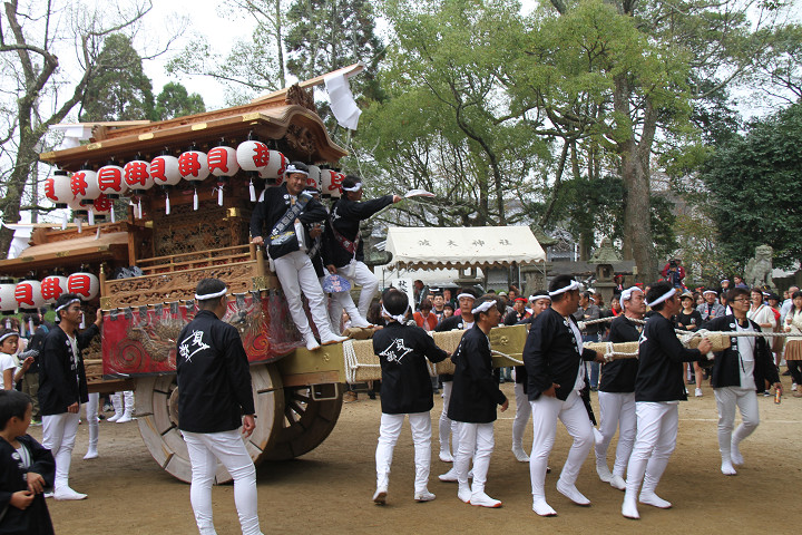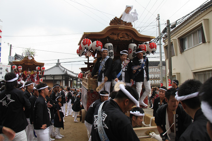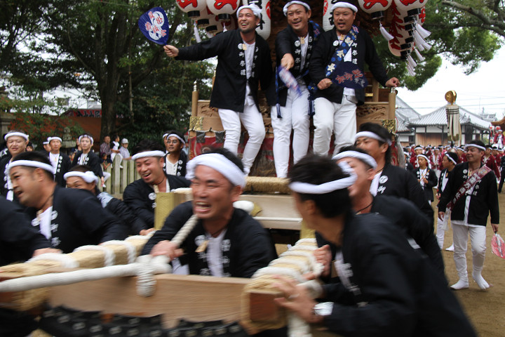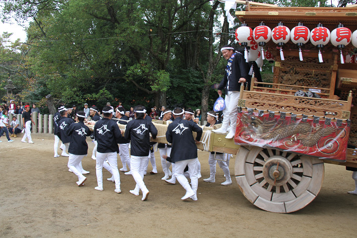 ![]() 10時40分、左より青年團團長・保存会会長・自治会会長・ 若頭会会長の四役が乗り、いよいよ宮上がり。 |