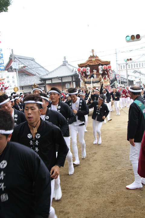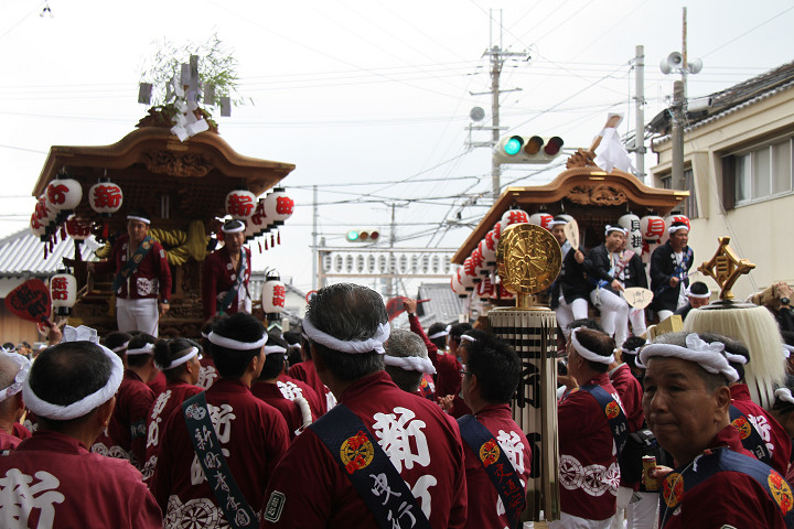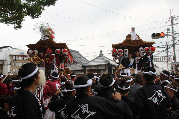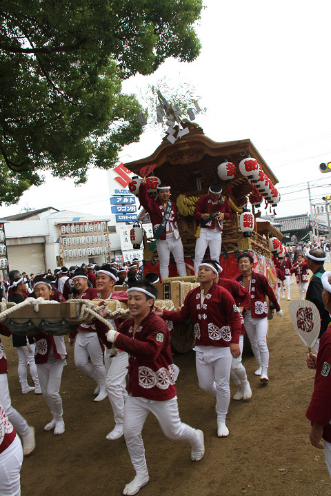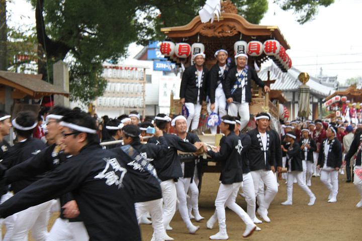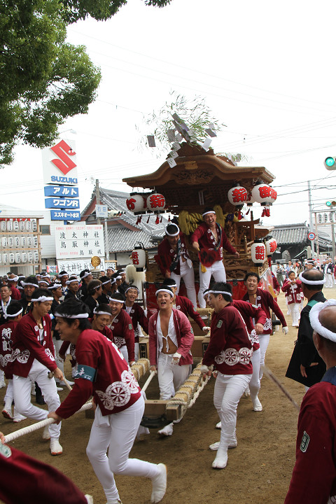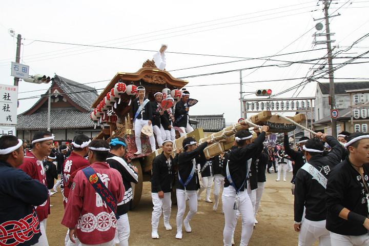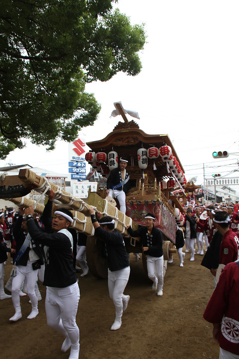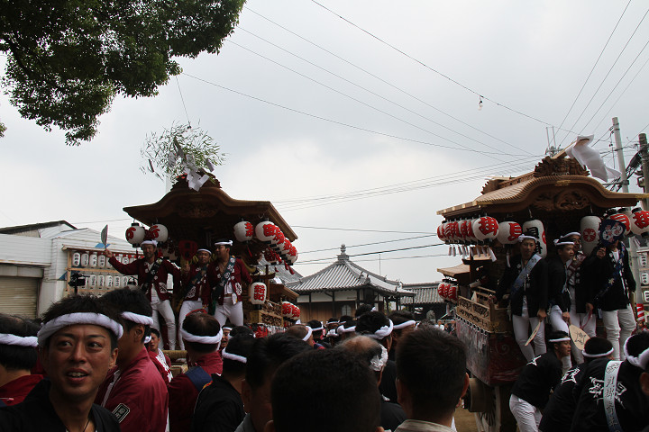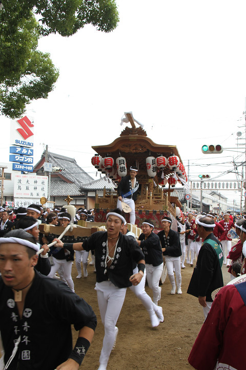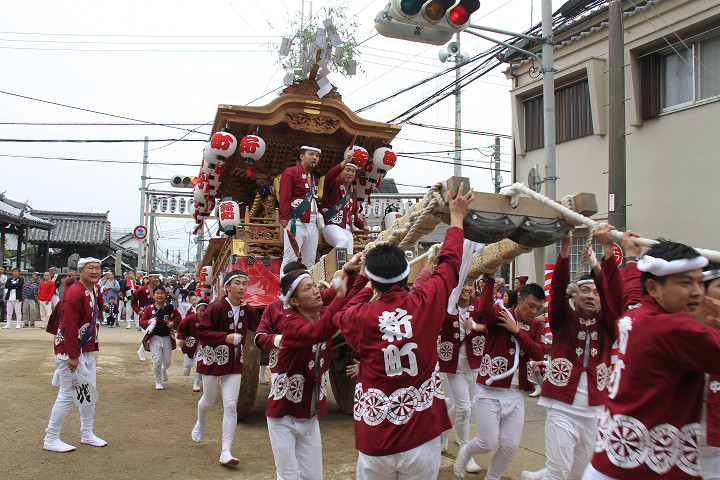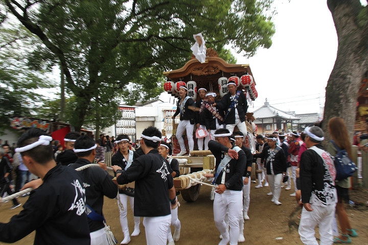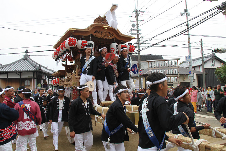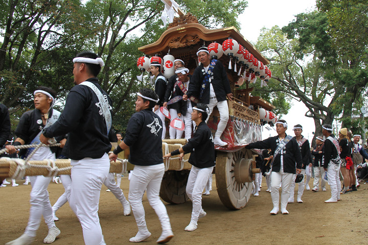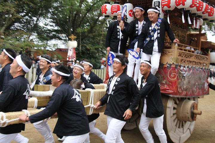 ![]() 10時40分、左より青年團團長・保存会会長・自治会会長・ 若頭会会長の四役が乗り、いよいよ宮上がり。 |