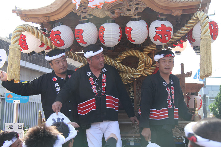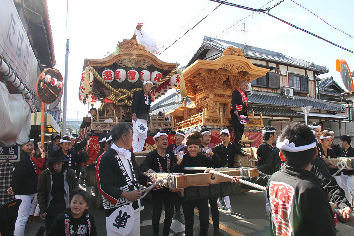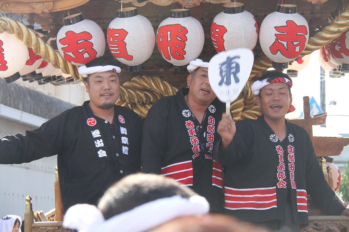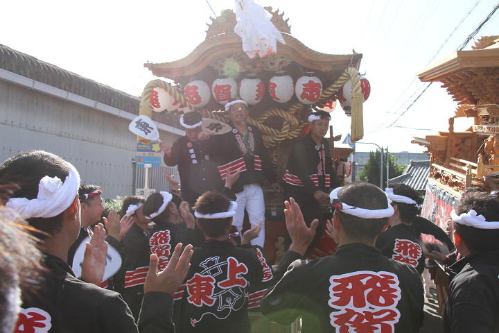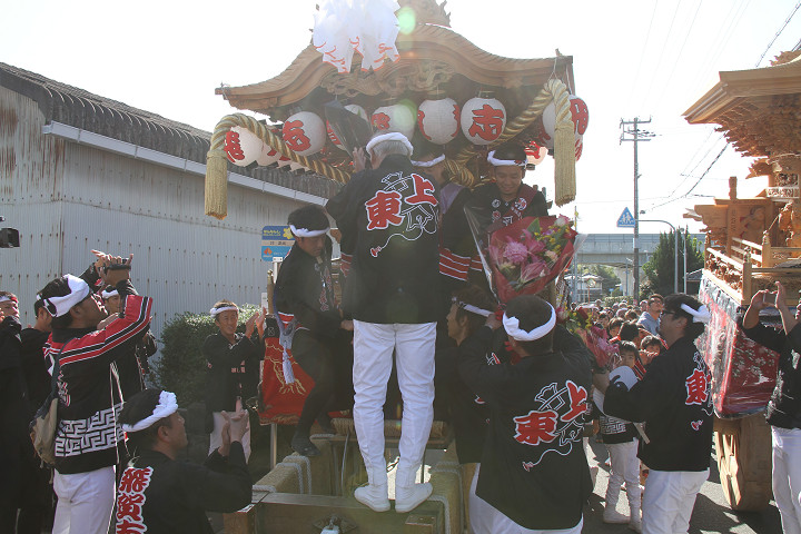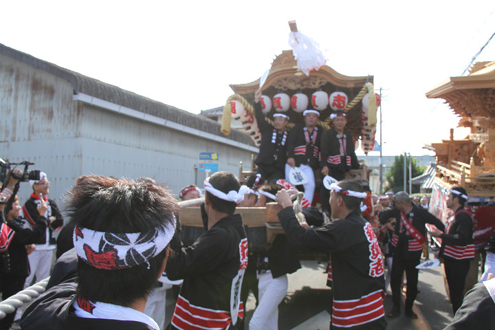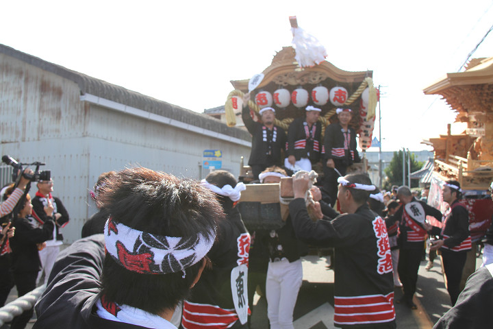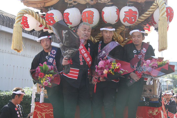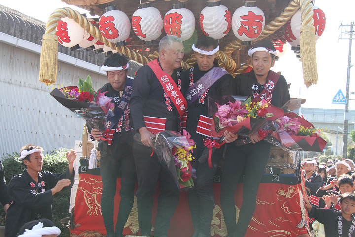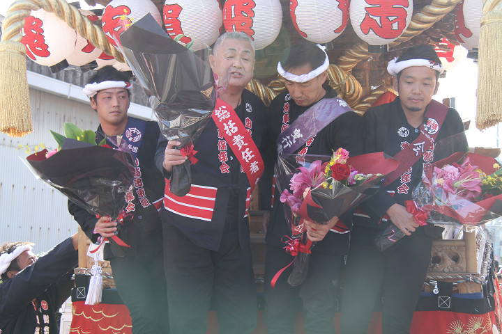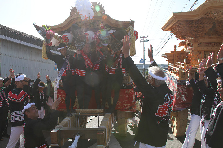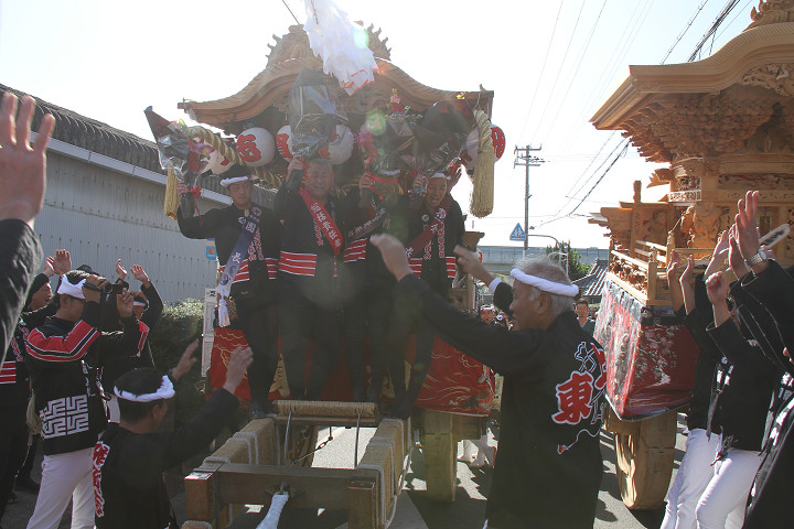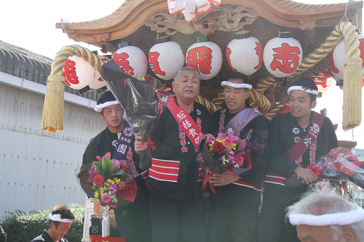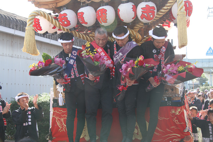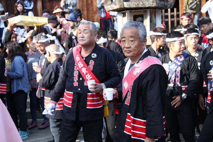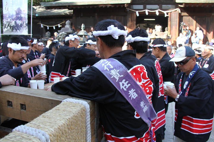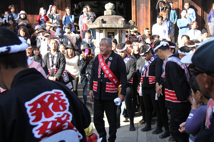![]() 双方の自治会長が互いのやぐらに乗ります。 |