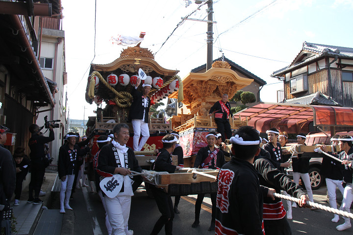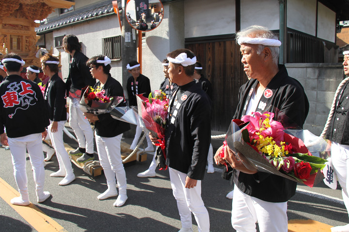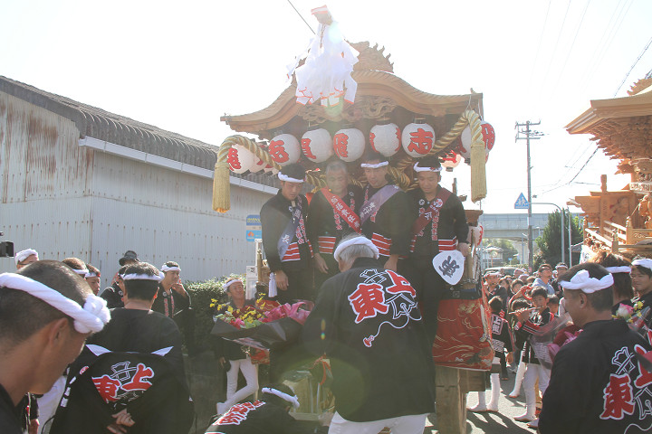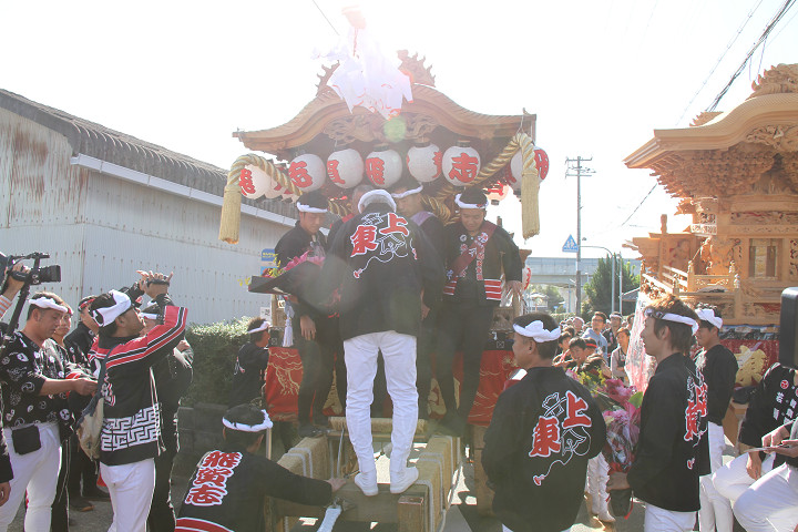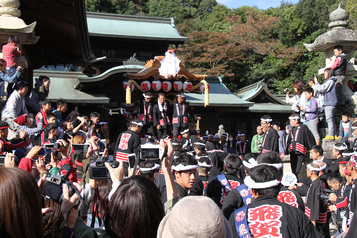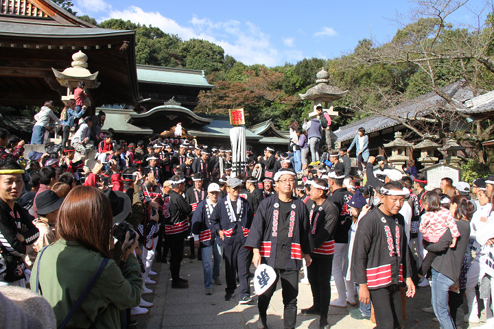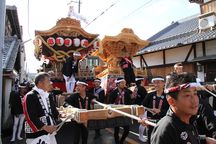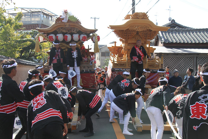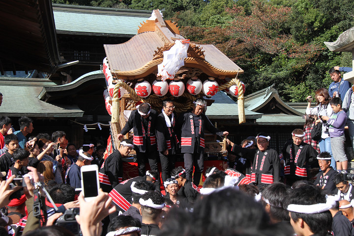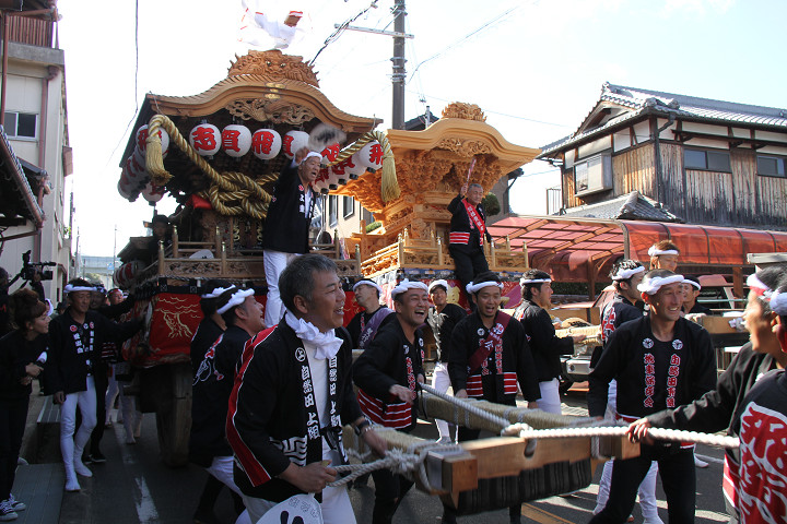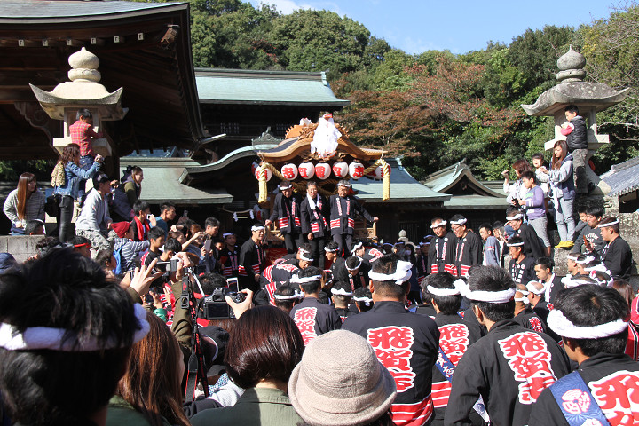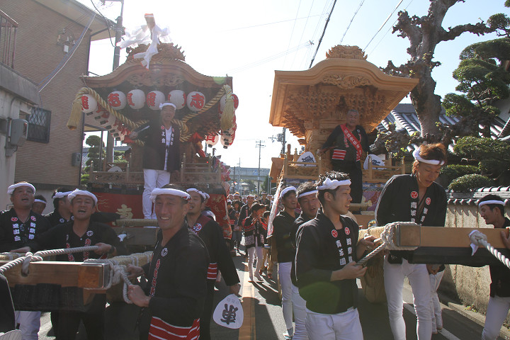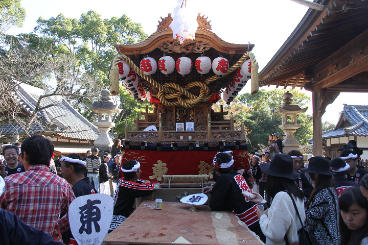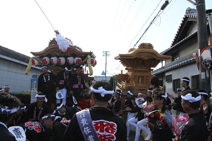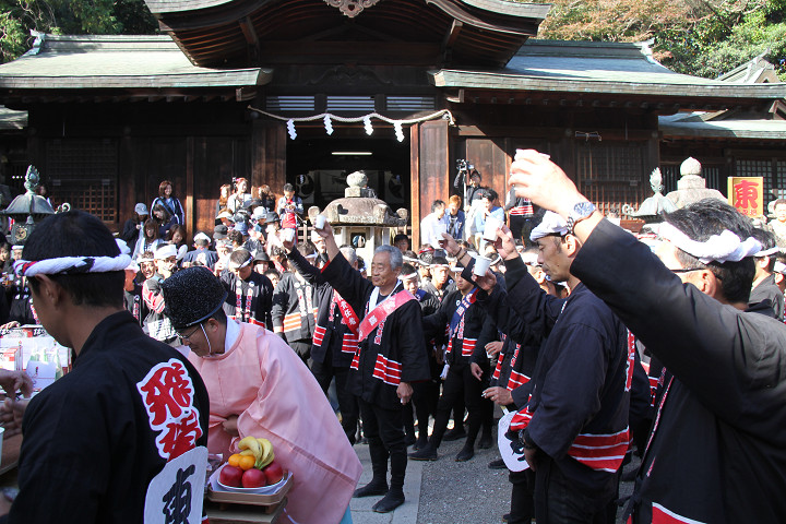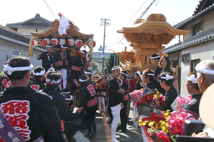 ![]() 双方の自治会長が互いのやぐらに乗ります。 |