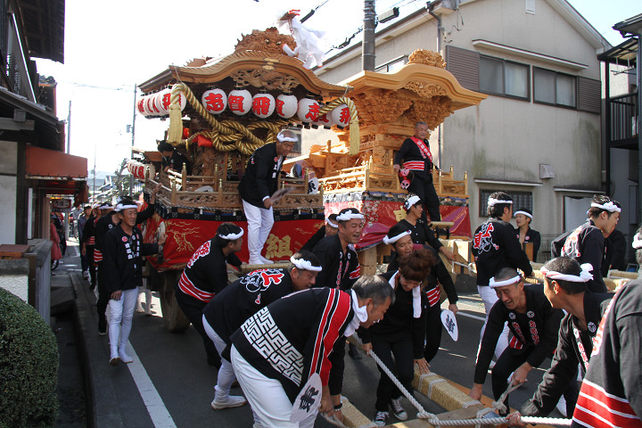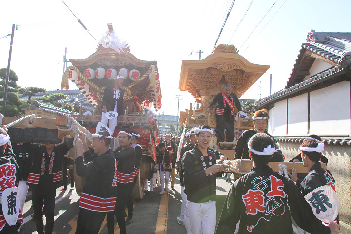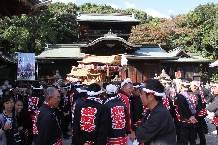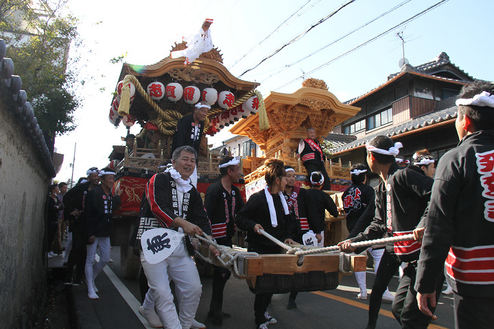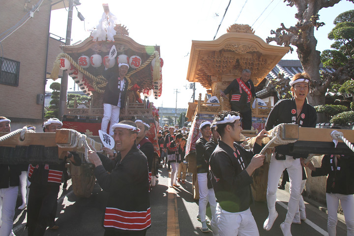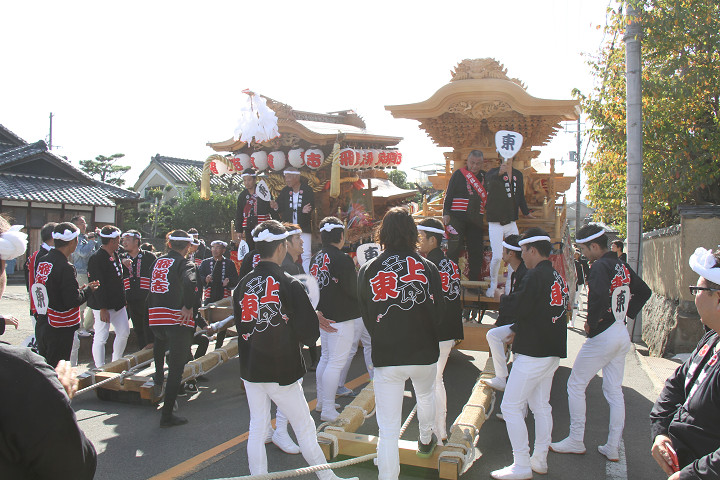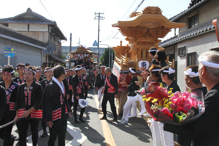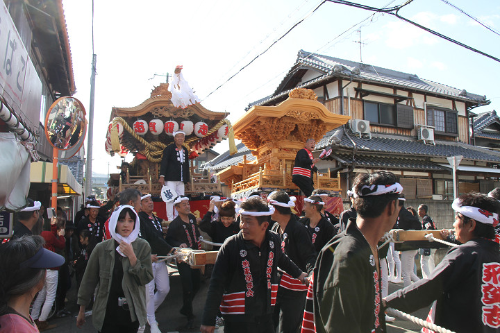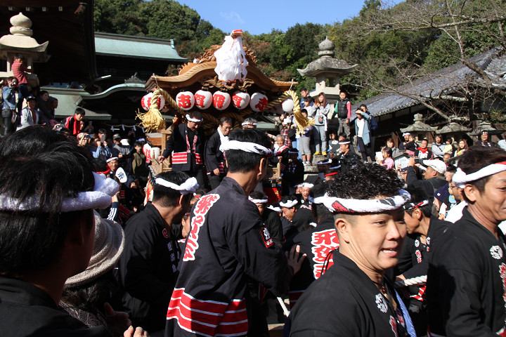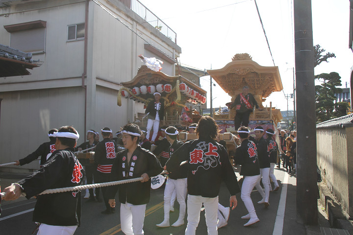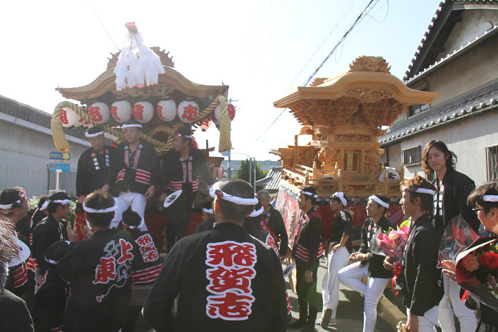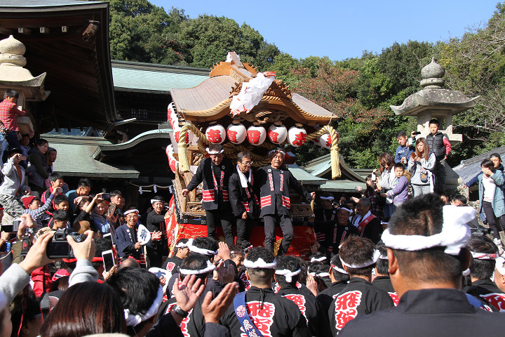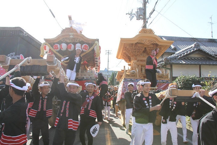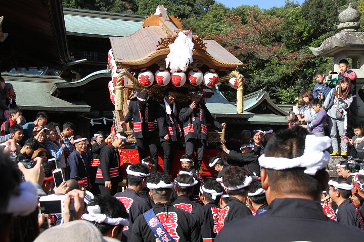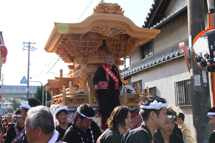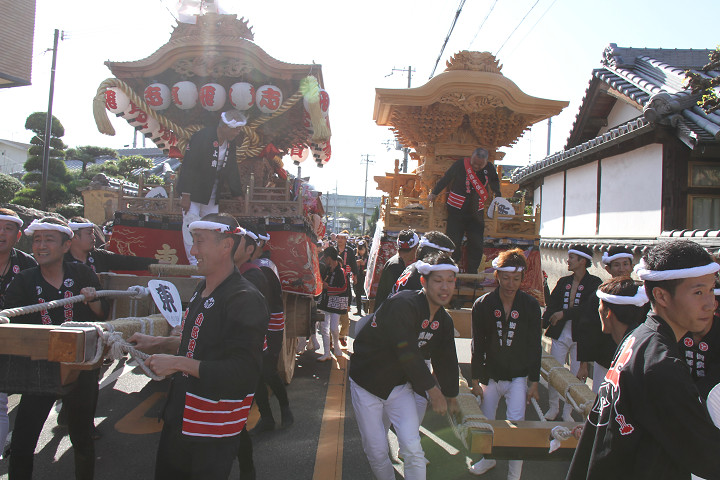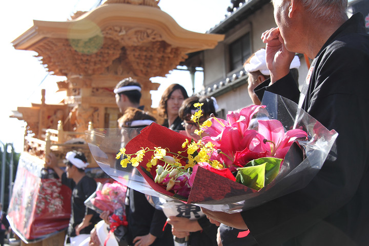 ![]() 双方の自治会長が互いのやぐらに乗ります。 |