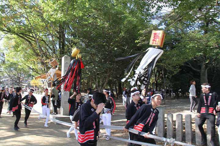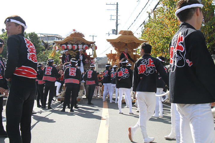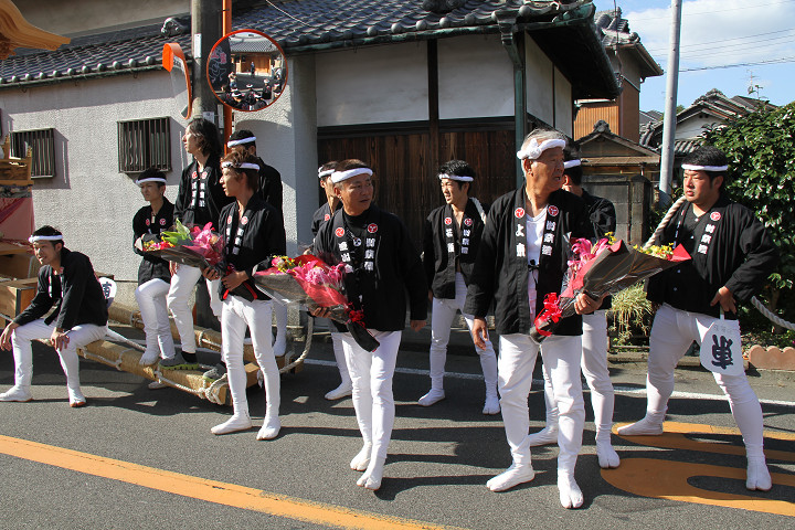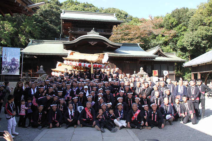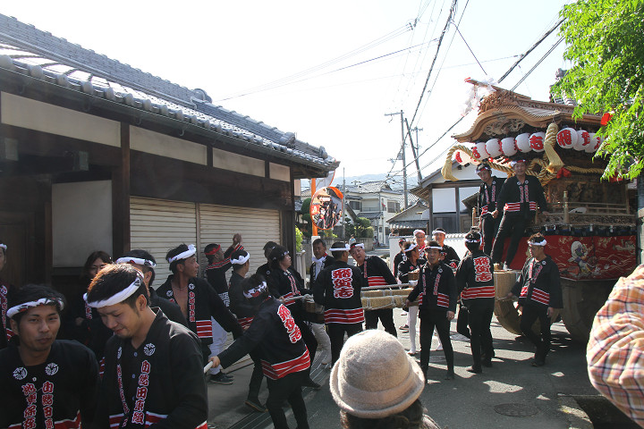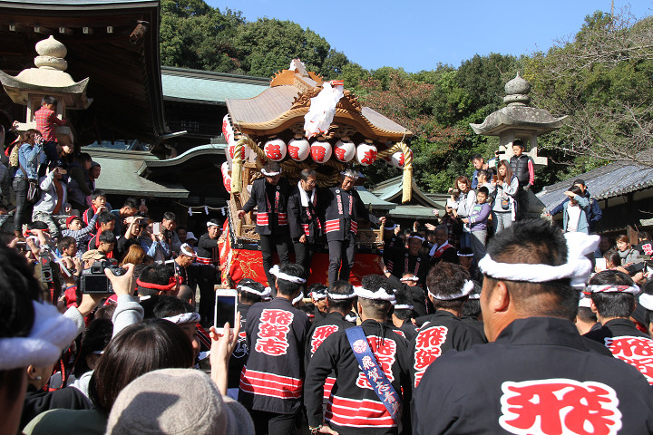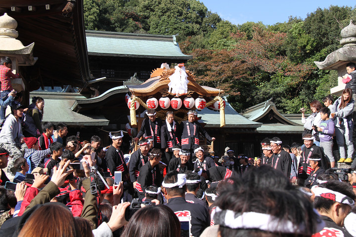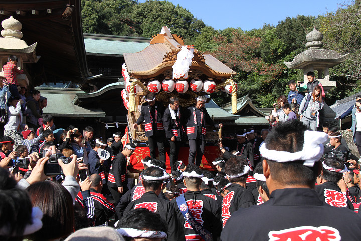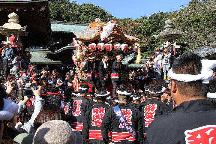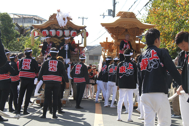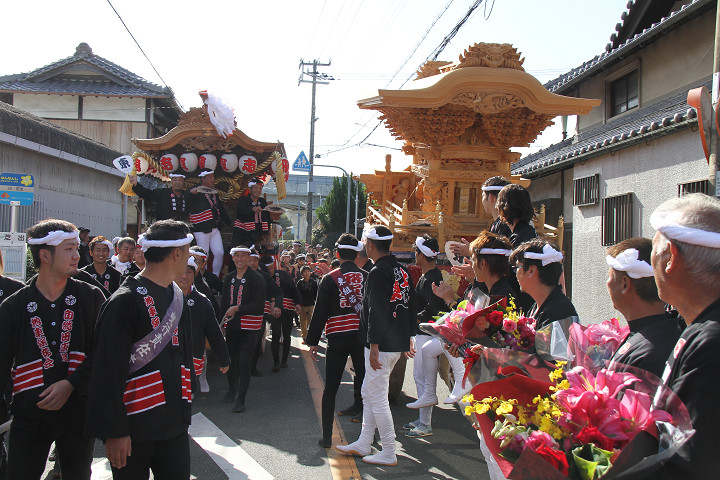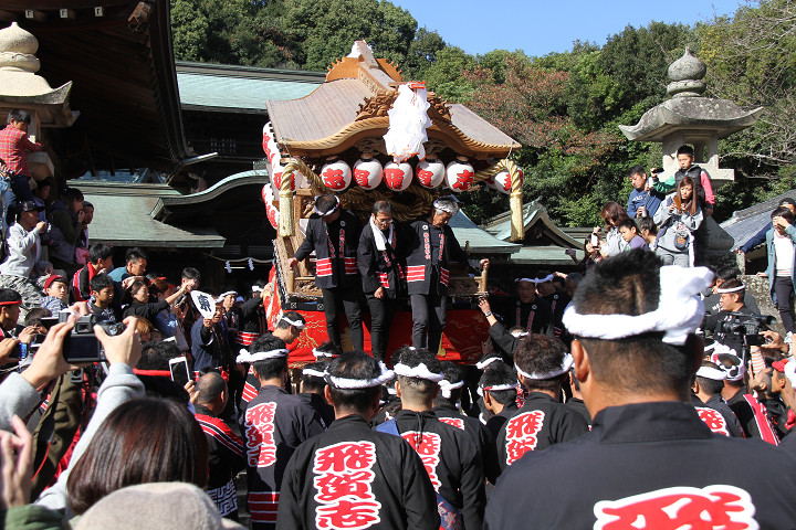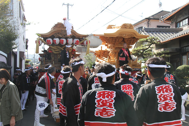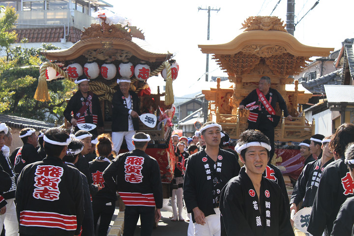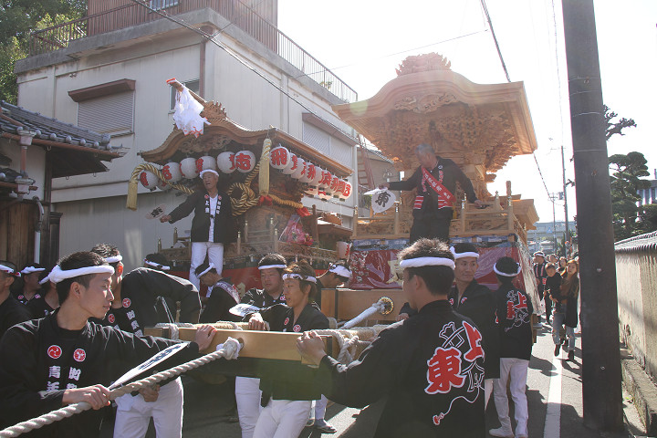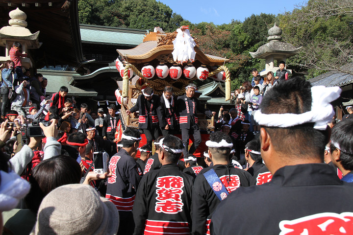 ![]() 双方の自治会長が互いのやぐらに乗ります。 |