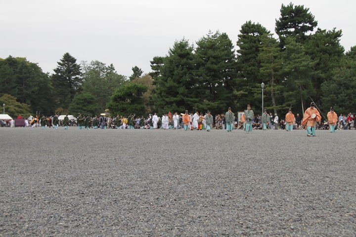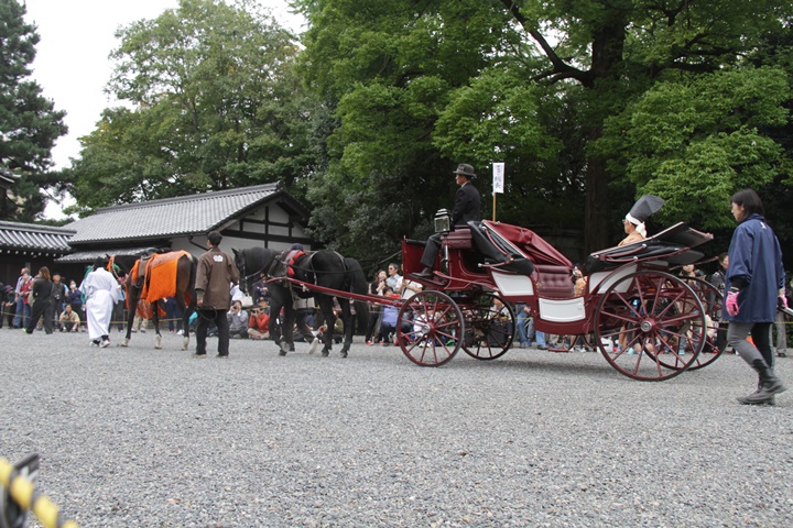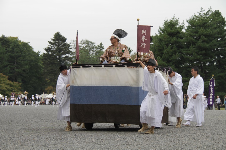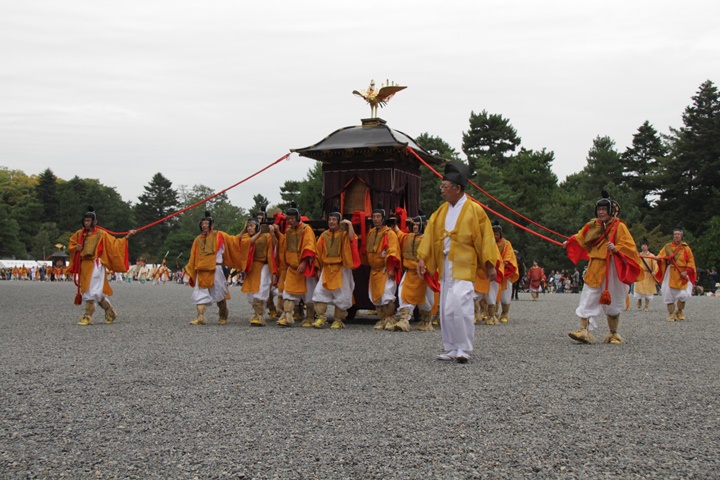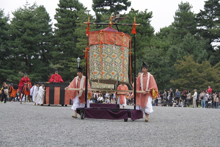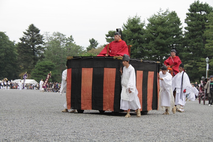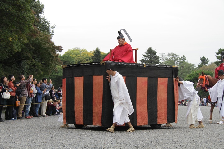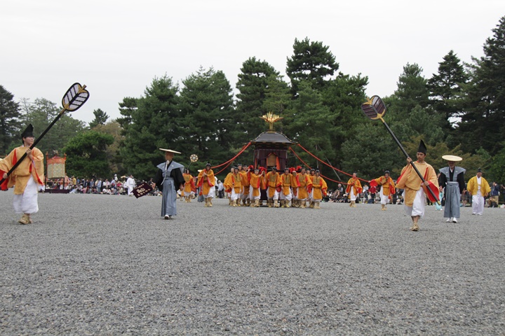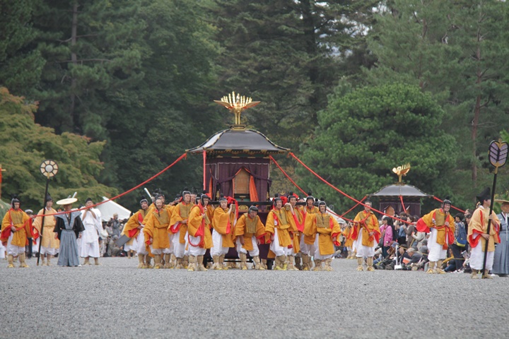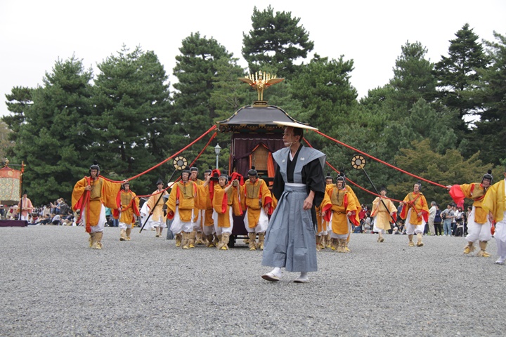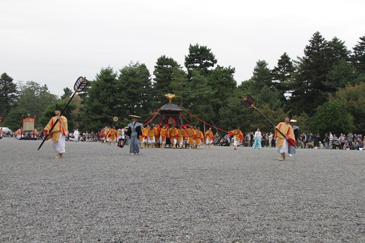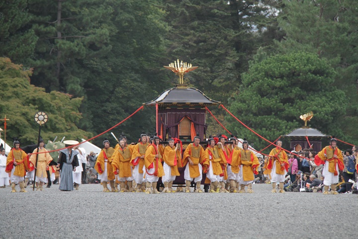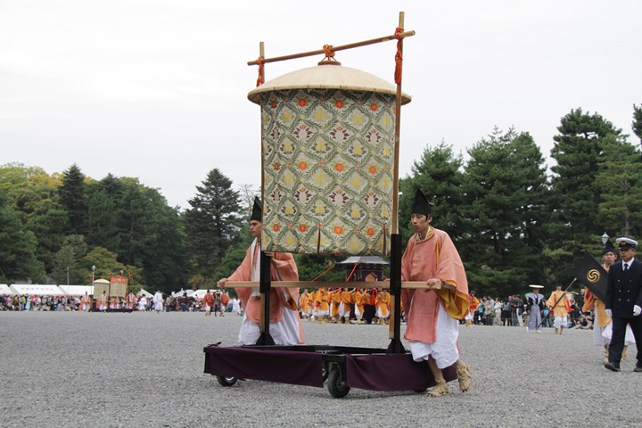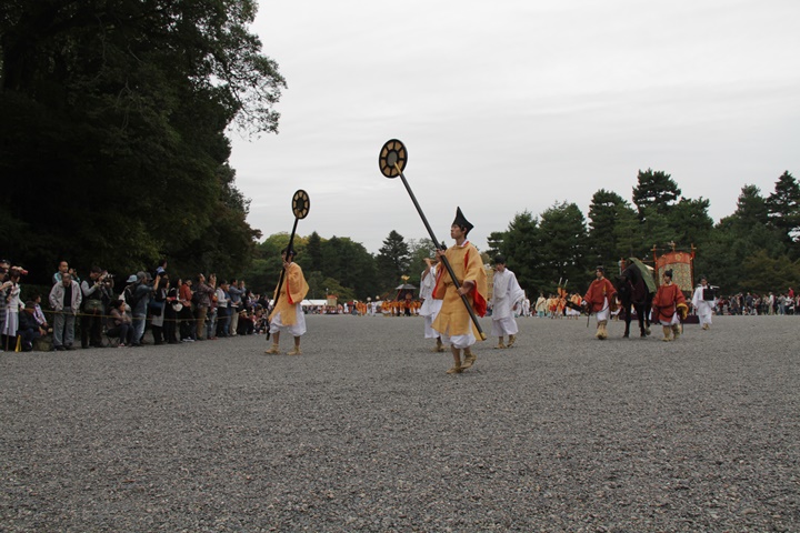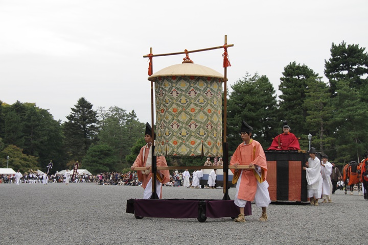 | 結局時代祭の列は2時間ほど連なり終わったのが14時過ぎでした。場所取りのために10時からの4時間、ずっと同じ場所で座っていた訳で少々疲れました。でも念願だった時代祭、やっと見れました。現地で時代祭のパンフレットを購入したのですが時代祭って平安神宮の例大祭だと初めて知りました。平安神宮の御祭神である孝明天皇、桓武天皇の御鳳輦も見れてとても良かったです。 |