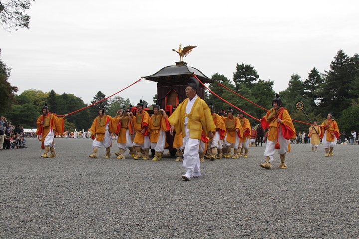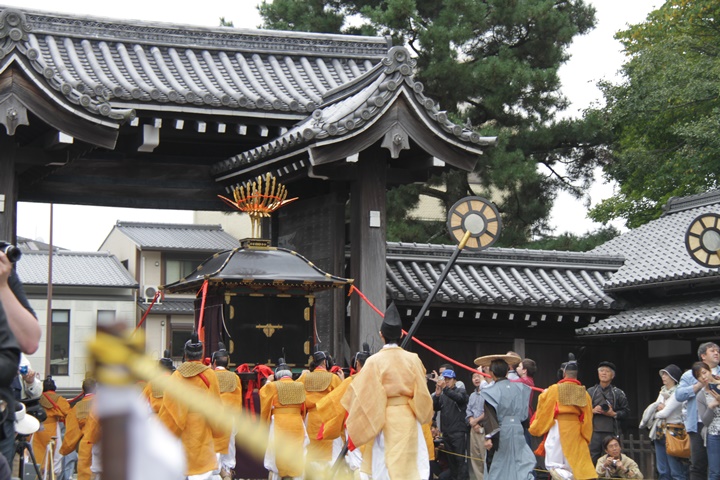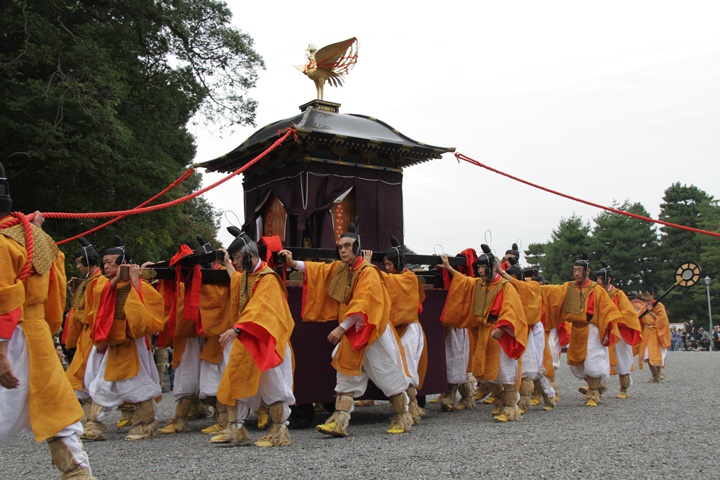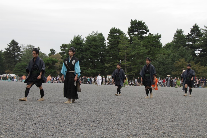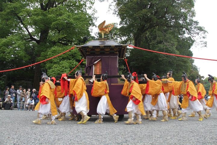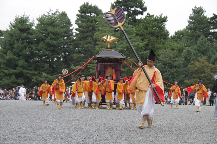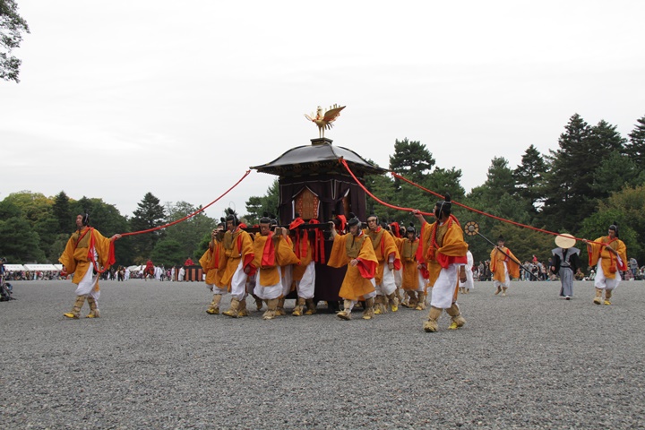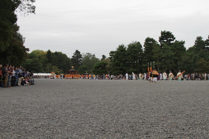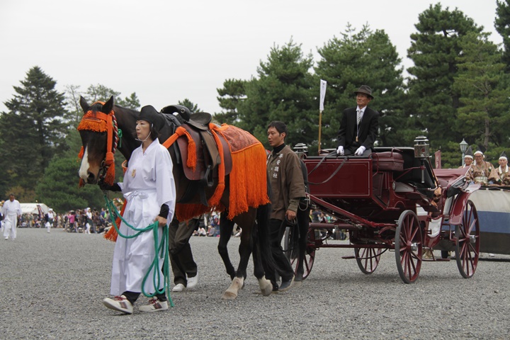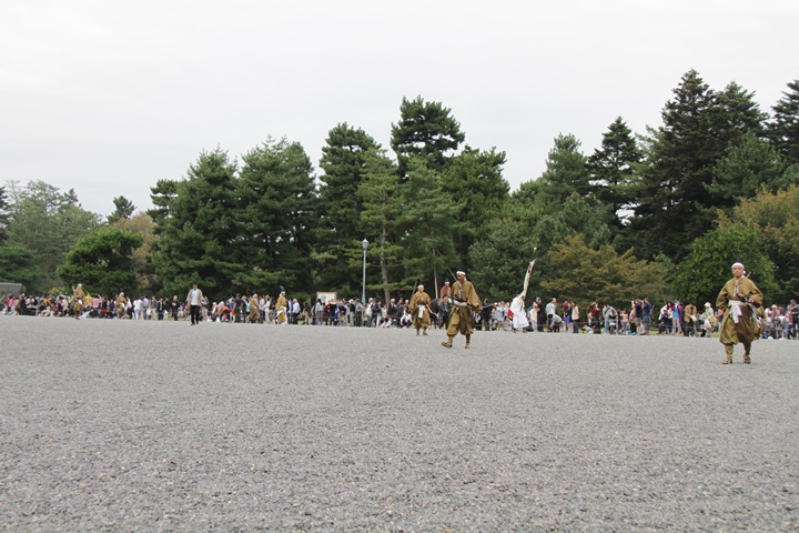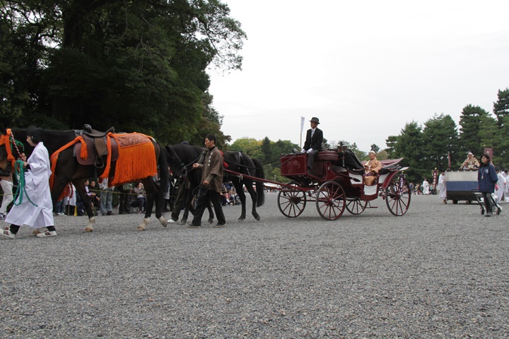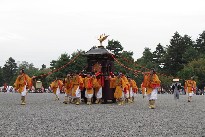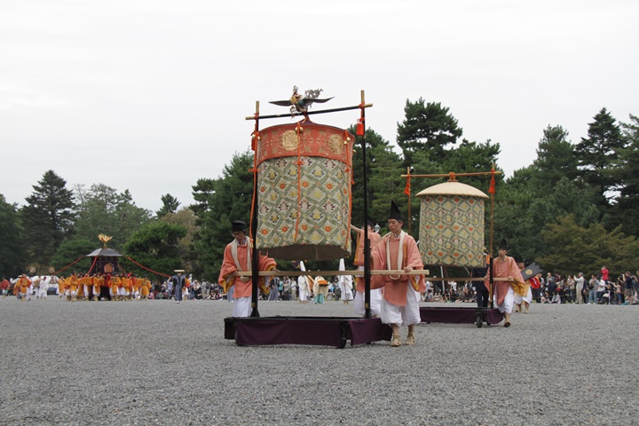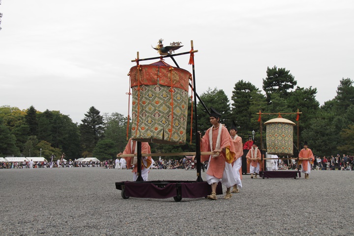 | 結局時代祭の列は2時間ほど連なり終わったのが14時過ぎでした。場所取りのために10時からの4時間、ずっと同じ場所で座っていた訳で少々疲れました。でも念願だった時代祭、やっと見れました。現地で時代祭のパンフレットを購入したのですが時代祭って平安神宮の例大祭だと初めて知りました。平安神宮の御祭神である孝明天皇、桓武天皇の御鳳輦も見れてとても良かったです。 |