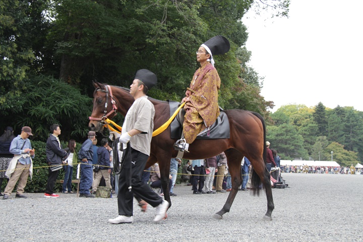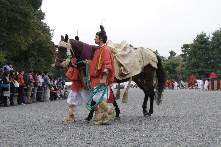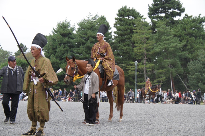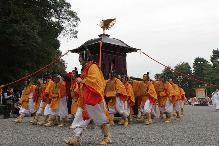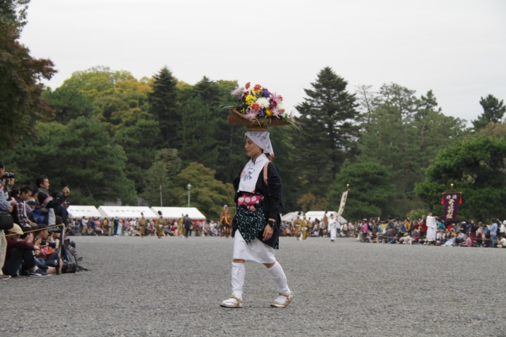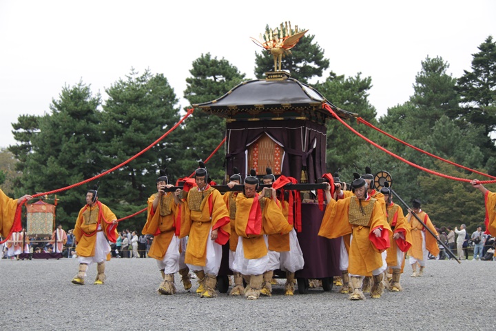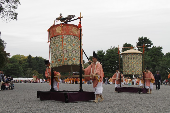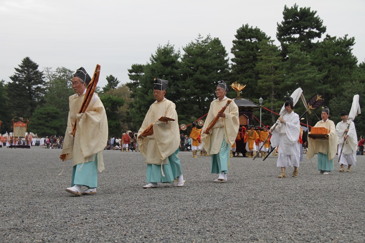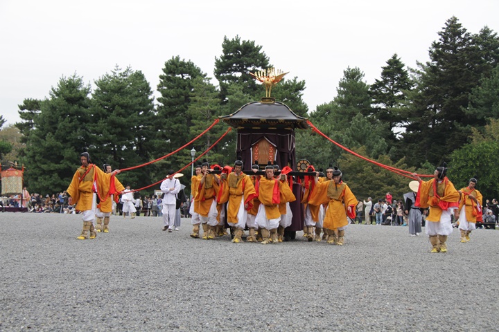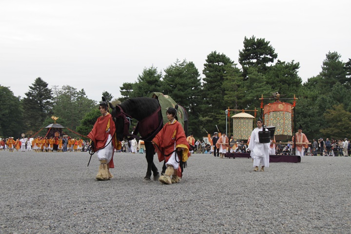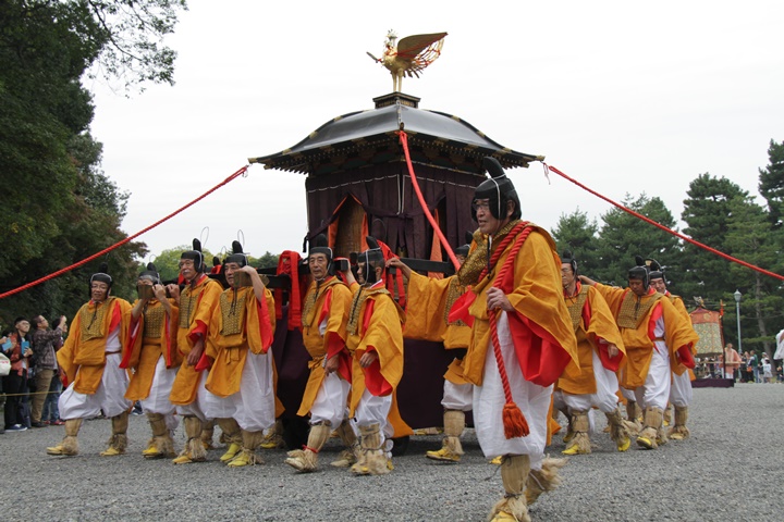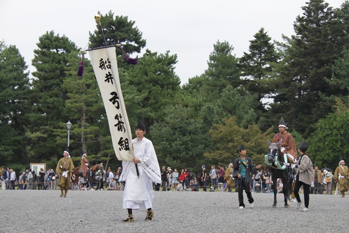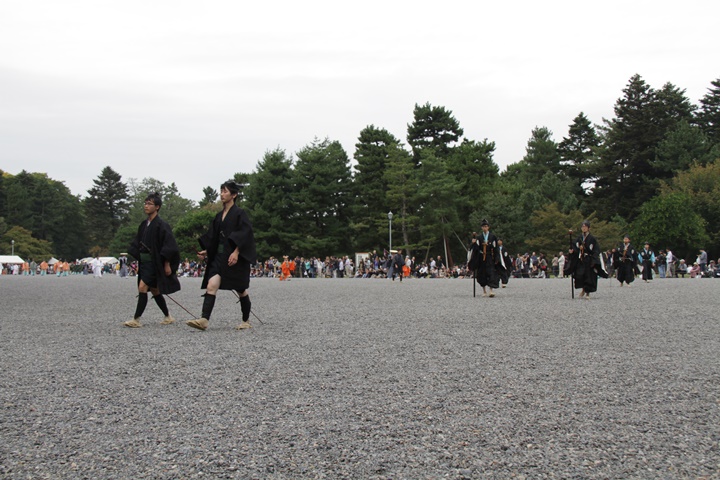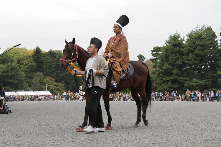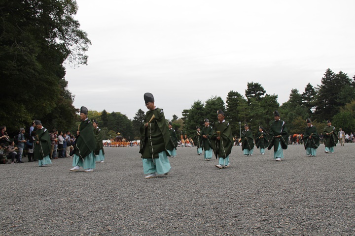 | 結局時代祭の列は2時間ほど連なり終わったのが14時過ぎでした。場所取りのために10時からの4時間、ずっと同じ場所で座っていた訳で少々疲れました。でも念願だった時代祭、やっと見れました。現地で時代祭のパンフレットを購入したのですが時代祭って平安神宮の例大祭だと初めて知りました。平安神宮の御祭神である孝明天皇、桓武天皇の御鳳輦も見れてとても良かったです。 |