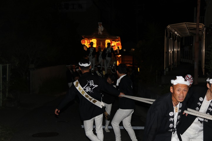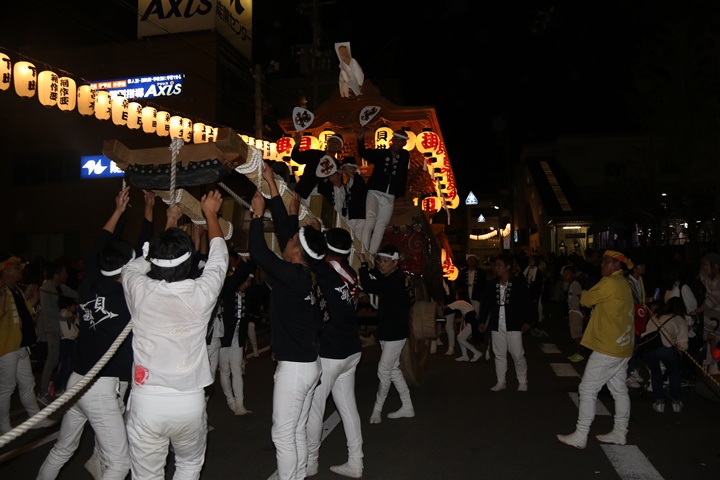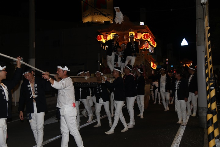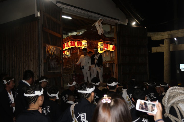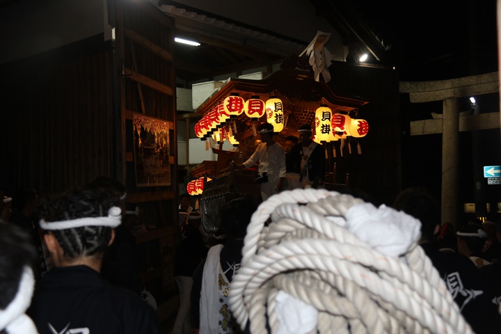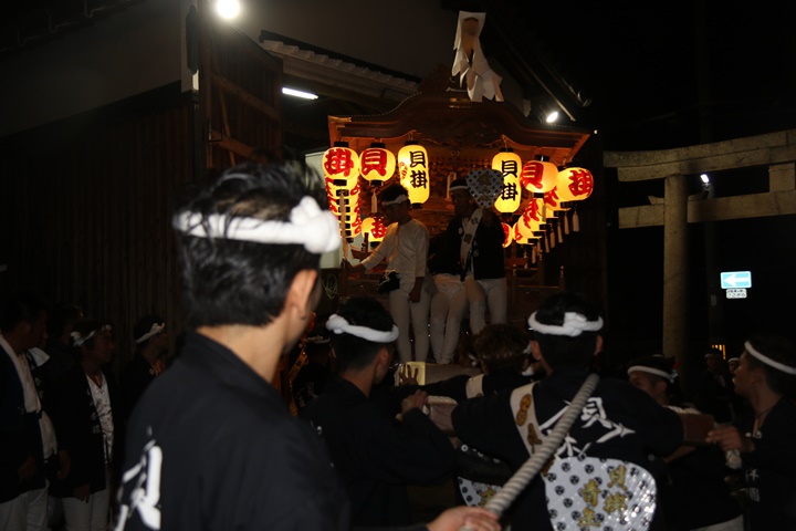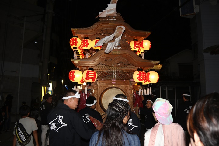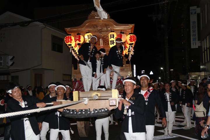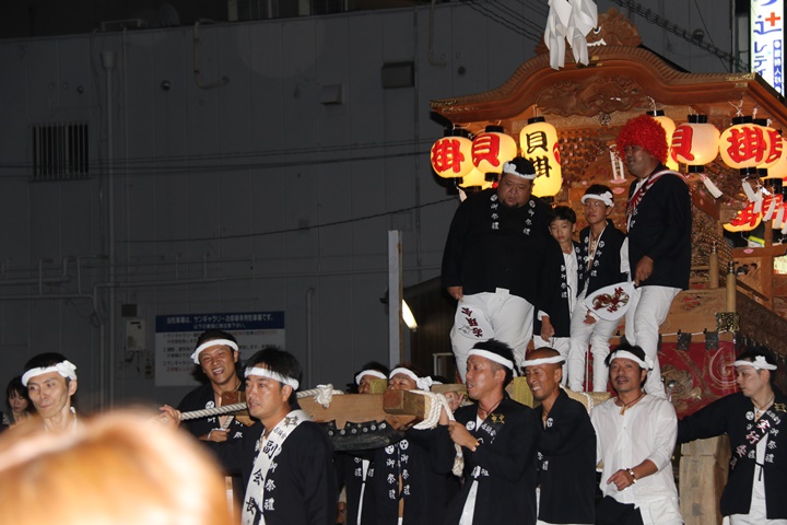 ![]() 泉南警察署前へ先まわり、貝掛の前には波有手組のやぐら。 |