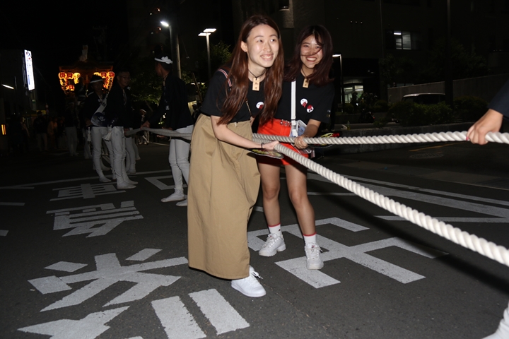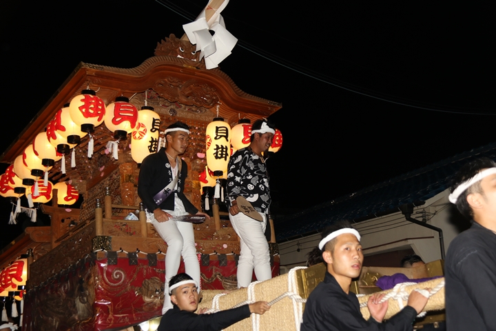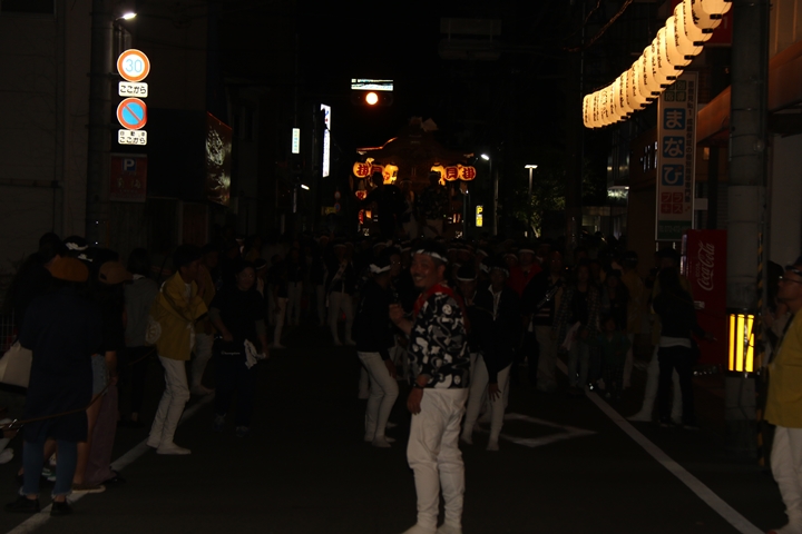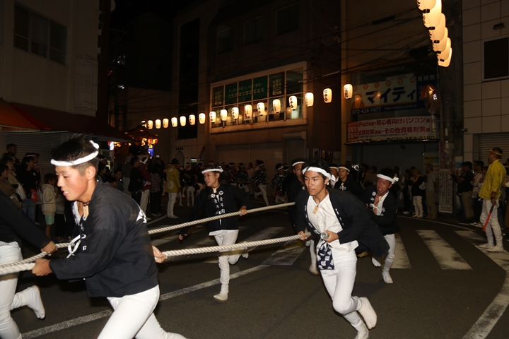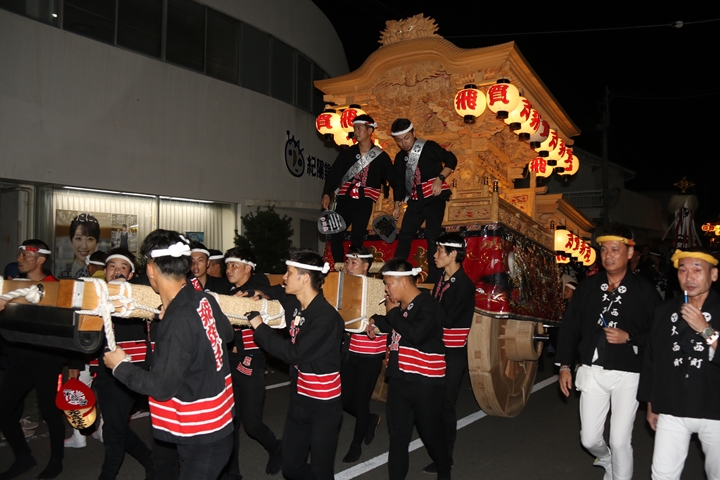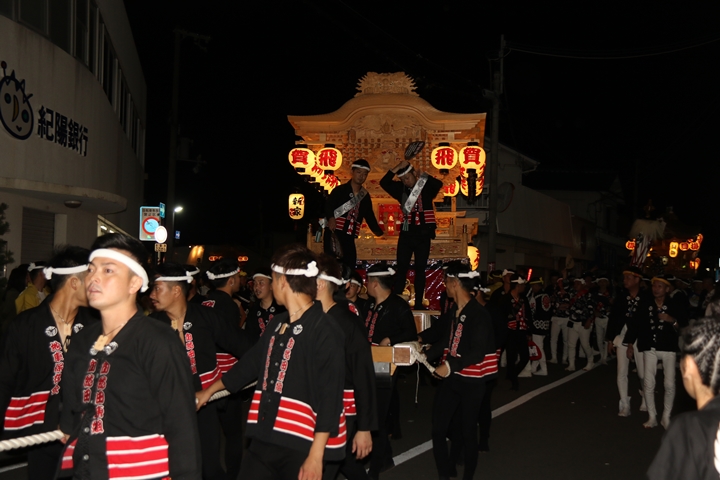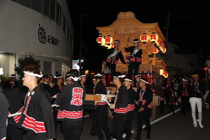 紀陽銀行前にて燈入れ曳行を撮影します。 |