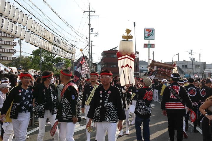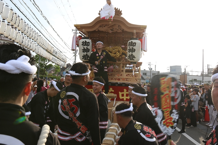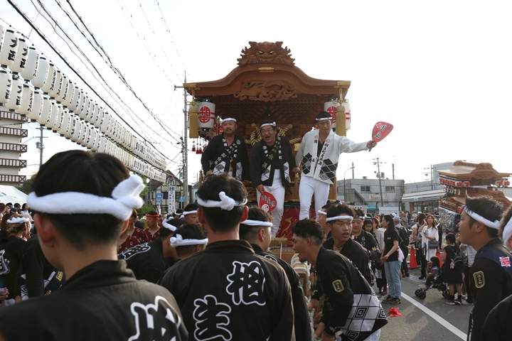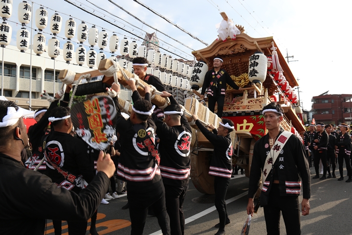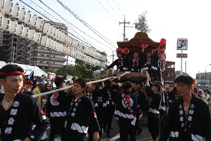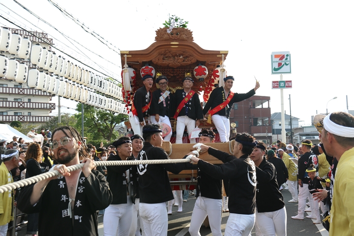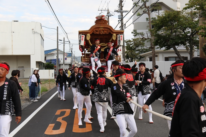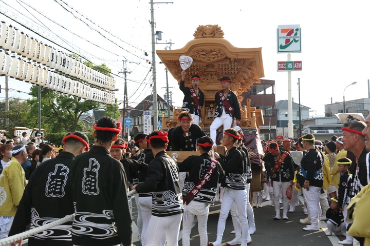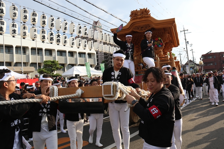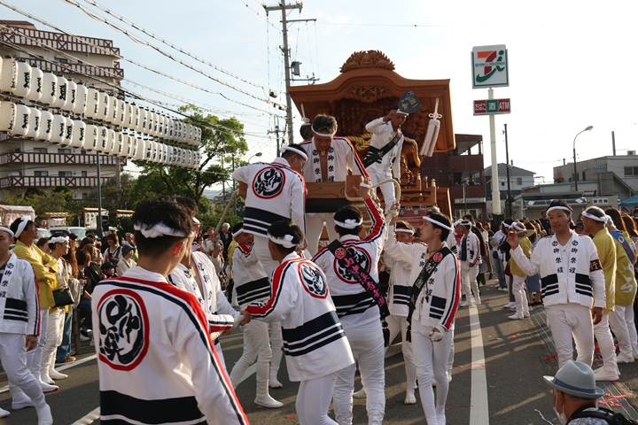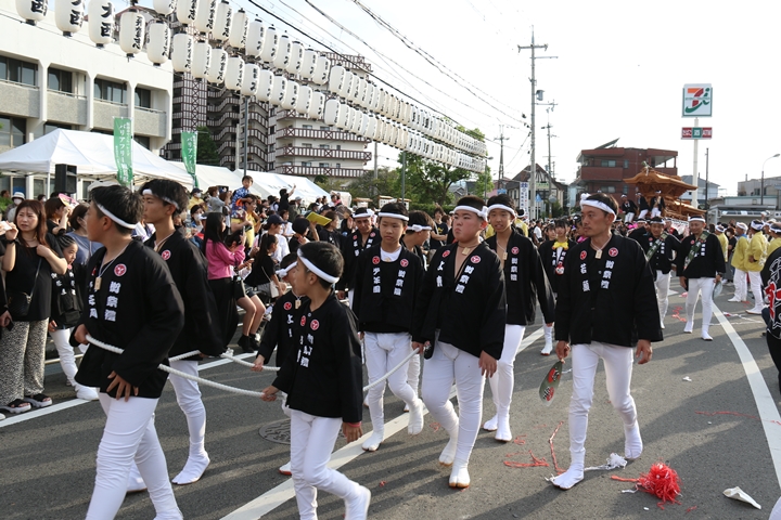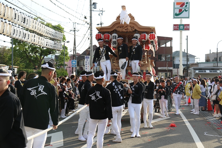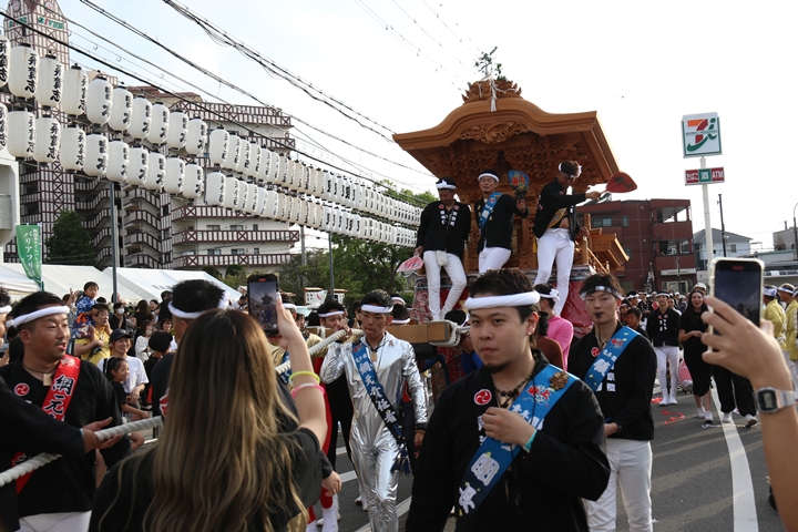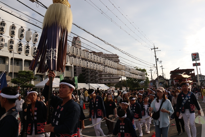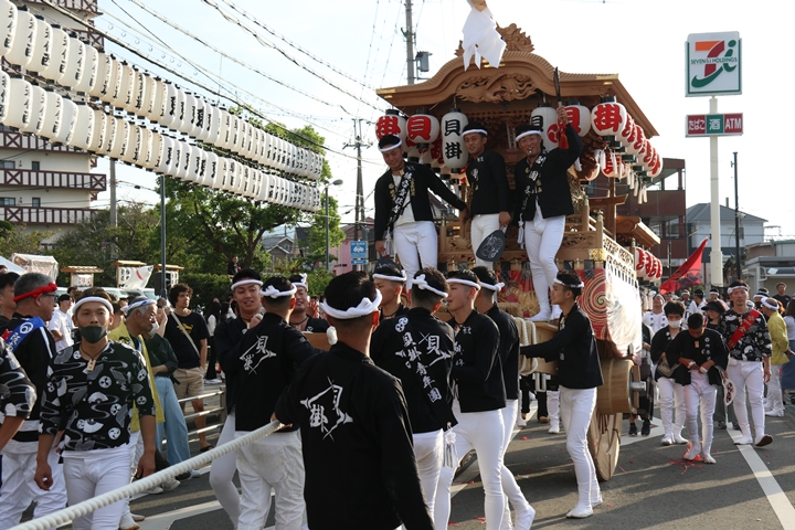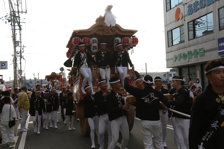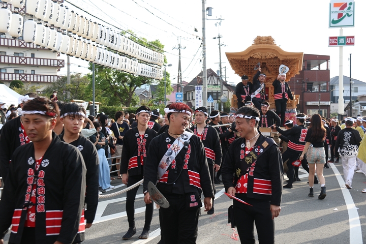 ![]() 貝掛のやぐらと一緒にパレードコースへ移動します。 |