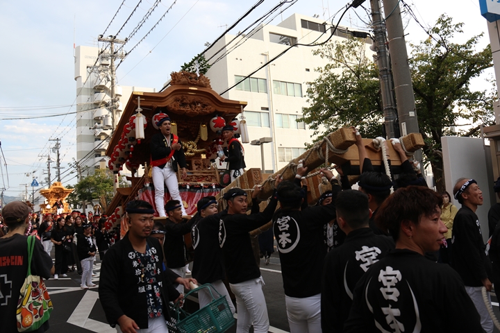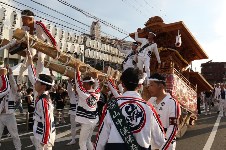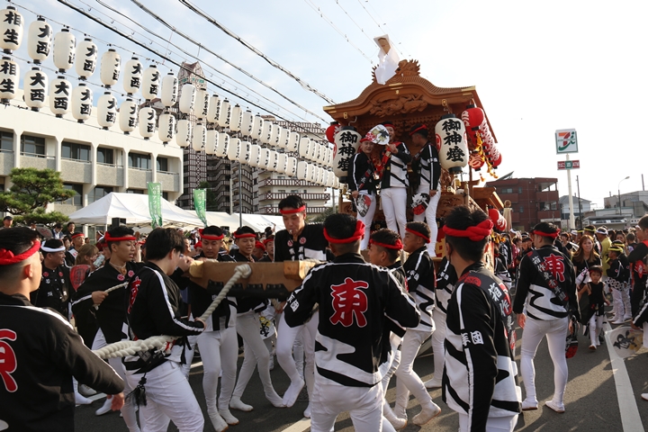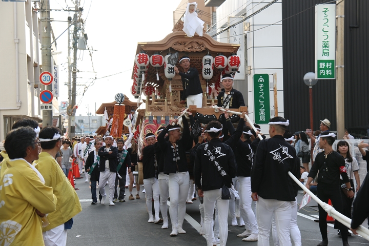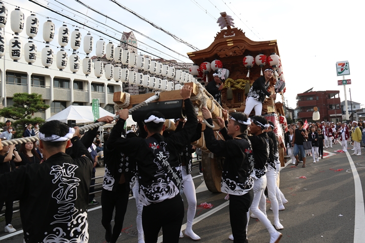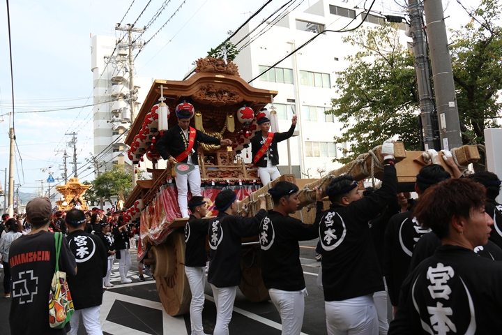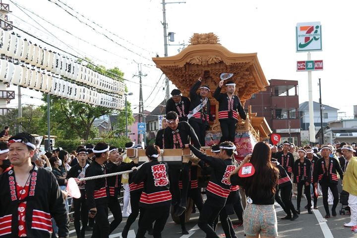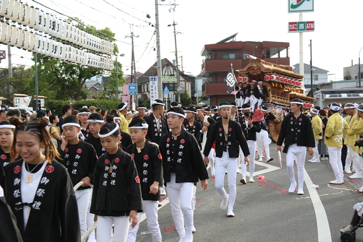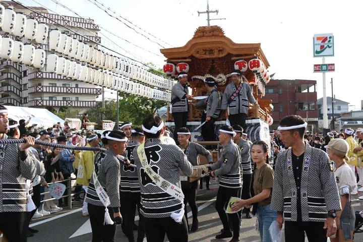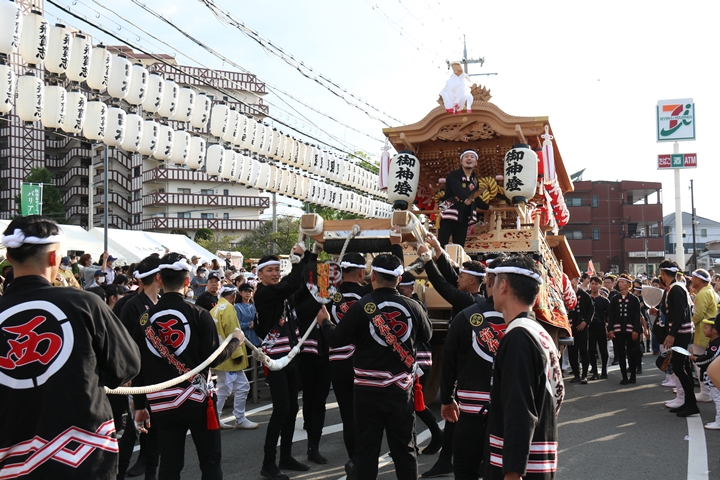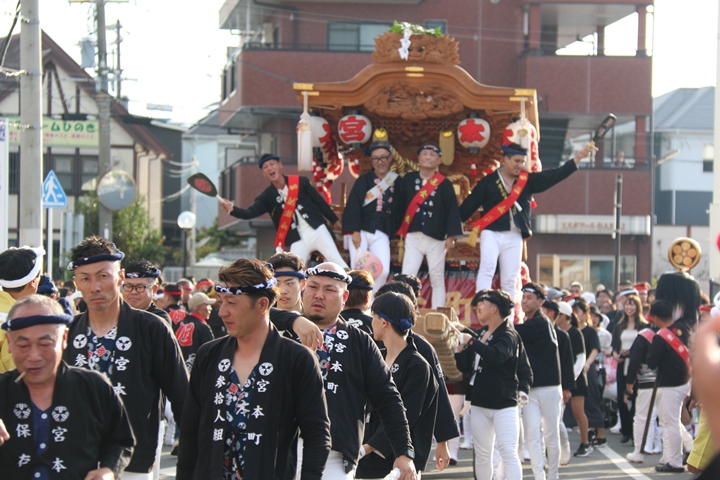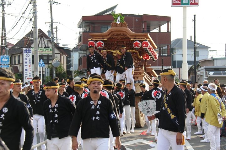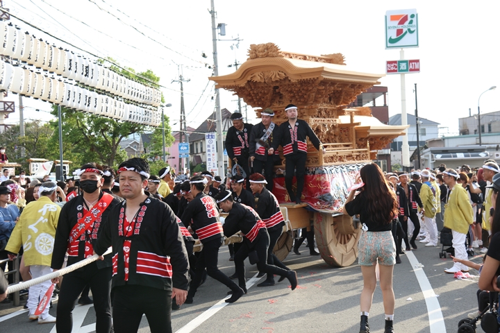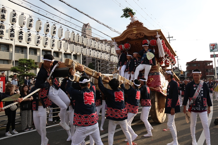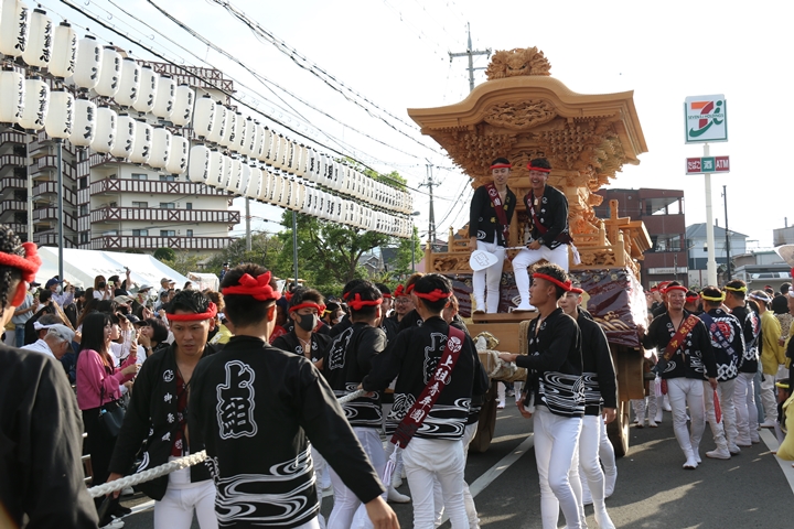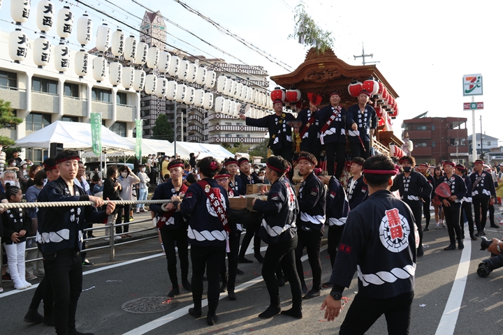 ![]() 貝掛のやぐらと一緒にパレードコースへ移動します。 |
