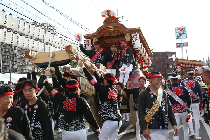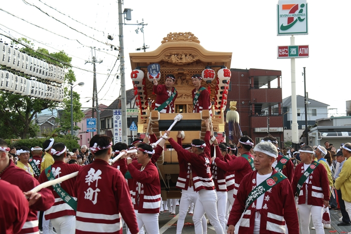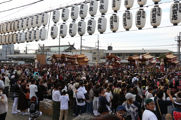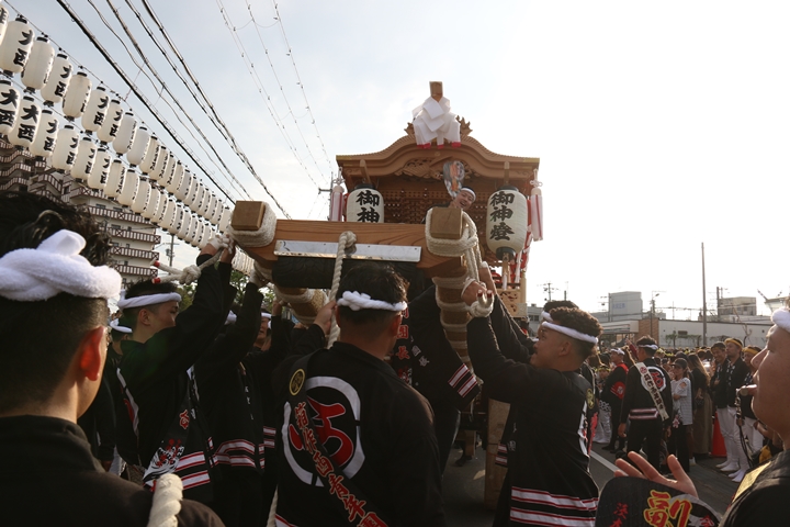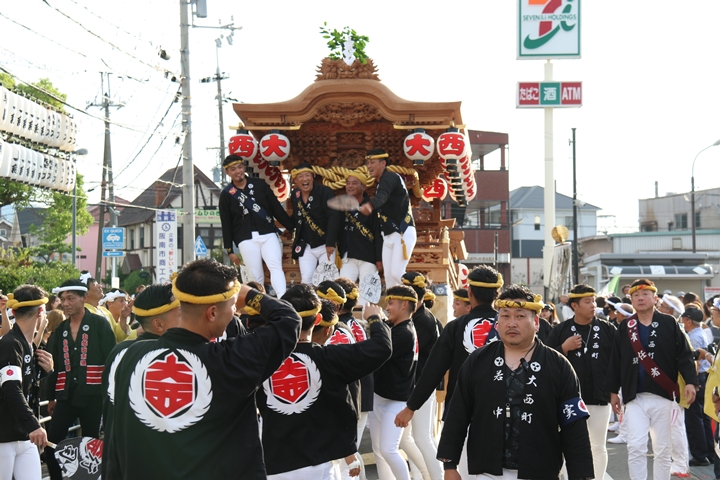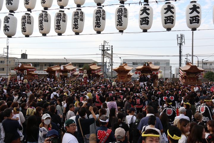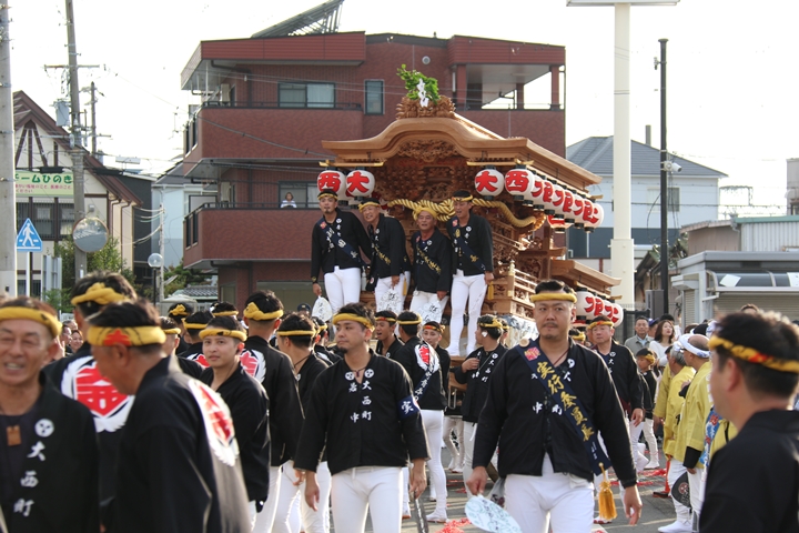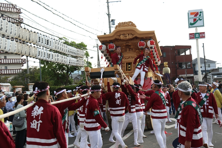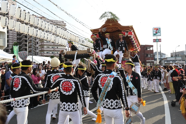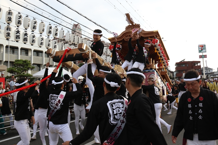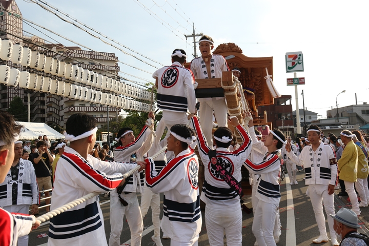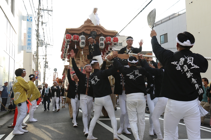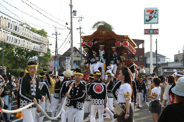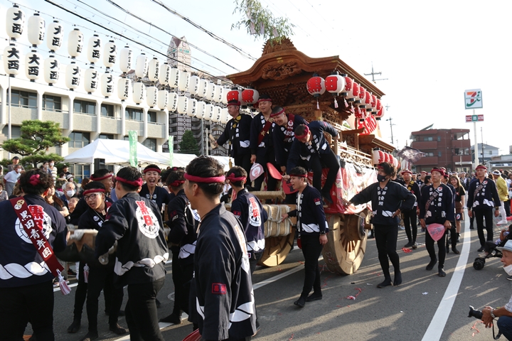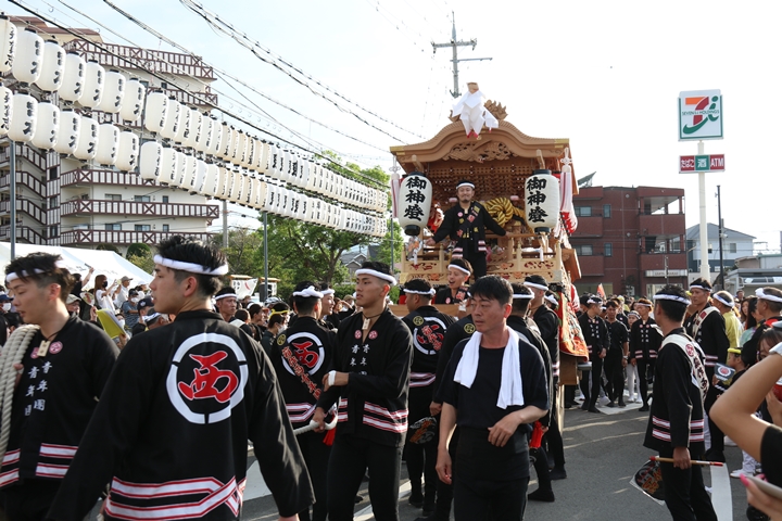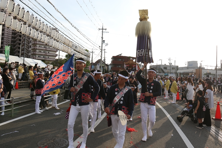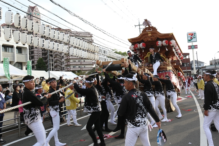 ![]() 貝掛のやぐらと一緒にパレードコースへ移動します。 |