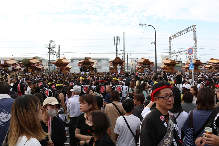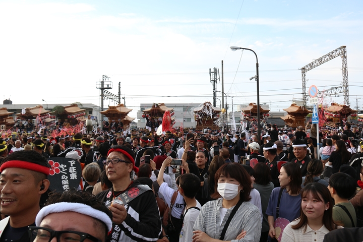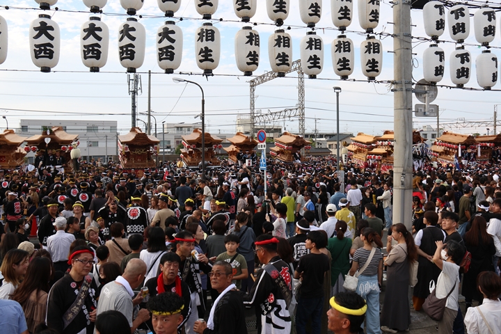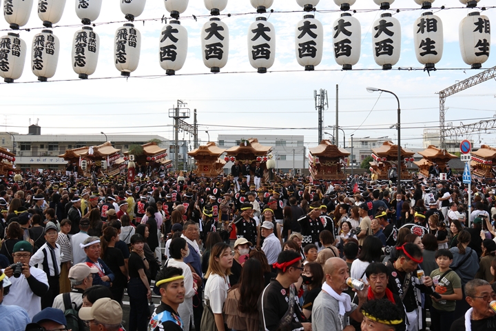阪南市役所前に19台のやぐらが揃いました。 |