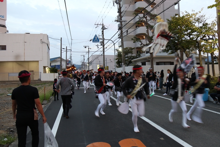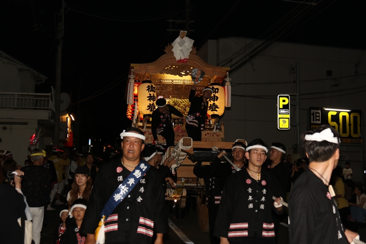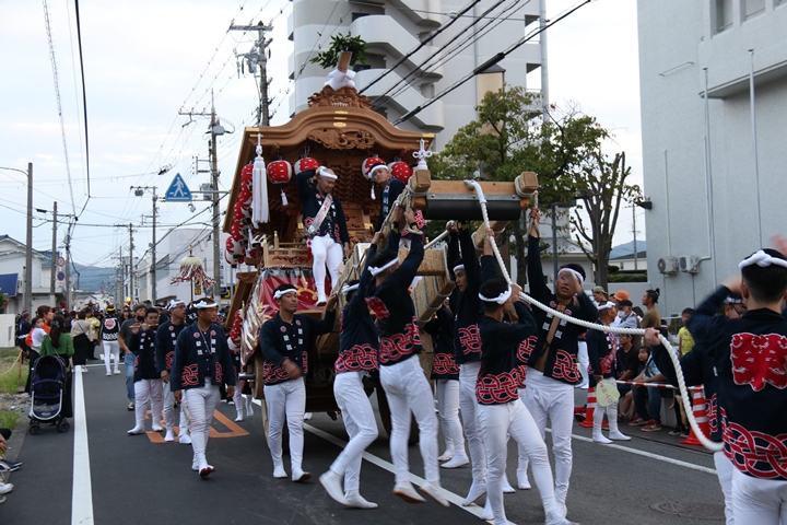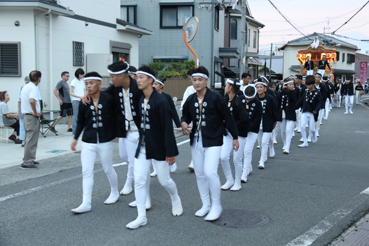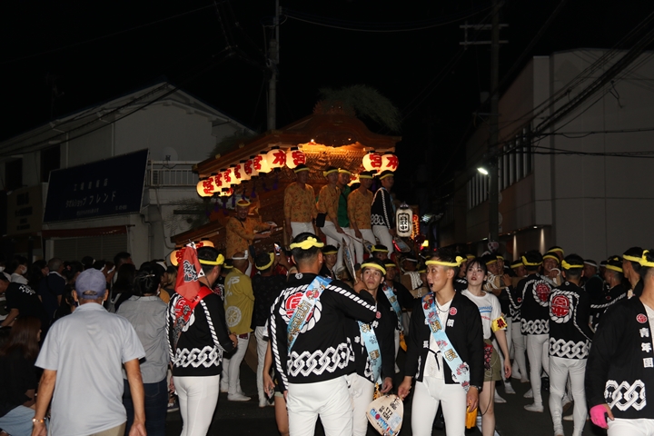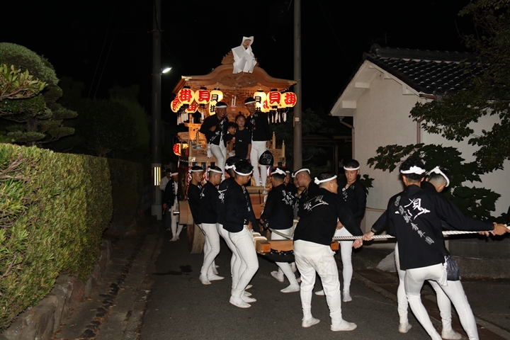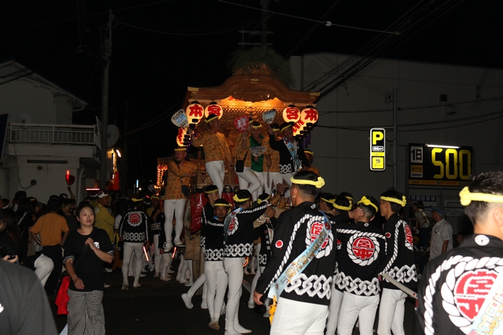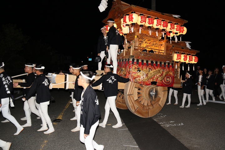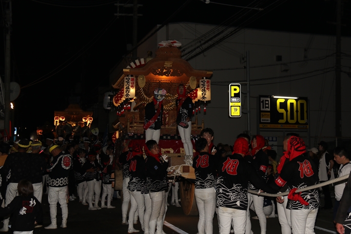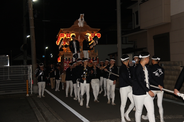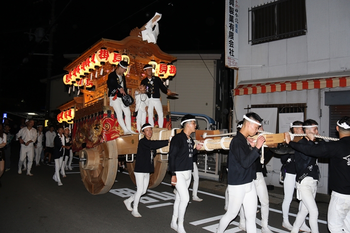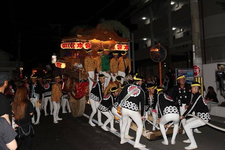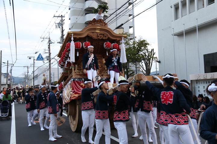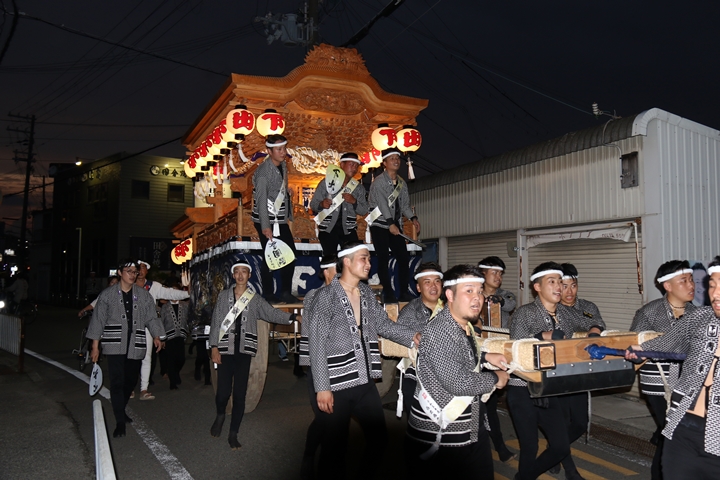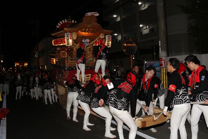 | ◎ 自町やぐら曳行の記録 指出森神社 → (村中2周) → 指出森神社(箱作東,箱作西と合流) → 旧武輪駐車場付近交差点(順番入替え) → 鳥取ノ荘駅南改札前(波有手組と合流) → お好み焼き竹前(榮組,新町と合流) → 阪南市役所前(開会式) → マンダイ前コース → マンダイ前コース → 田中外科前コース → マンダイ前コース → マンダイ前コース → 阪南消防署付近(箱作東,箱作西と合流) → 鳥取ノ荘駅南改札前 → タクミ技研前(箱作東,箱作西と離散) → 指出森神社 |