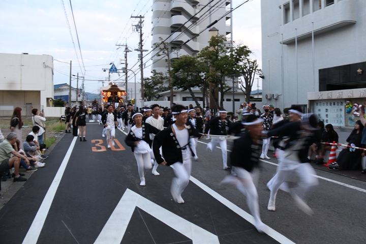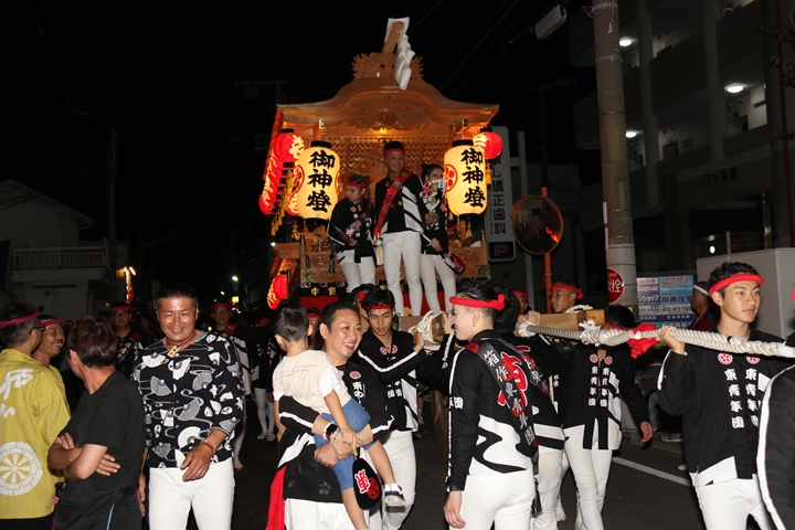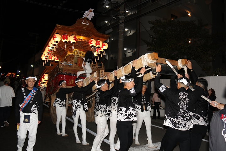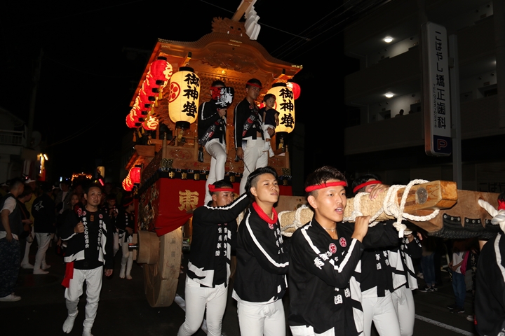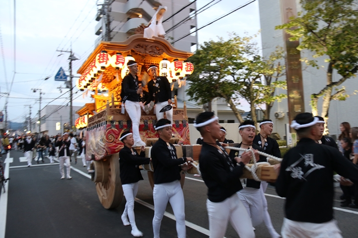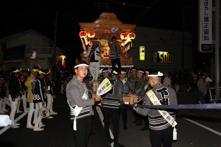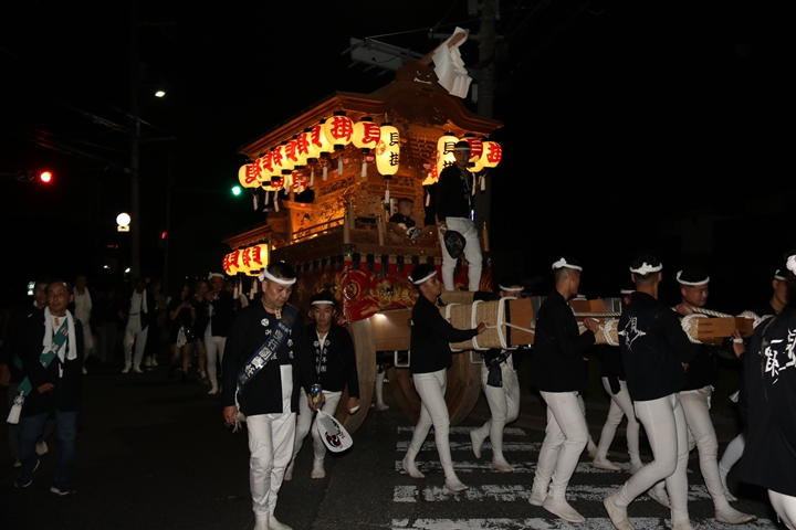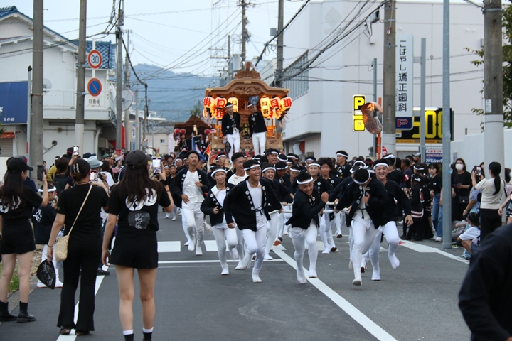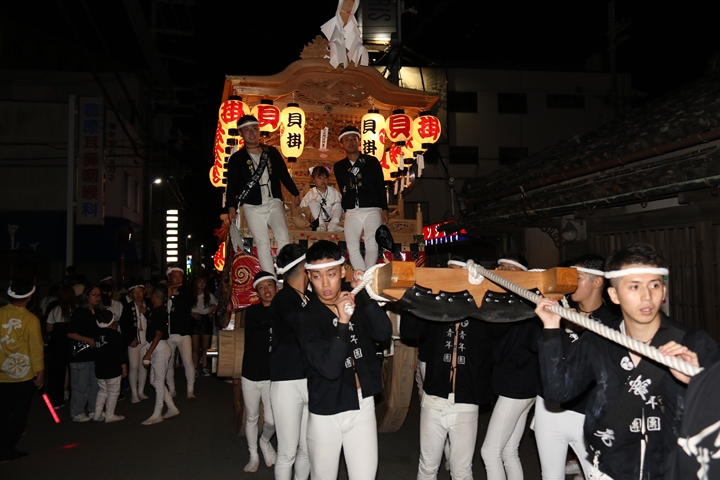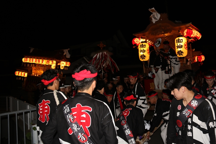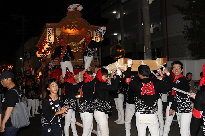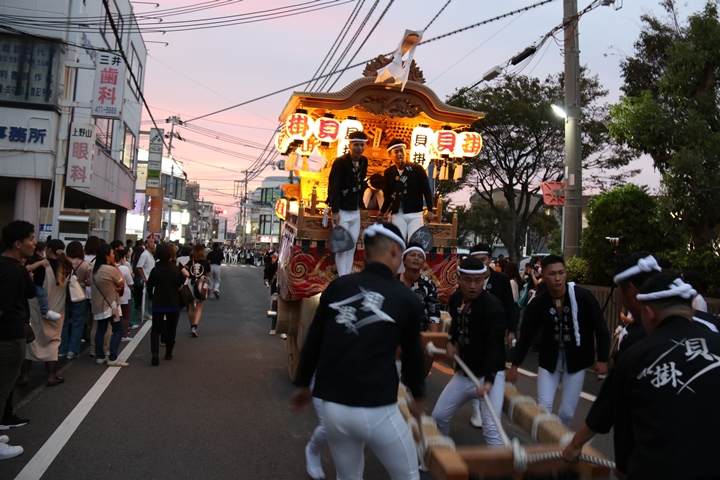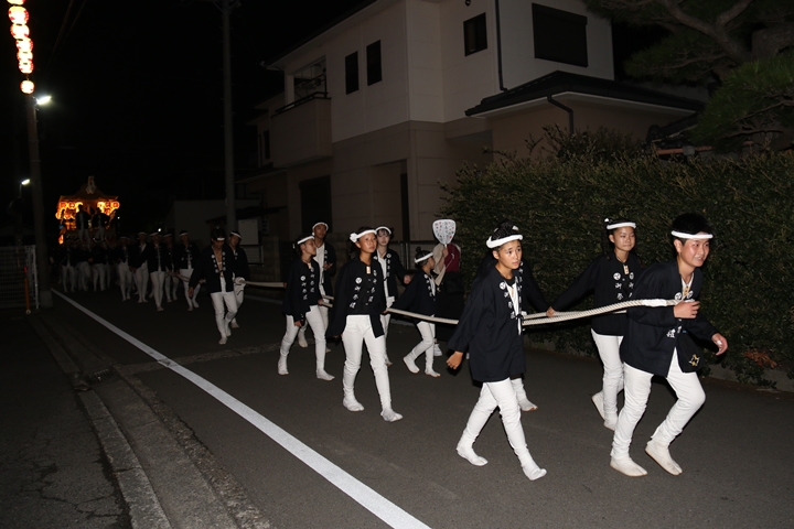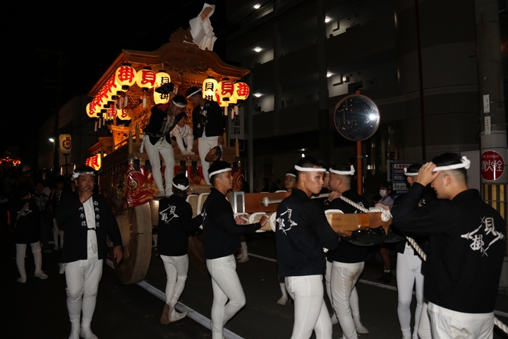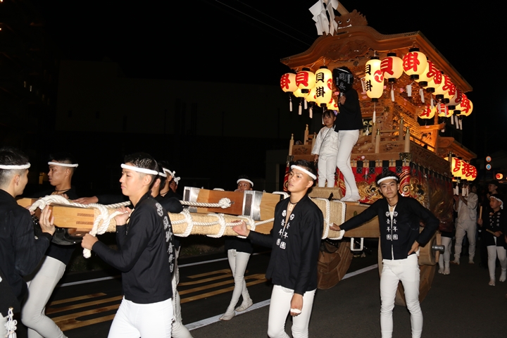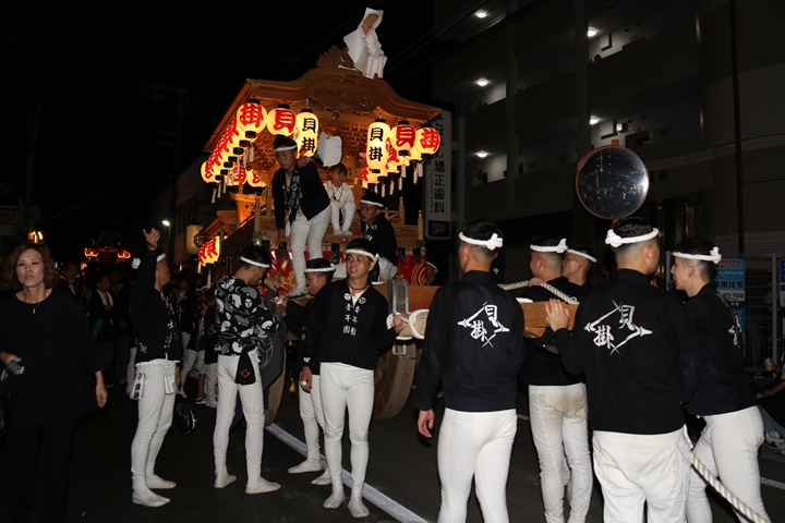 | ◎ 自町やぐら曳行の記録 指出森神社 → (村中2周) → 指出森神社(箱作東,箱作西と合流) → 旧武輪駐車場付近交差点(順番入替え) → 鳥取ノ荘駅南改札前(波有手組と合流) → お好み焼き竹前(榮組,新町と合流) → 阪南市役所前(開会式) → マンダイ前コース → マンダイ前コース → 田中外科前コース → マンダイ前コース → マンダイ前コース → 阪南消防署付近(箱作東,箱作西と合流) → 鳥取ノ荘駅南改札前 → タクミ技研前(箱作東,箱作西と離散) → 指出森神社 |