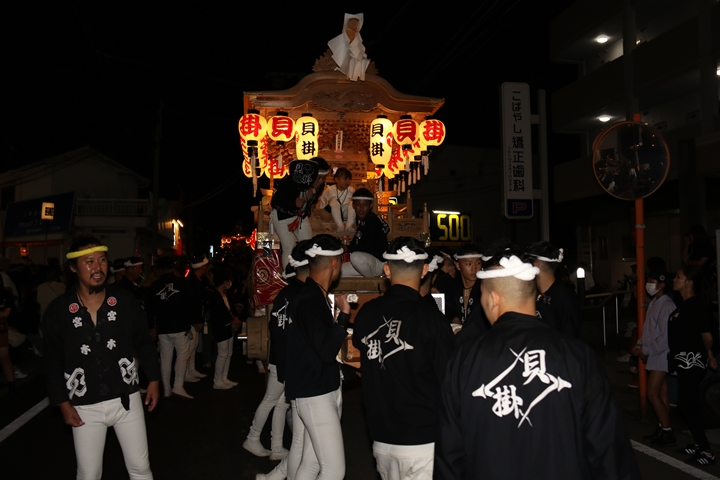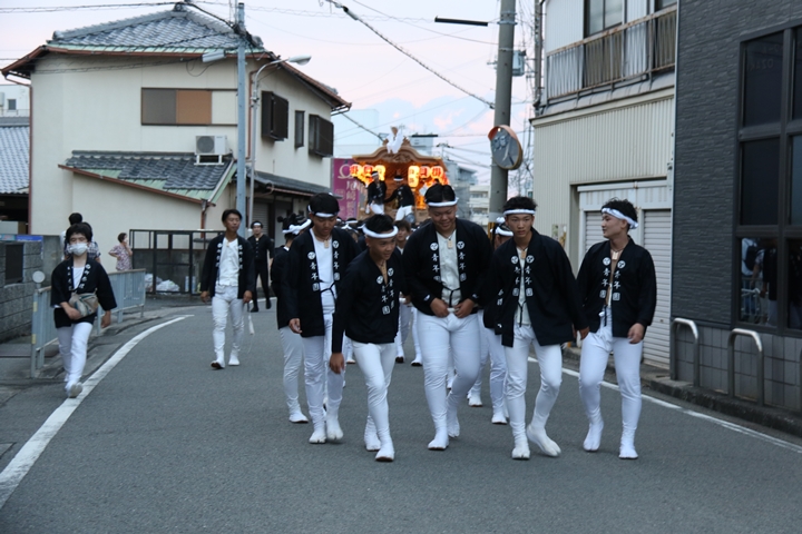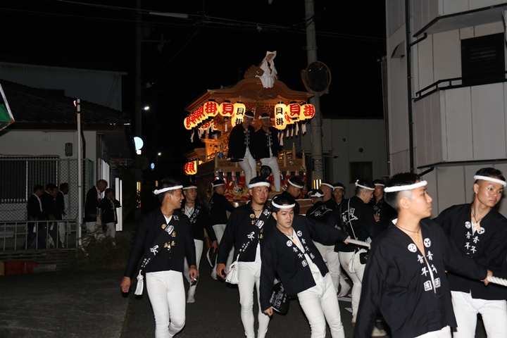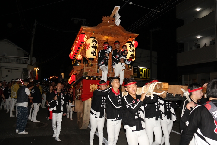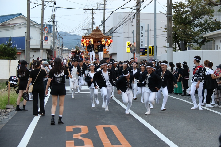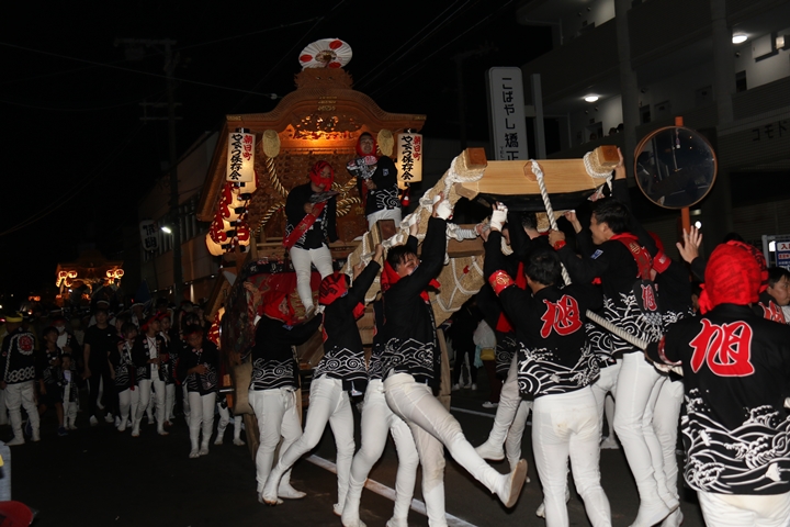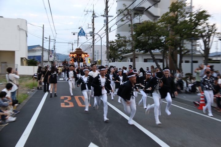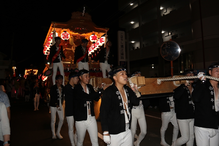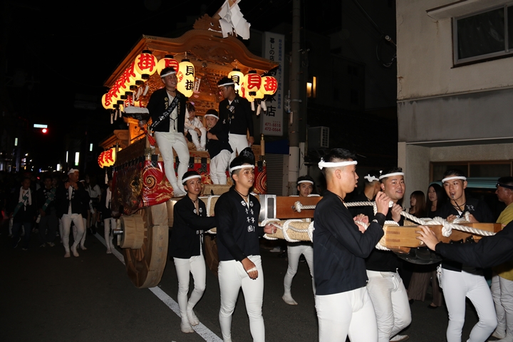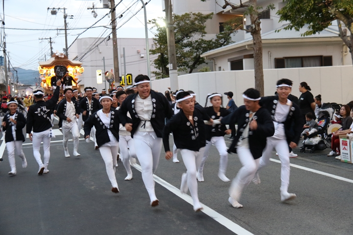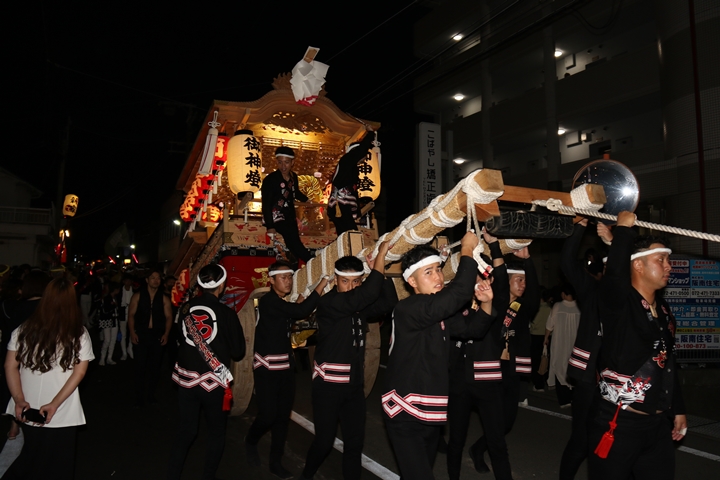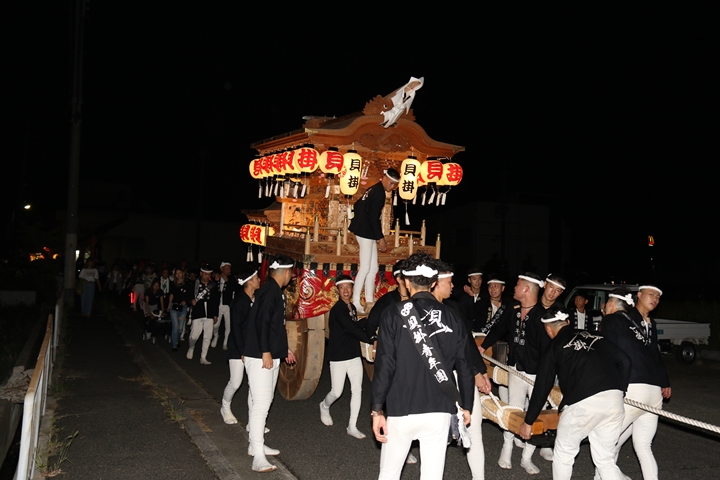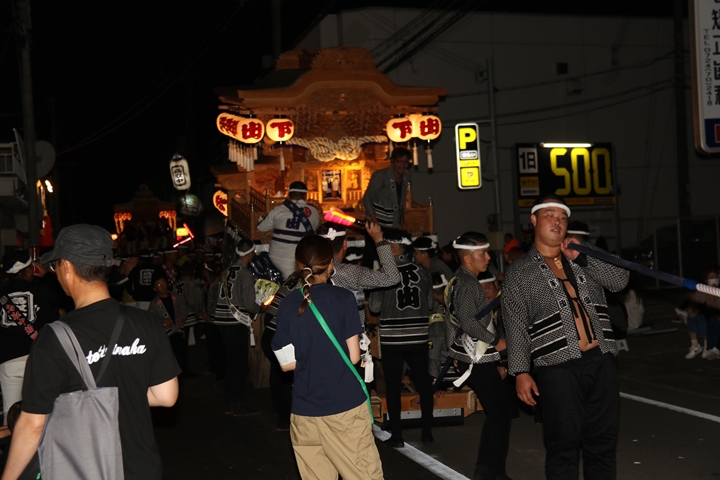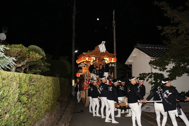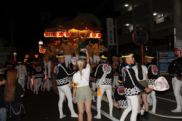 | ◎ 自町やぐら曳行の記録 指出森神社 → (村中2周) → 指出森神社(箱作東,箱作西と合流) → 旧武輪駐車場付近交差点(順番入替え) → 鳥取ノ荘駅南改札前(波有手組と合流) → お好み焼き竹前(榮組,新町と合流) → 阪南市役所前(開会式) → マンダイ前コース → マンダイ前コース → 田中外科前コース → マンダイ前コース → マンダイ前コース → 阪南消防署付近(箱作東,箱作西と合流) → 鳥取ノ荘駅南改札前 → タクミ技研前(箱作東,箱作西と離散) → 指出森神社 |