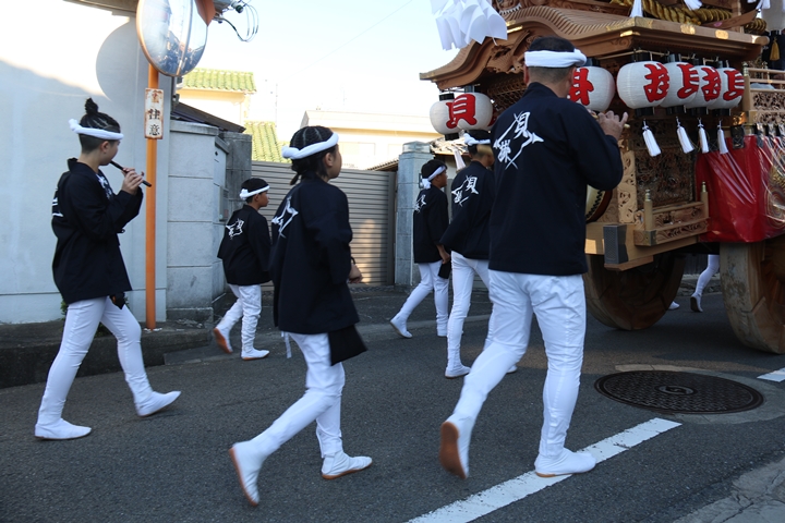 ![]() 7時30分、役員の挨拶を終え曳行開始。 |