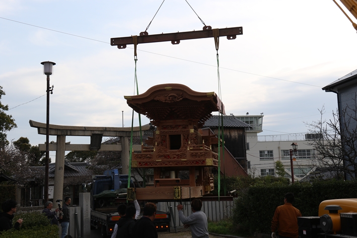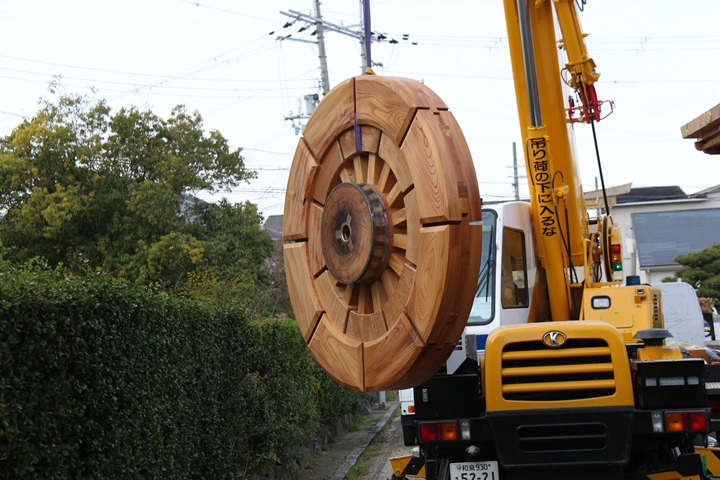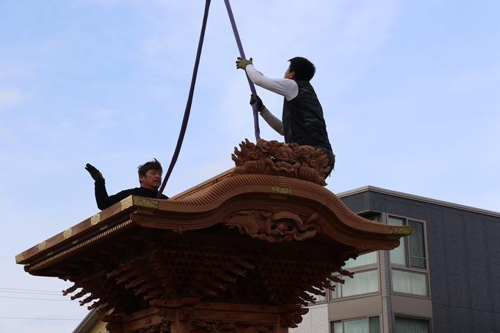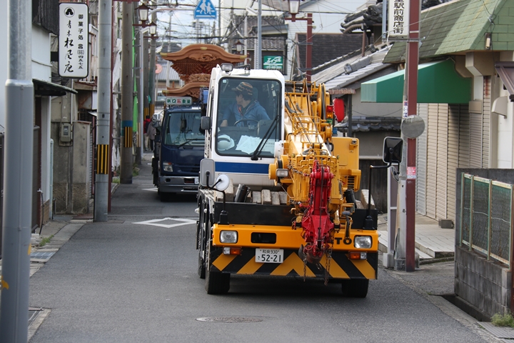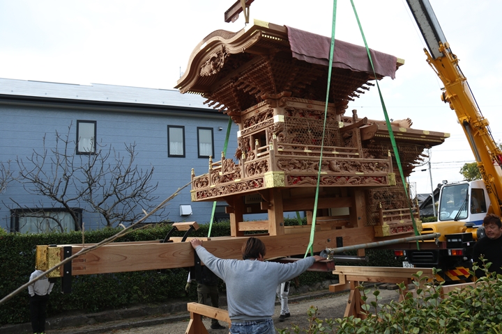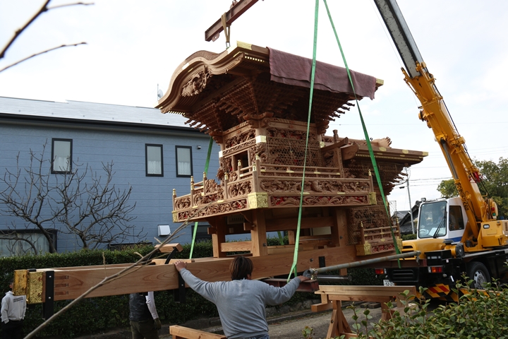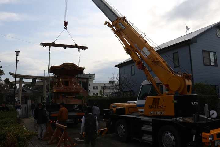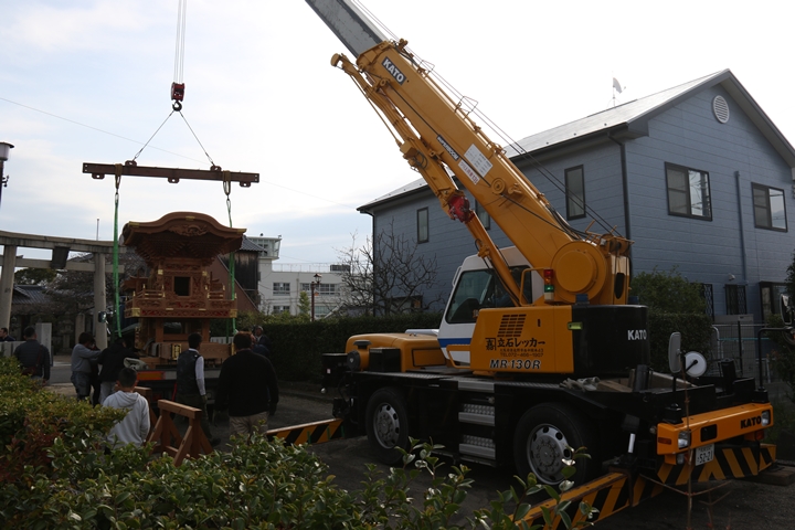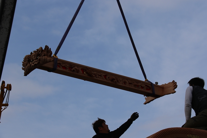 ![]() まずはクレーンでやぐら本体を吊り上げます。 |