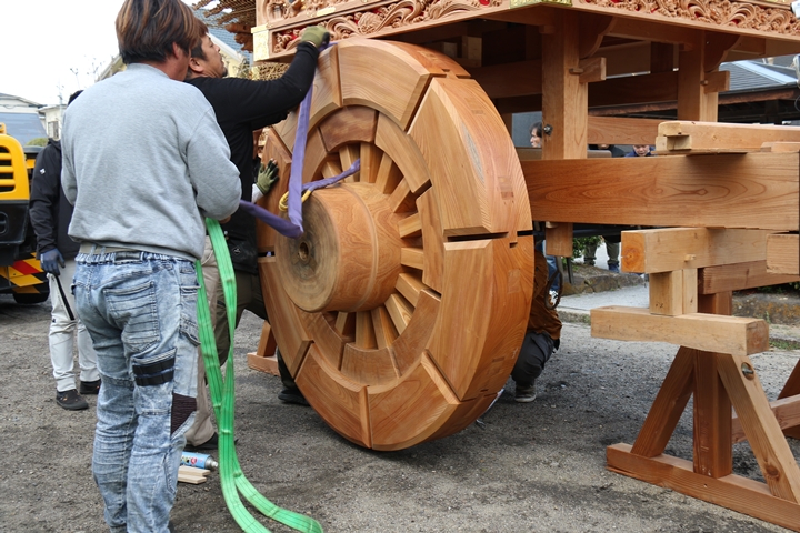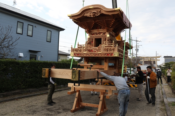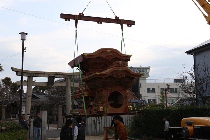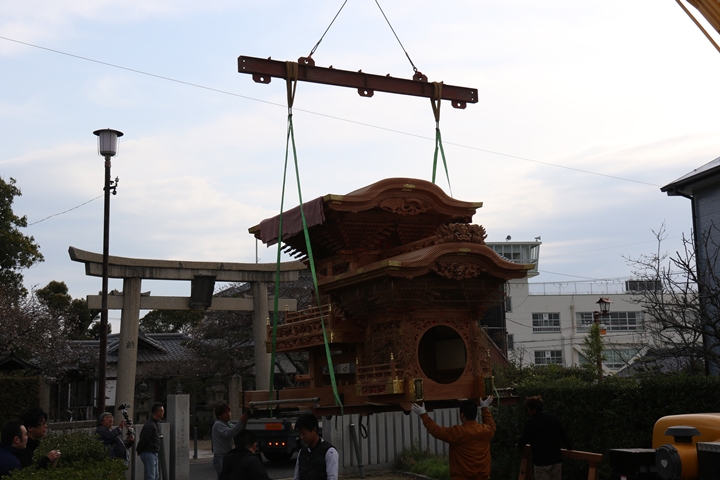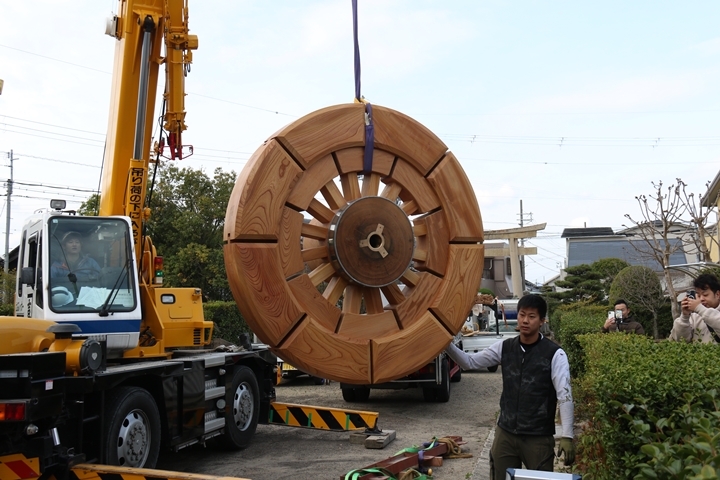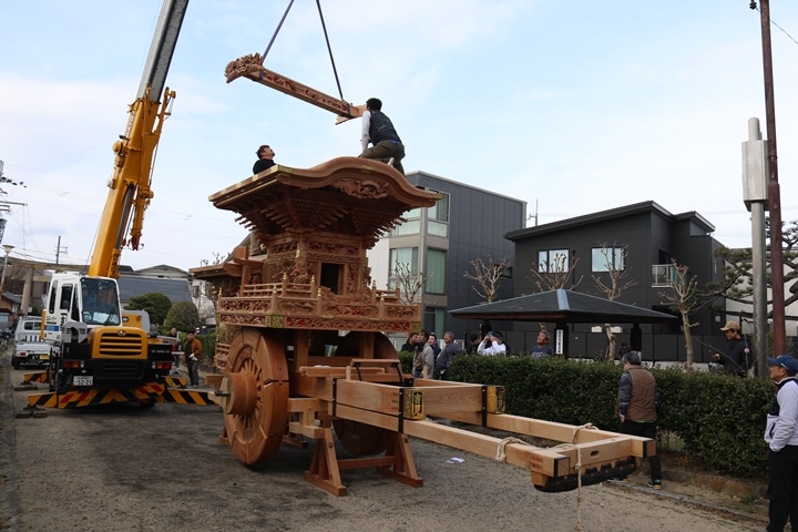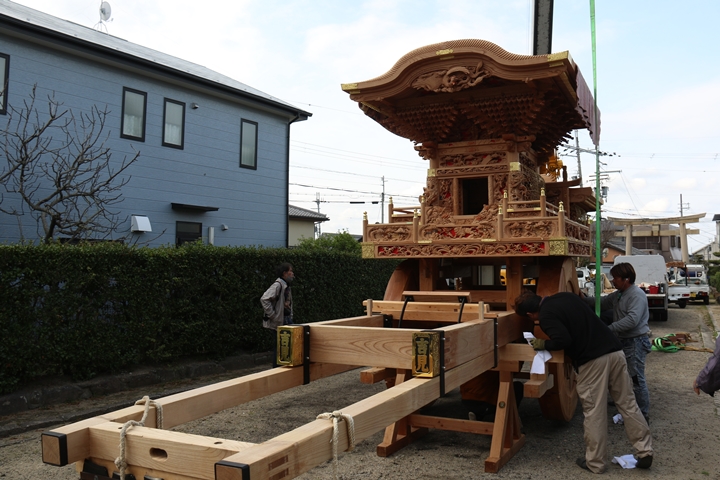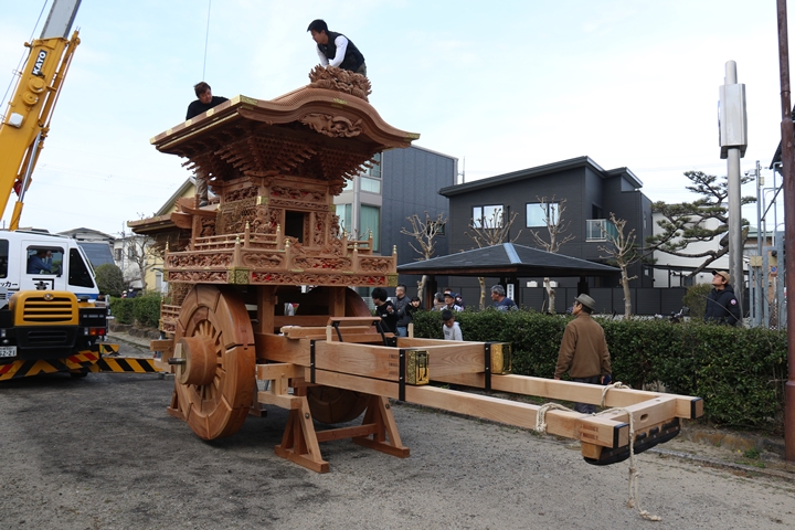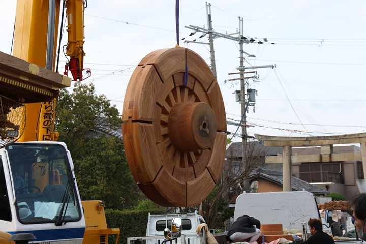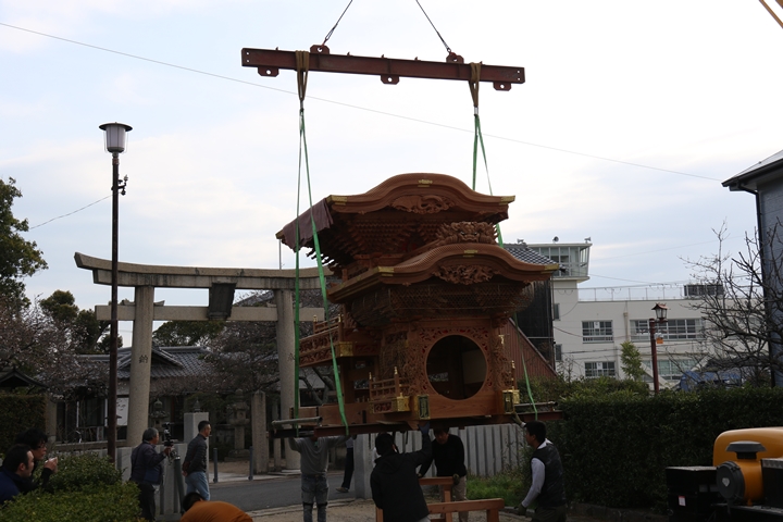 ![]() まずはクレーンでやぐら本体を吊り上げます。 |