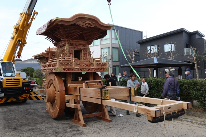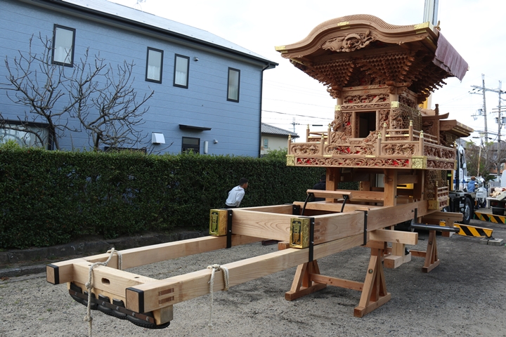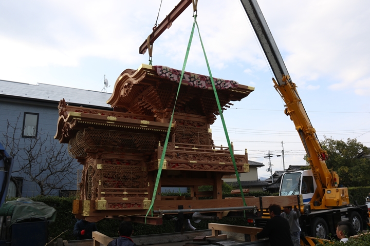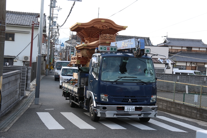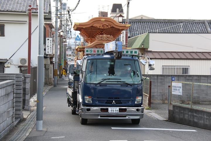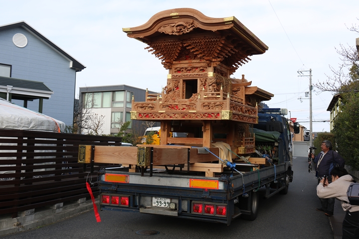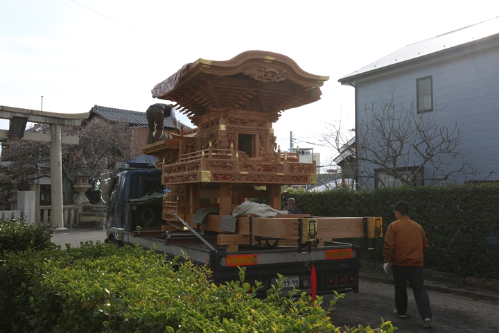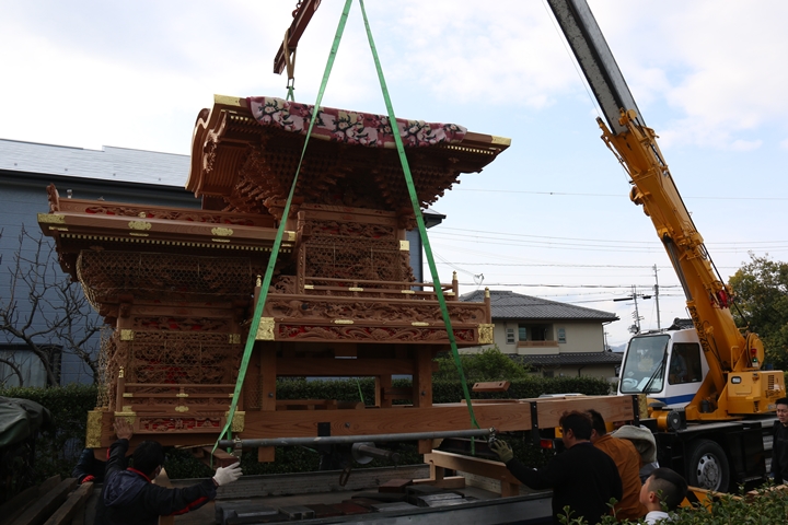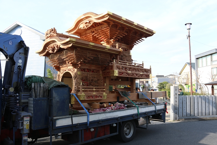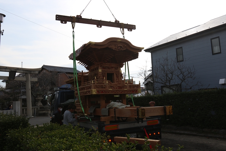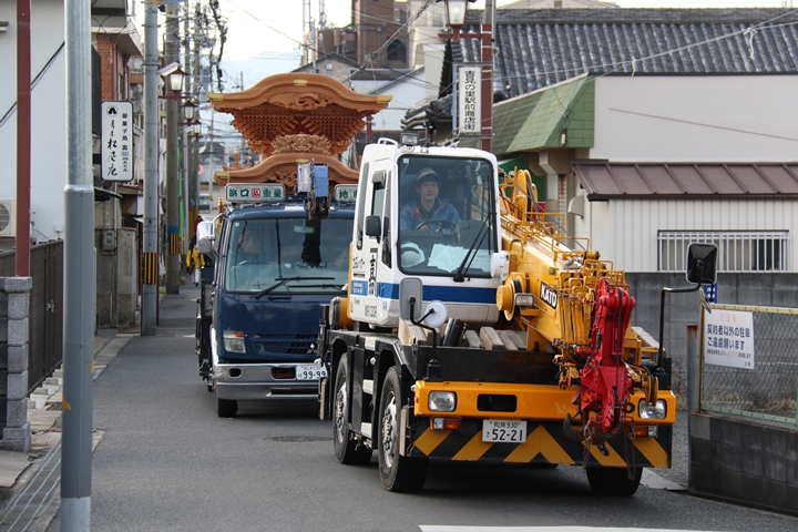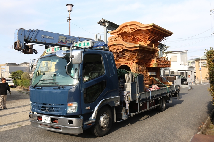 | 昨年11月17日日曜日に大真工務店へ搬出された吉見のやぐらが帰町するとの情報を得、行ってきました。8時頃に帰町するとの事だったので7時過ぎに自宅を出発しました |
