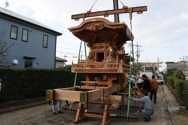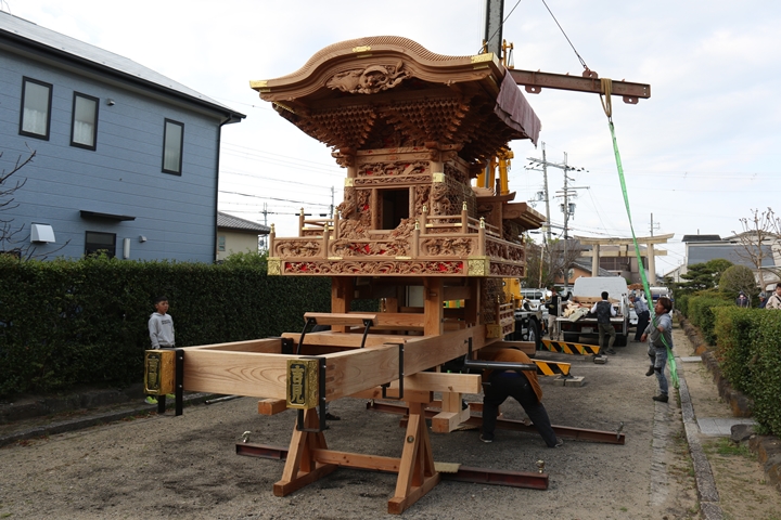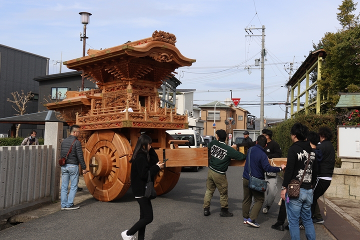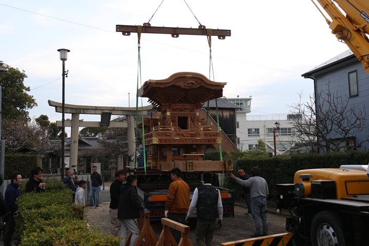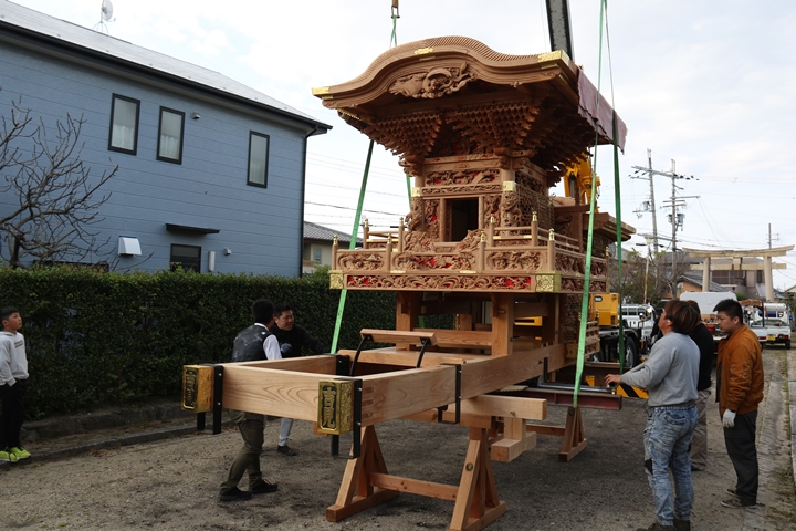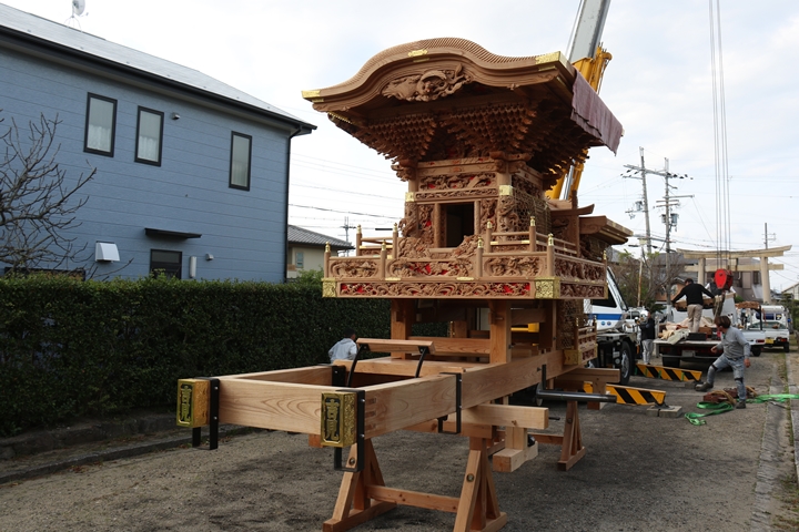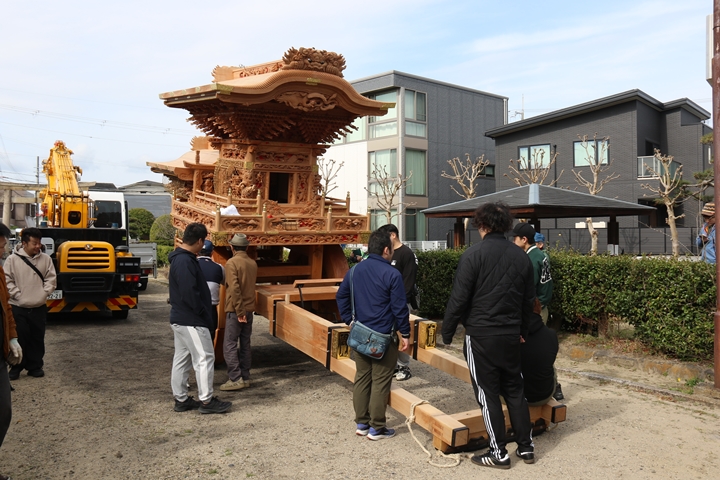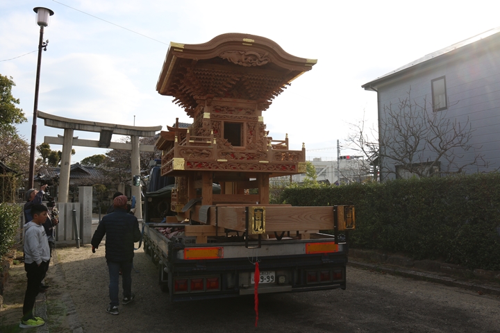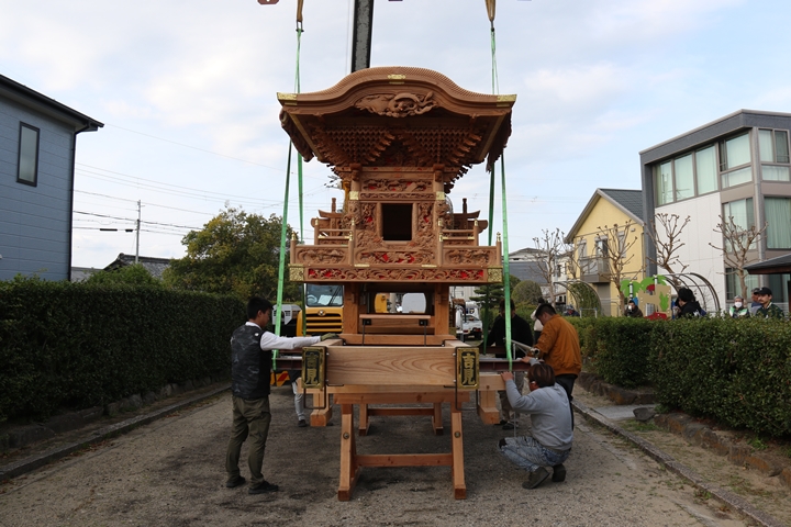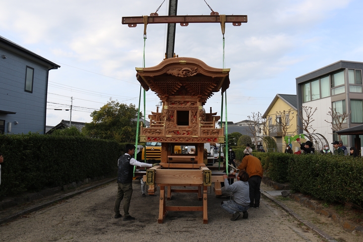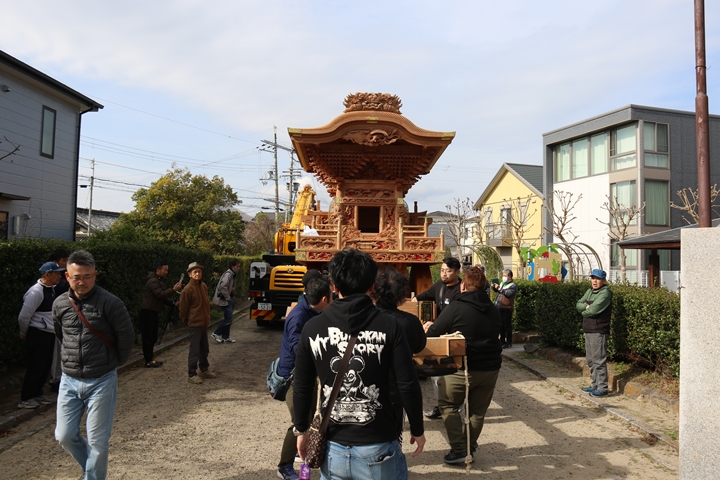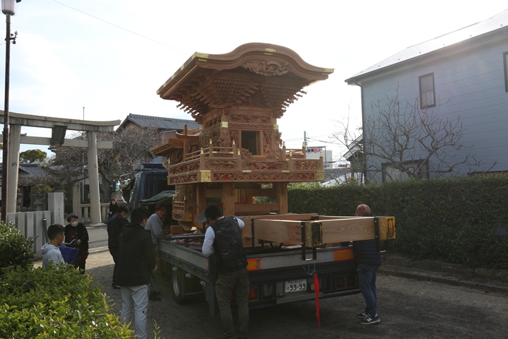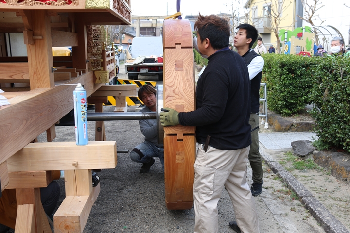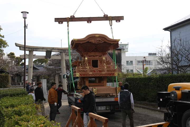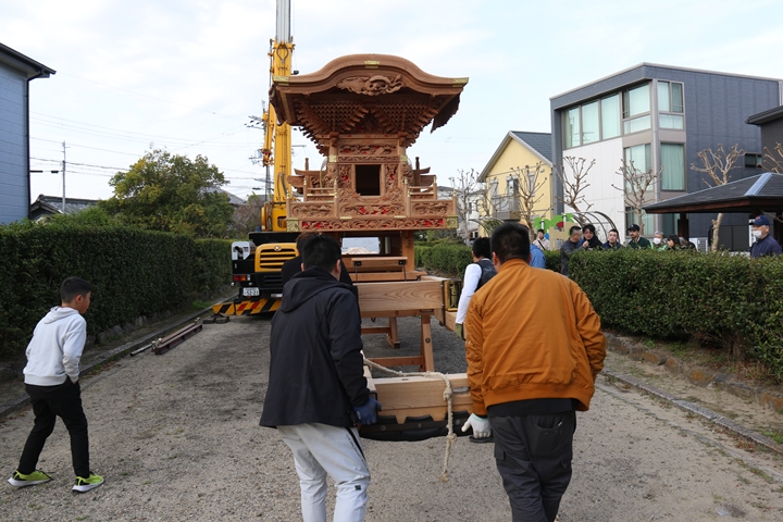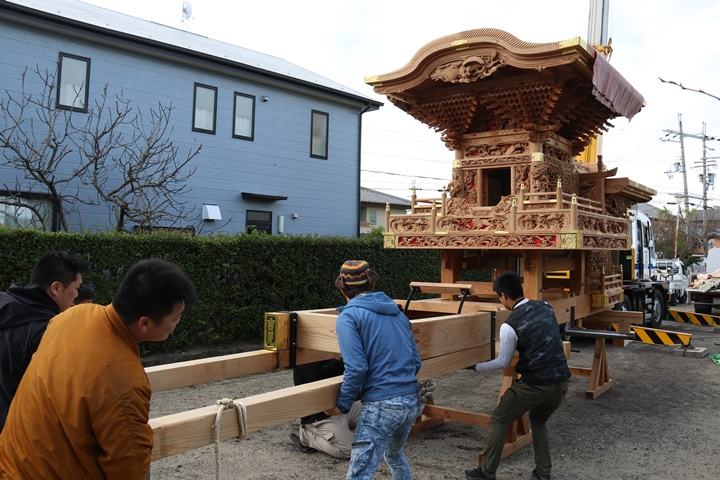![]() 春日神社前の公園にて搬入作業を行います。 |
