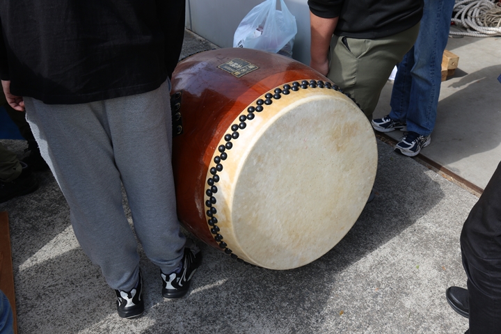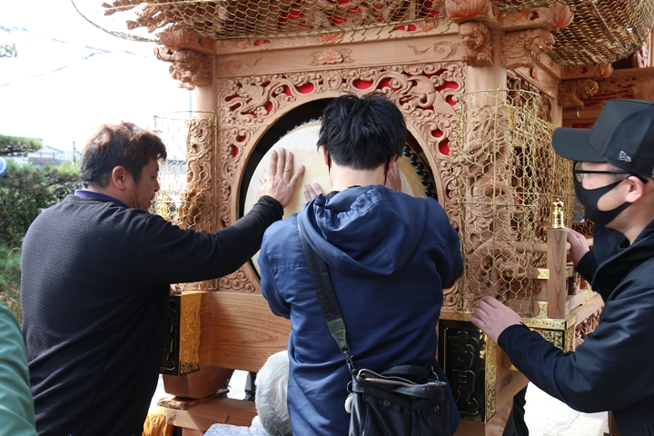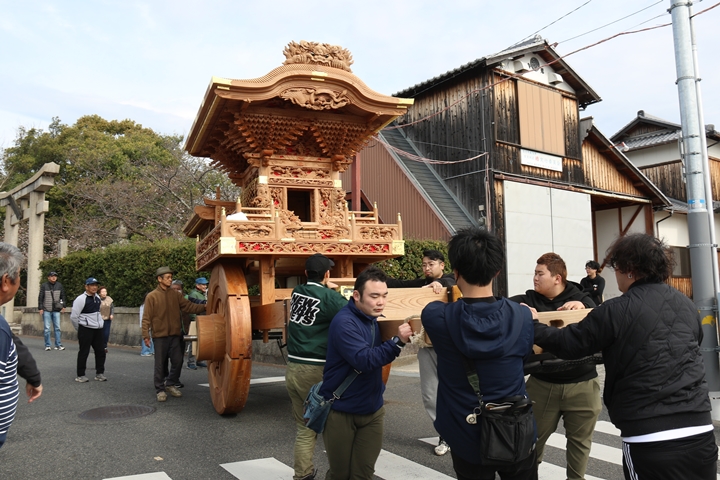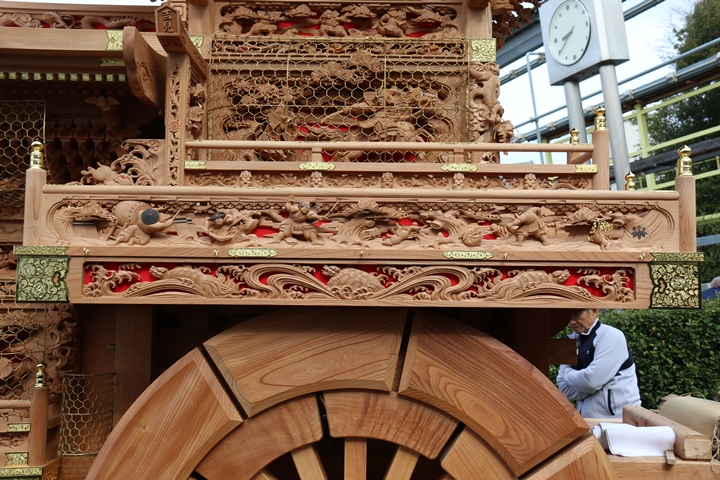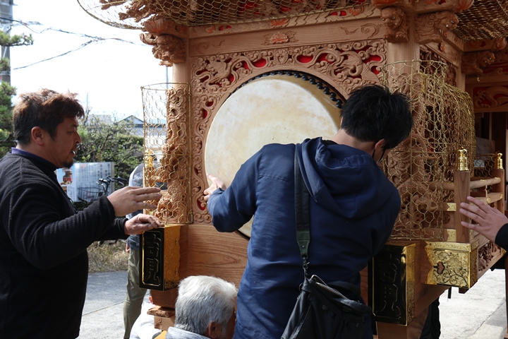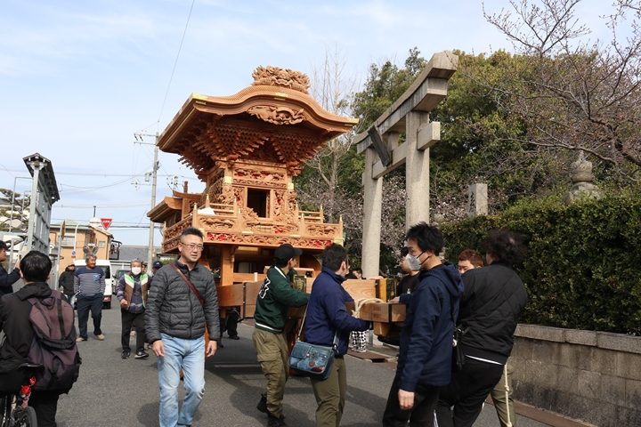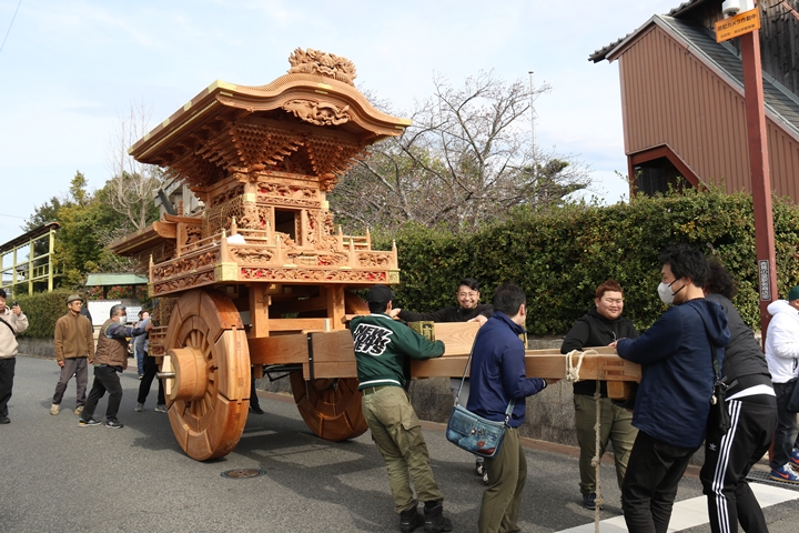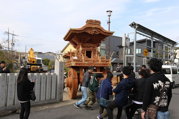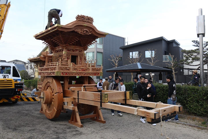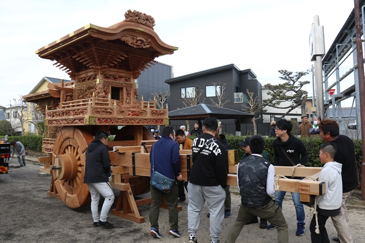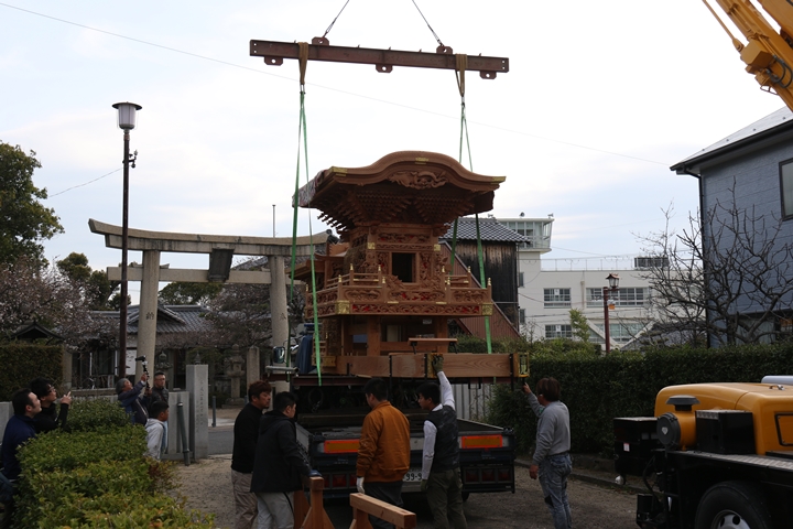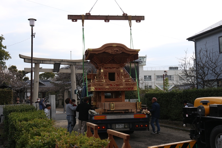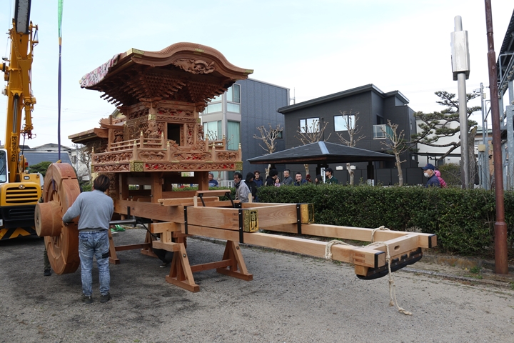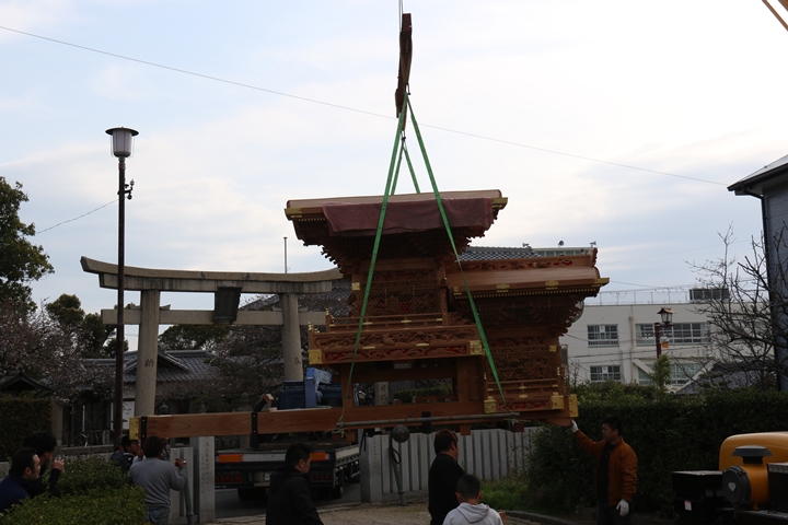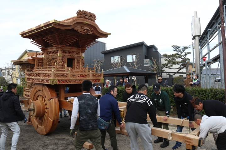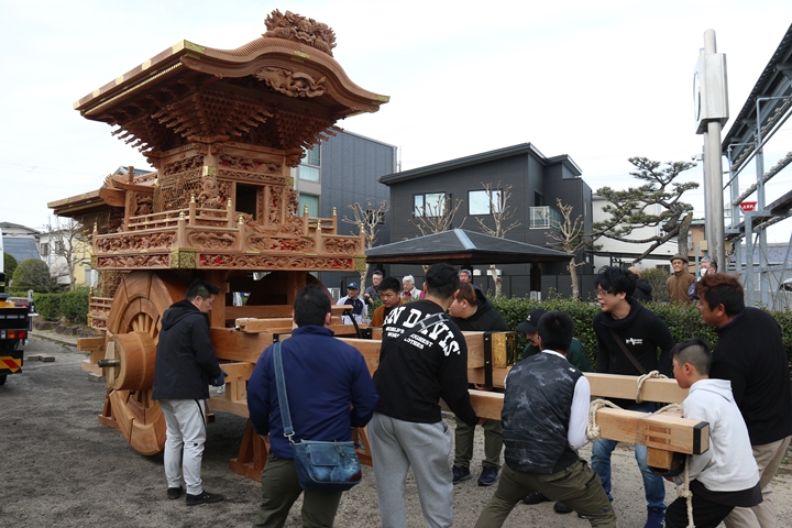 ![]() 春日神社前の公園にて搬入作業を行います。 |